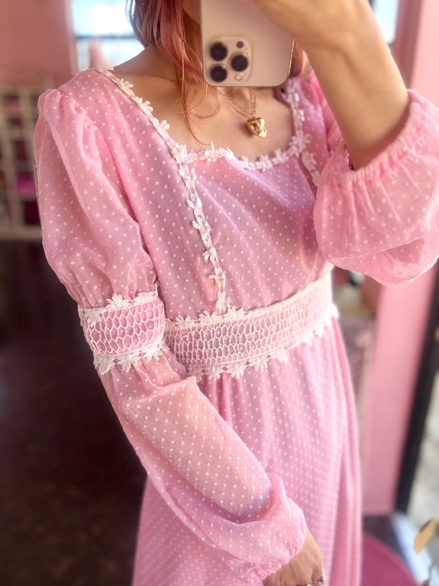 70s Claire Brooke originalのピンク×ホワイトドレス♡袖は透け感があり、袖口もレースが付いていて可愛いです♡ 裏地が付いていて一枚でも着やすいです。 カーディガンと合わせてカジュアルにも◎ サイズ表記:12 肩幅:34cm 身幅:42cm ウエスト:37cm 着丈:111cm 袖丈:51cm 素材表記:65%dacron 35%cotton ※平置き実寸サイズです。 手作業による採寸の為、若干の誤差が生じる場合がございます。 【コンディション】 袖とスカート後ろに画像のようなシミがあります(写真参照) その他目立つような汚れやほつれなどはございませんが、1点もののヴィンテージ商品の為細かい汚れ、キズなどがある場合もございますので、ご了承くださいませ。 注意事項 *送料は商品ごとに設定しておりますが、見込みと異なる場合がございます。不足分は当方の負担となりますが、超過の差額分は返金致しかねますので、ご了承の程宜しくお願い致します。 *当店で取り扱っております、Vintage,used品のコンディションチェックは十分注意を払っておりますが、Vintage特有の汚れやキズ、ヨレ、匂いなどある場合もございます。 *Vintageの特性をご理解頂いた上でのご購入をお願い致します。 *ご不明点がございましたら、ご購入前にメールフォームにて、お問い合わせ下さいますようお願いいたします。 *ご注文後の内容変更、キャンセルは一切お受けできません。掲載内容(サイズ・画像のカラー)と実際の商品との若干のズレに関しましても返品対応しかねます。 *銀行振込、コンビニ決済は、期日内にお支払いいただきますようお願い致します。