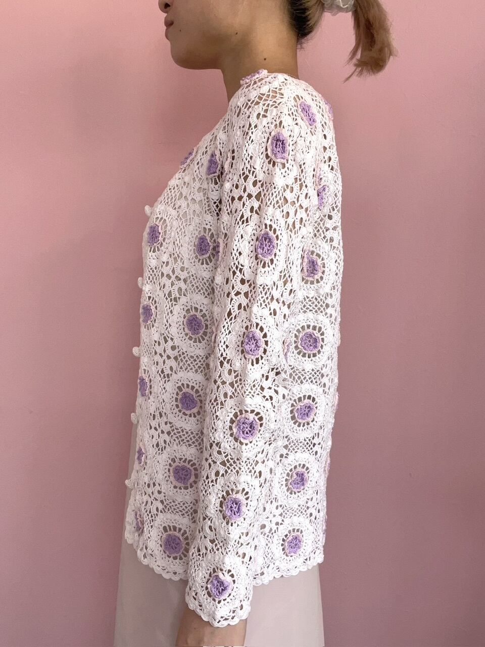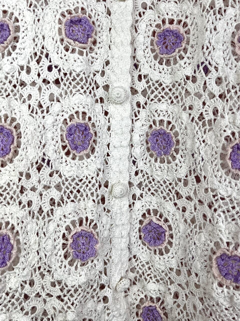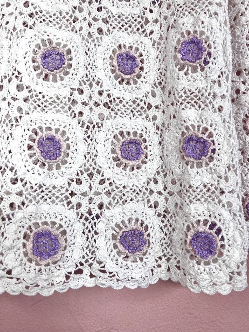 立体的なお花が細かく再現されていて、今の時代には珍しいクロシェットカーディガンです。