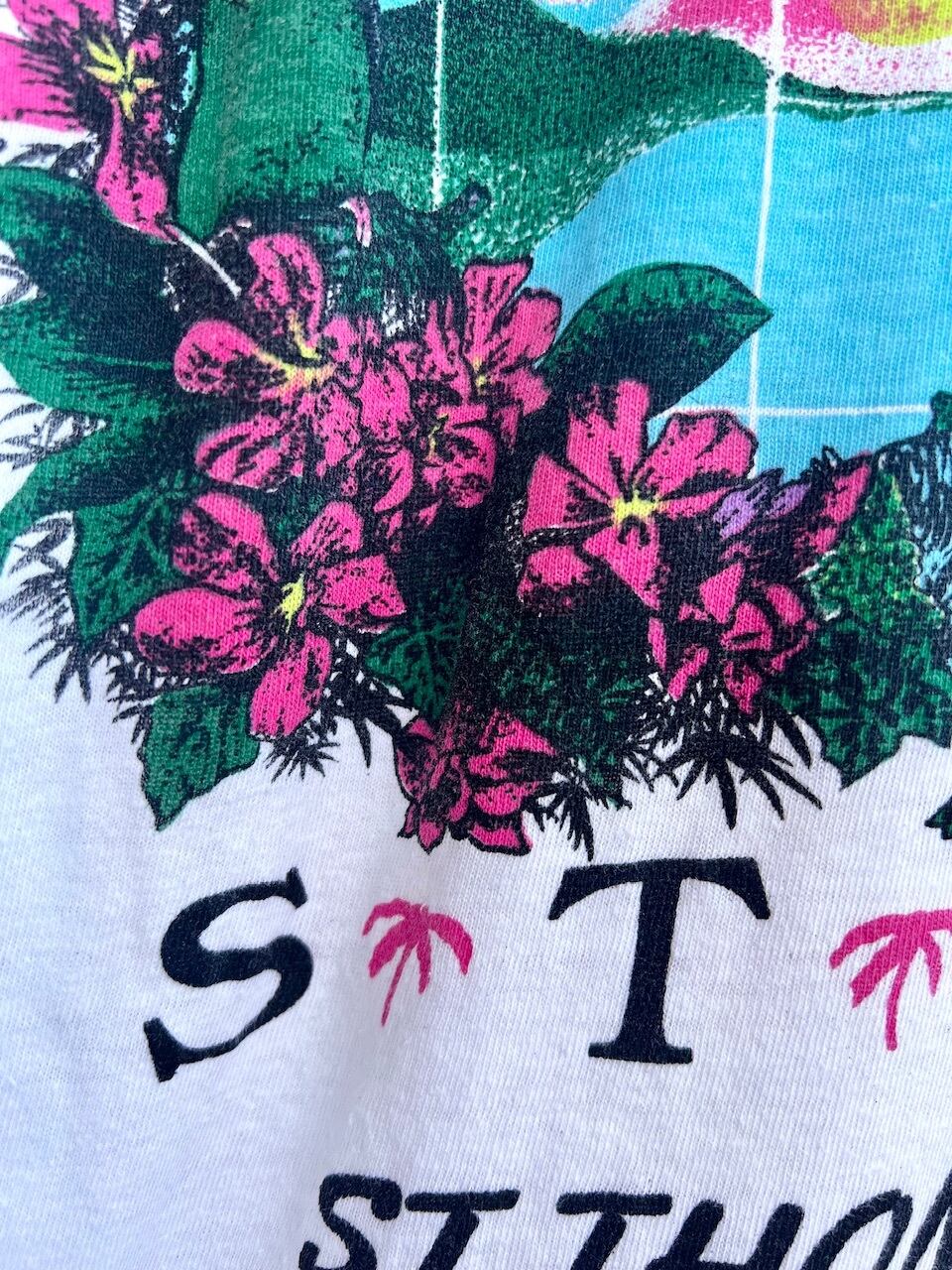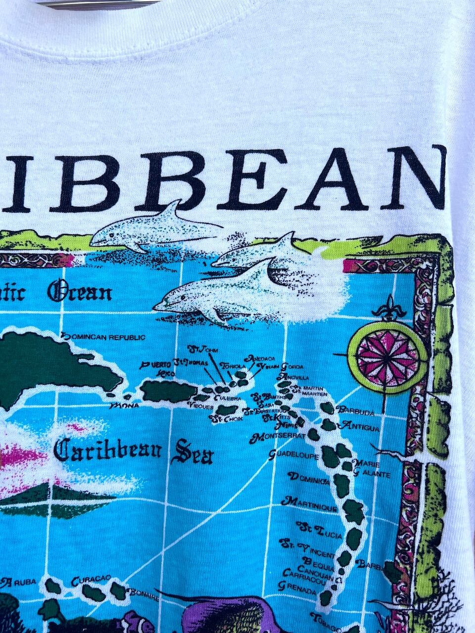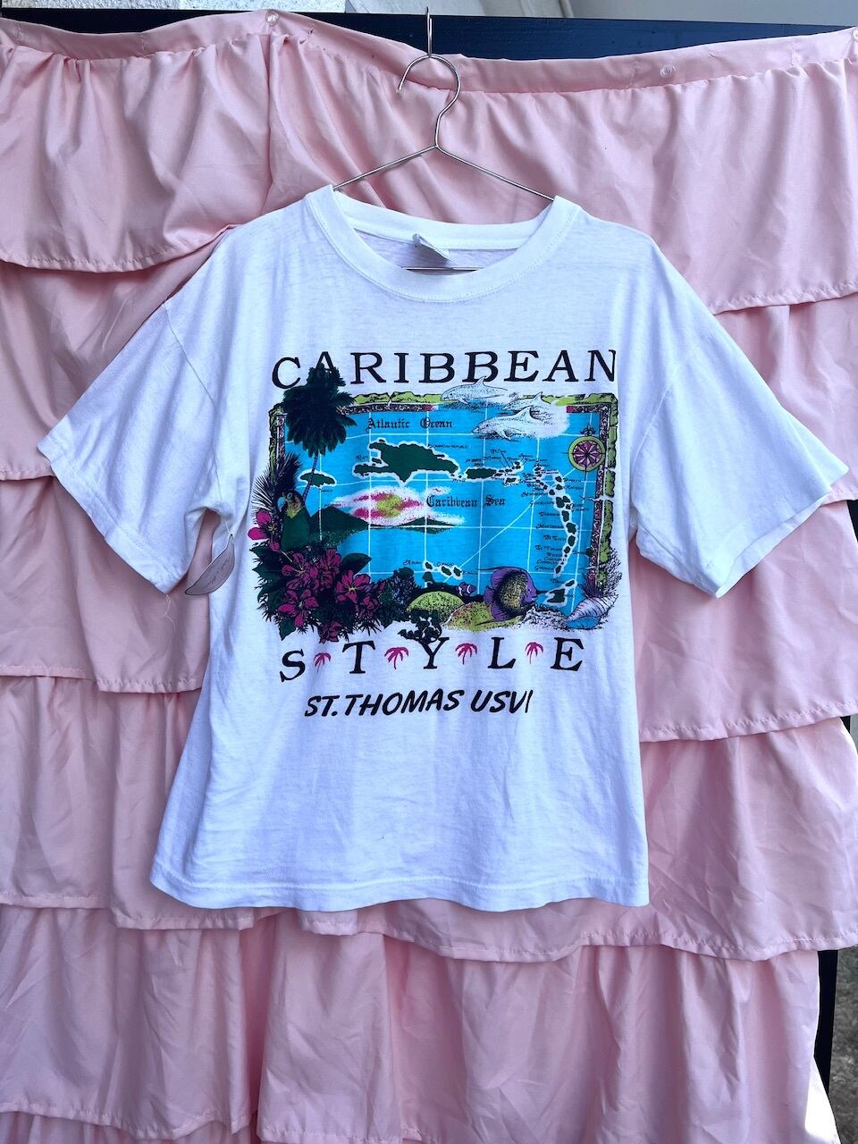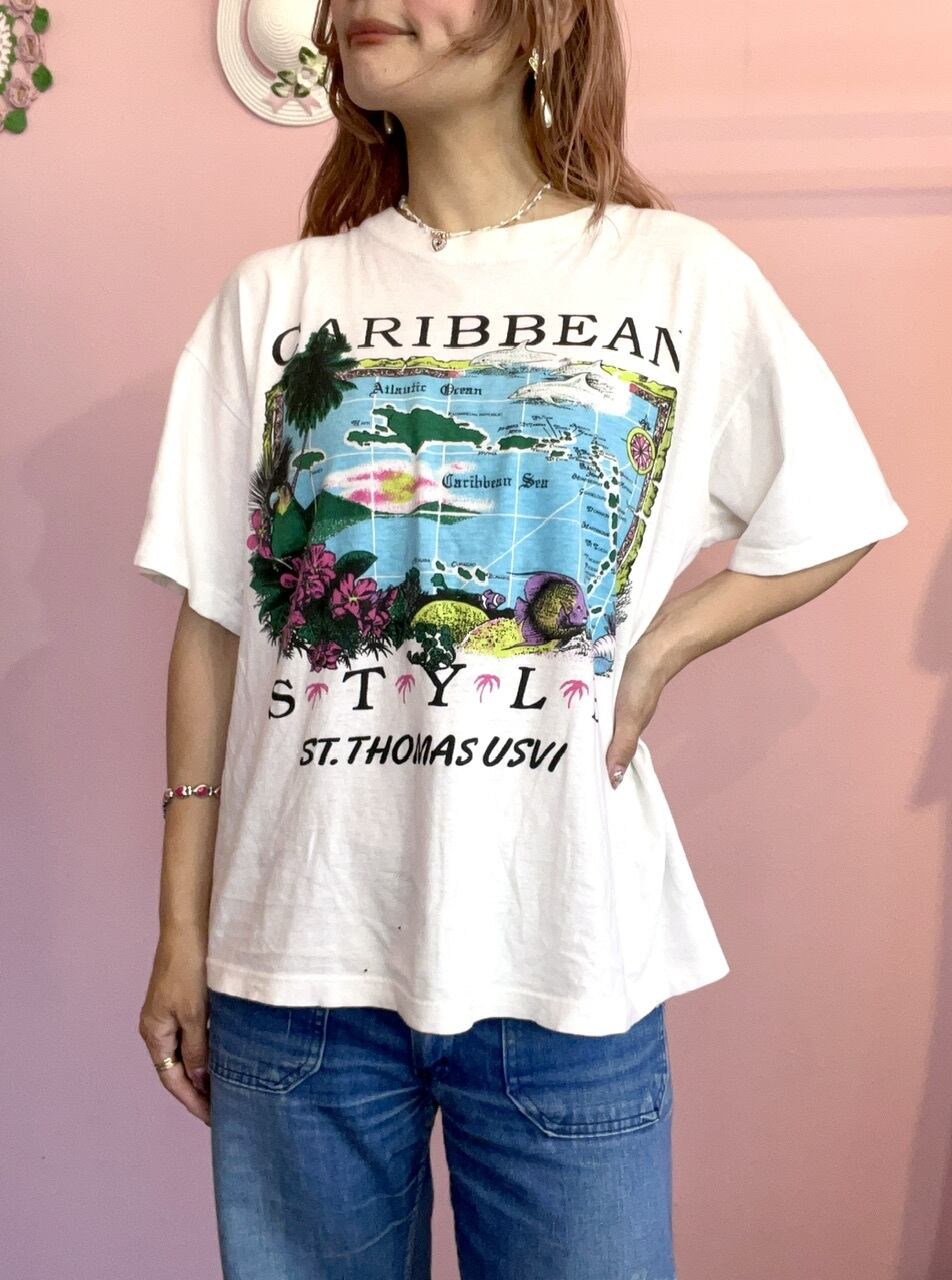 アメリカ領ヴァージン諸島の島、セントトマス島のスーベニアTシャツです。カリブ海の地図が描かれてます。