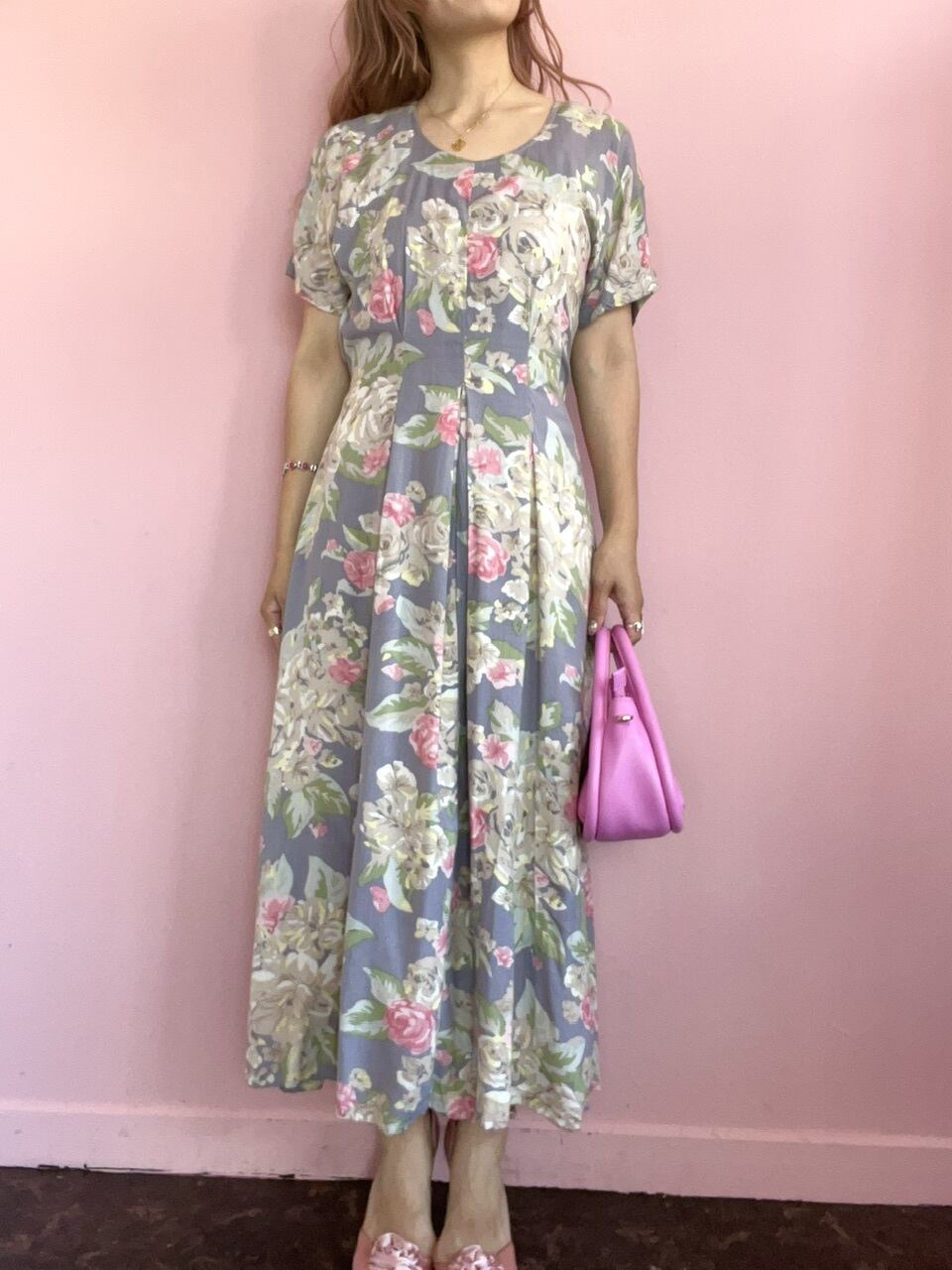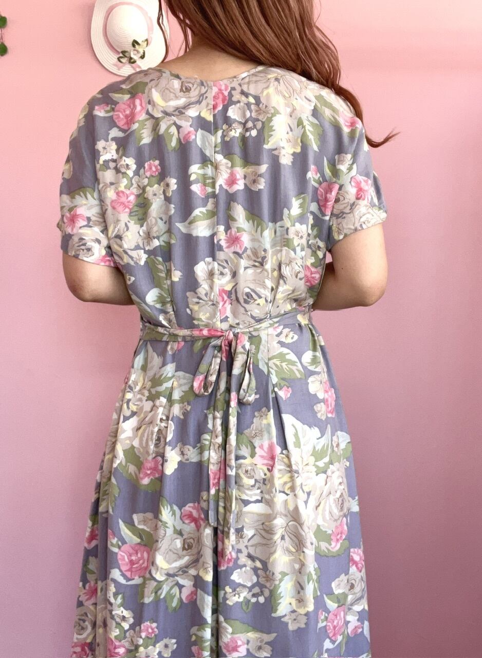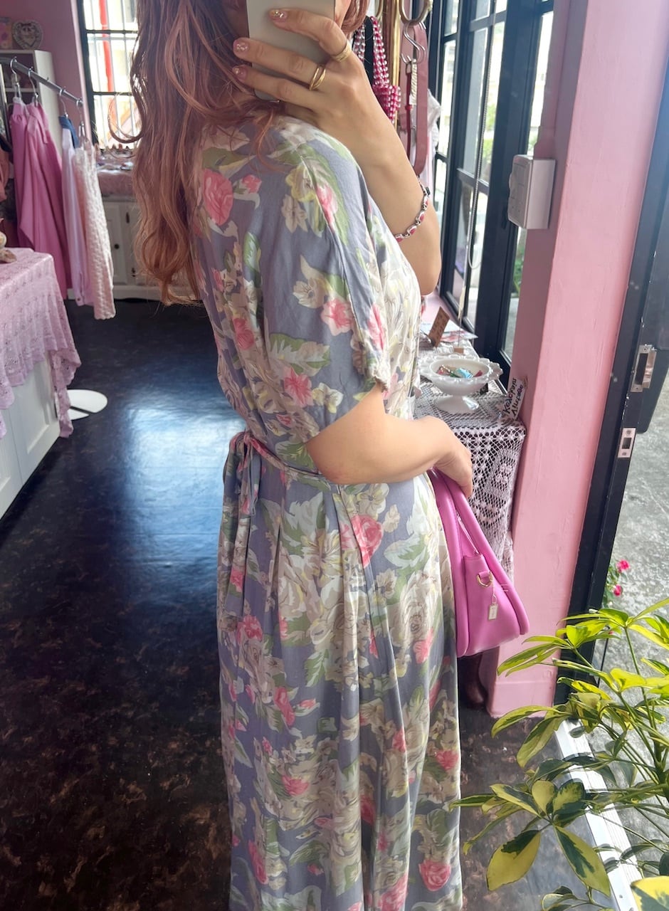 くすみブルー地に花柄が描かれた可愛いらしいワンピース♡