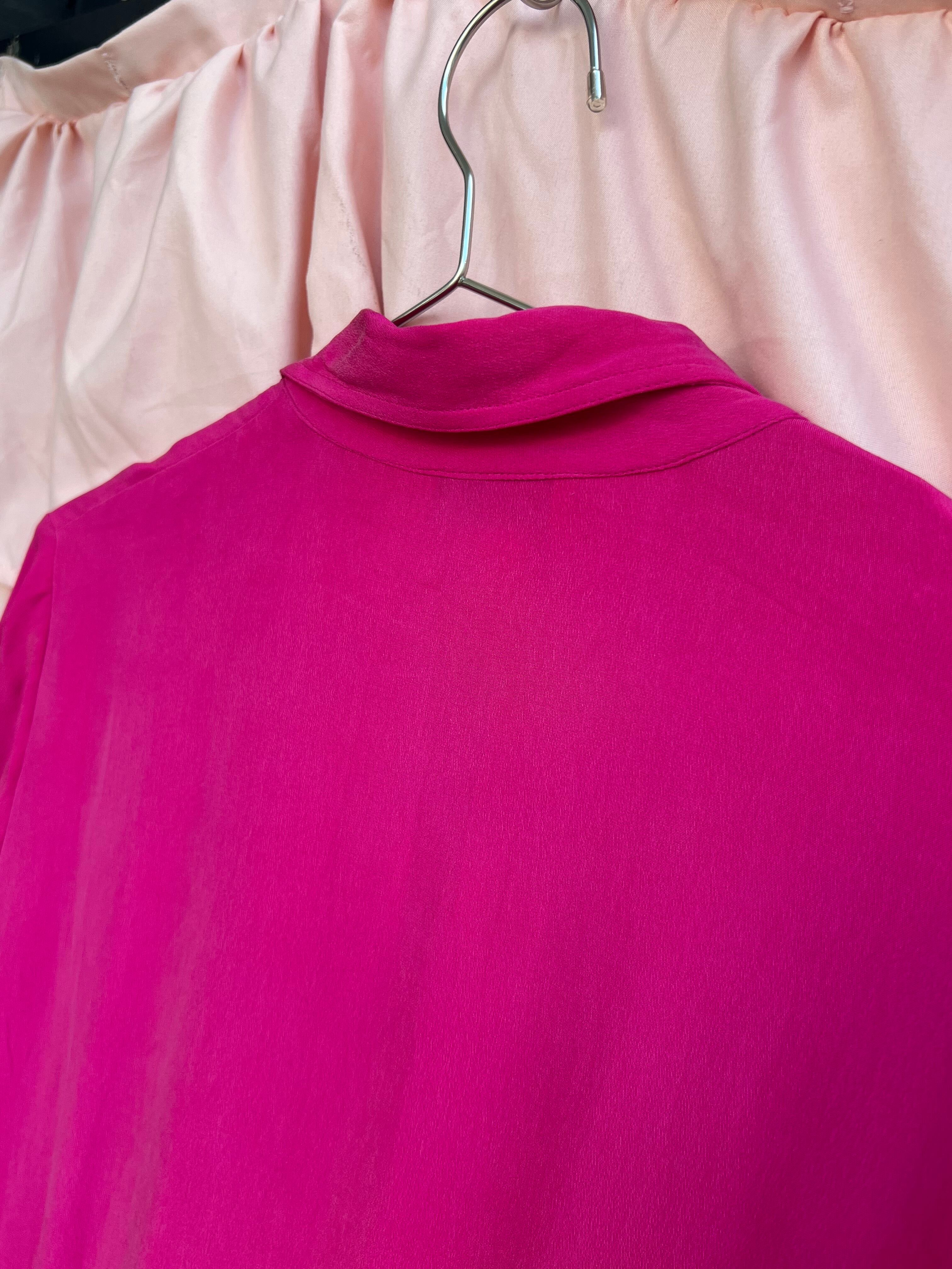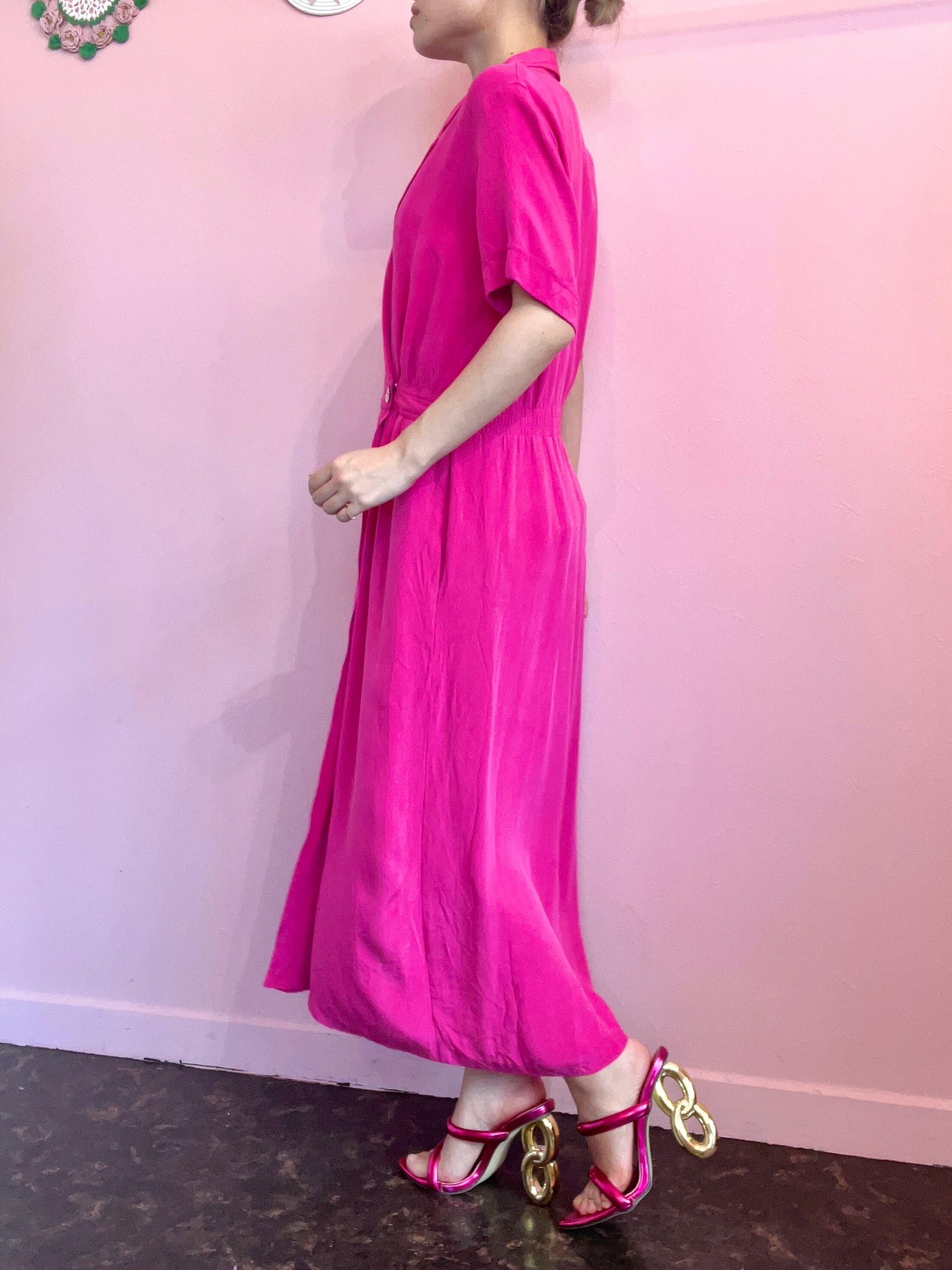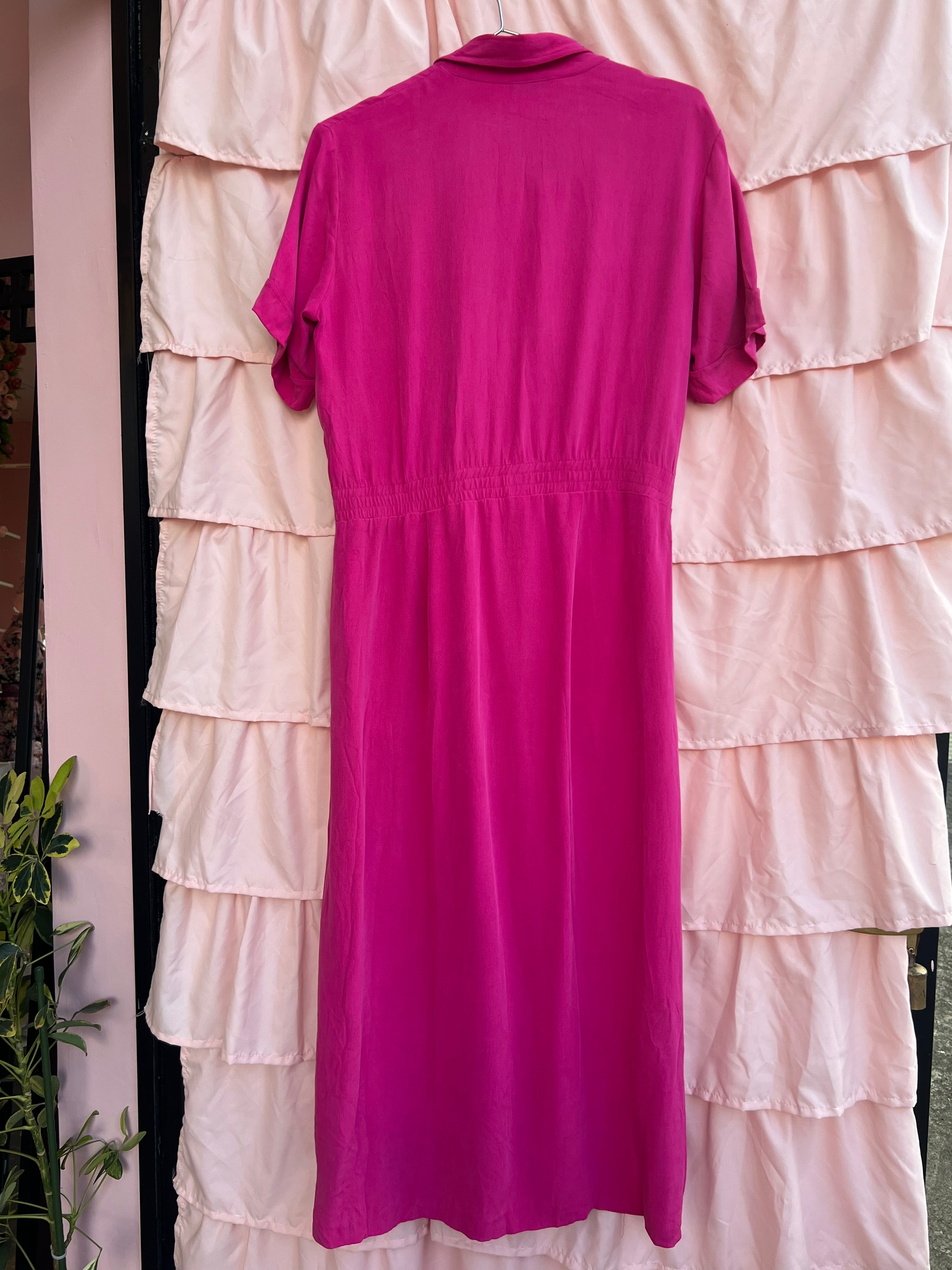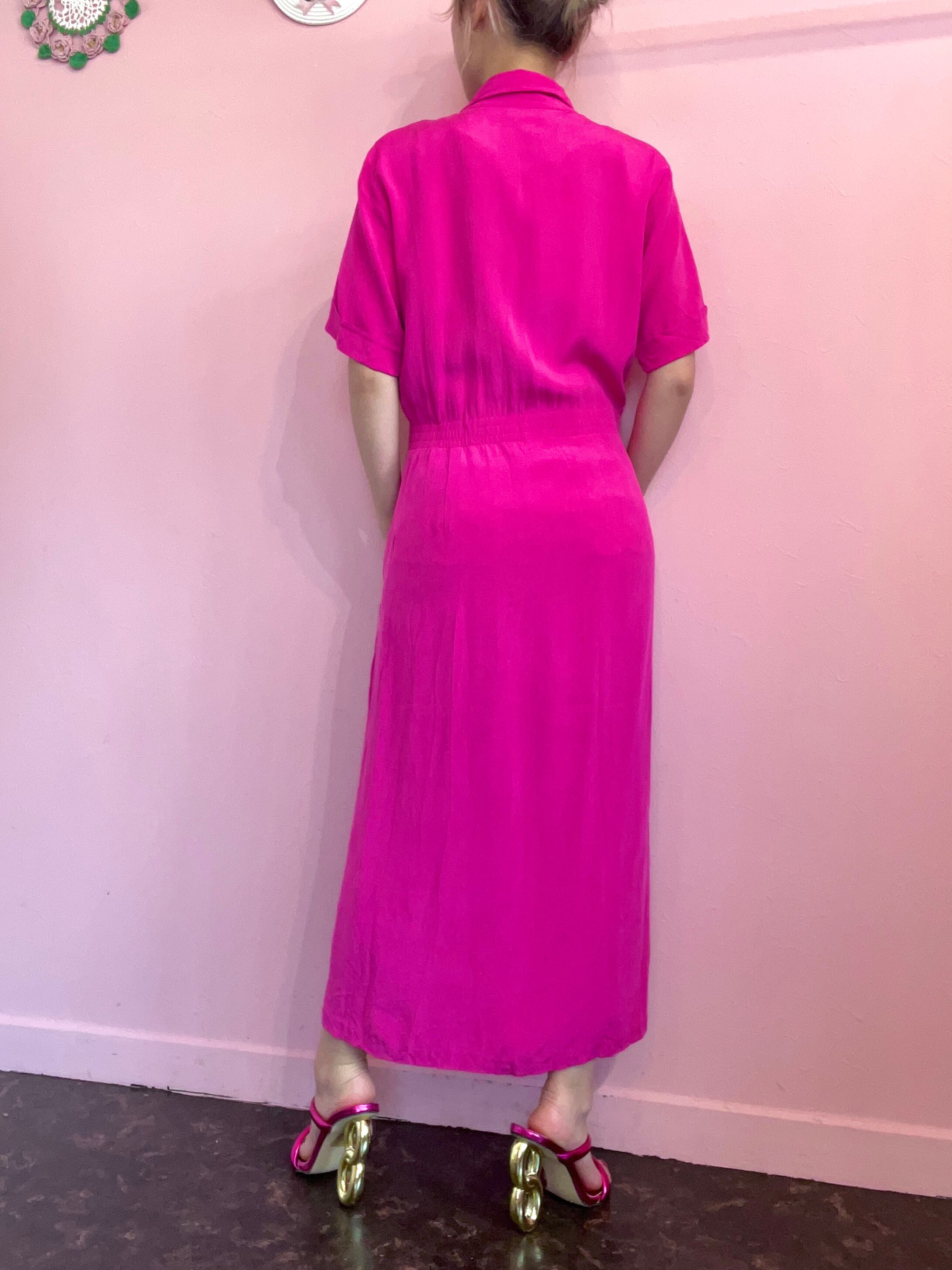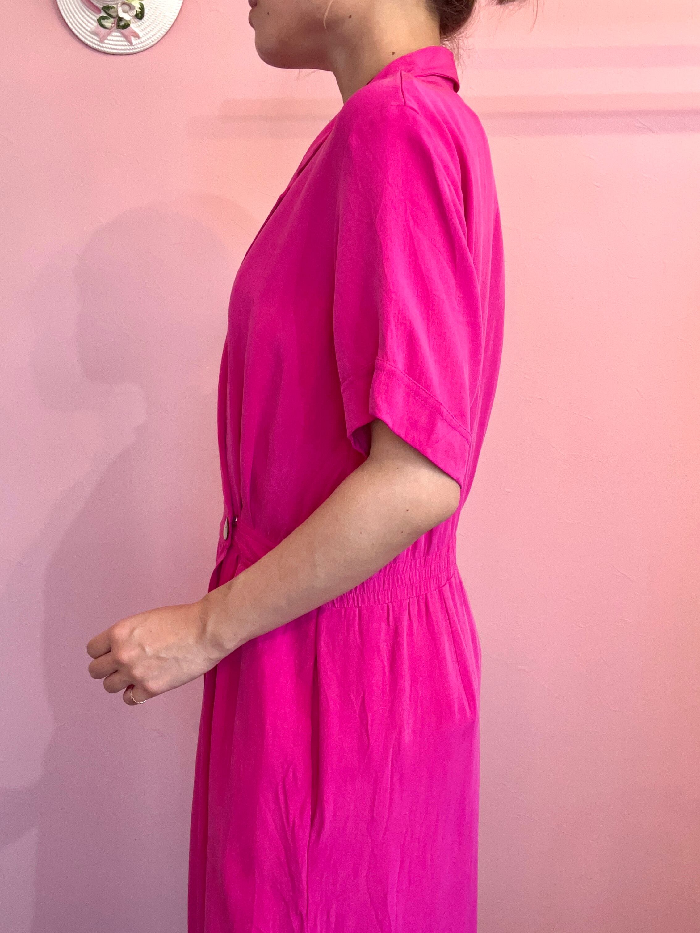 ダブルボタンのデザインが素敵な100%シルクのワンピース。後ろがゴムになっていてウエストがキュッと引き締まるデザインです。