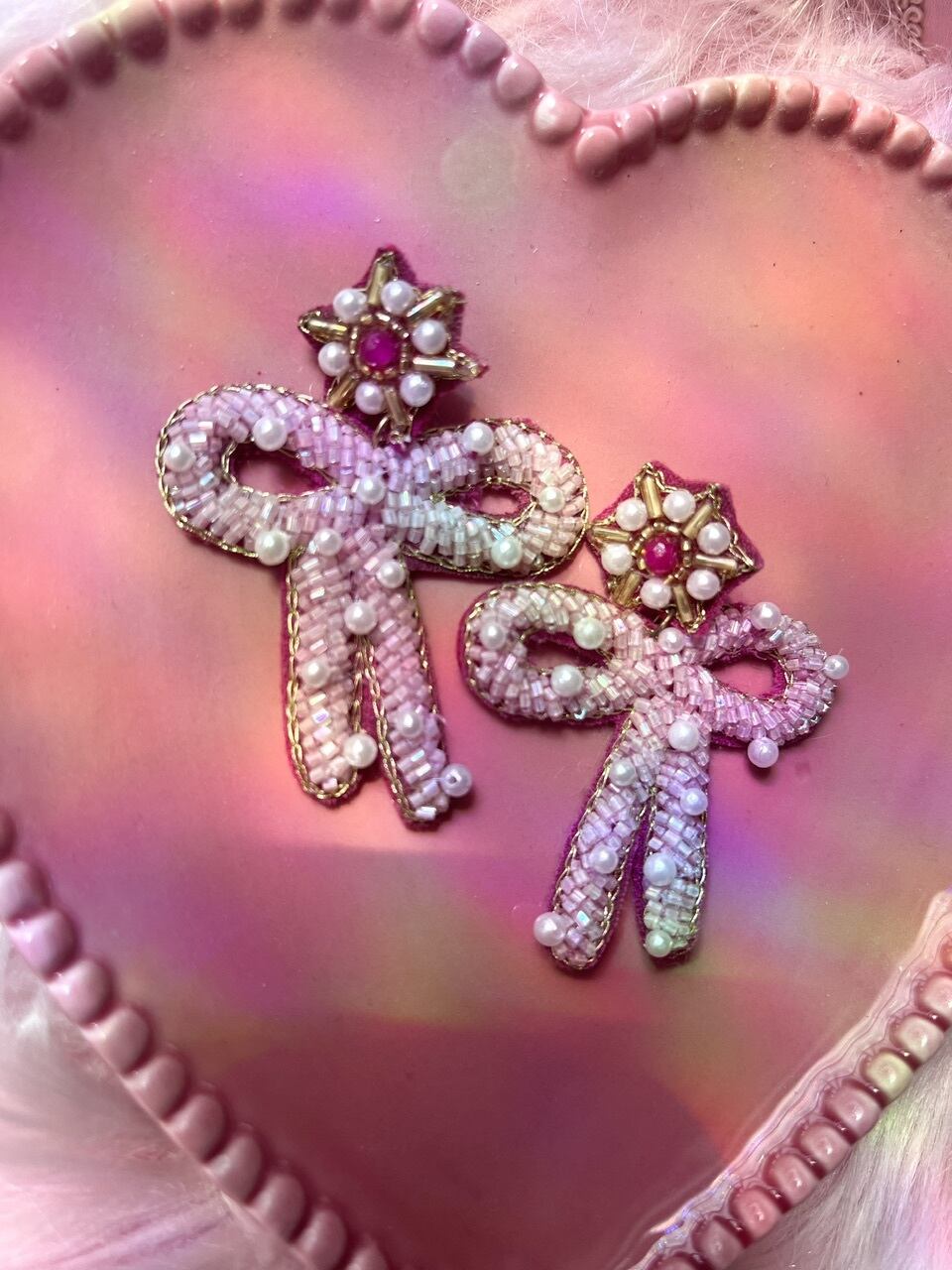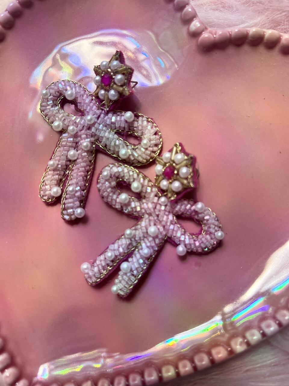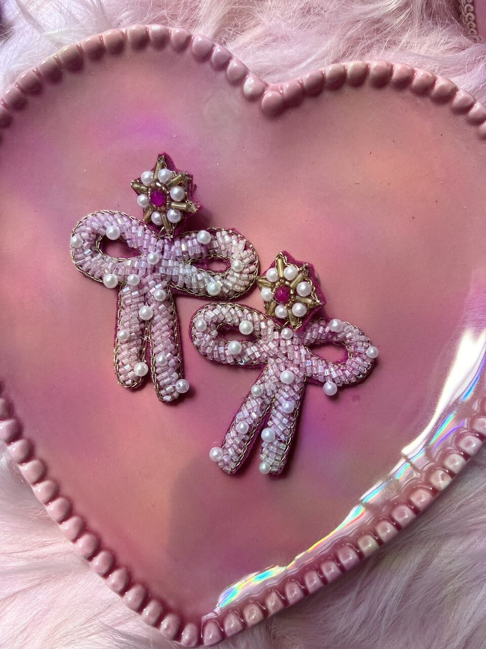 ビーズやパールが所々に施されていて、存在感あるピアスです♡