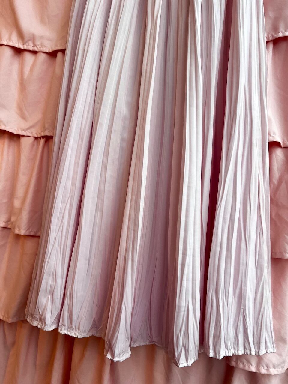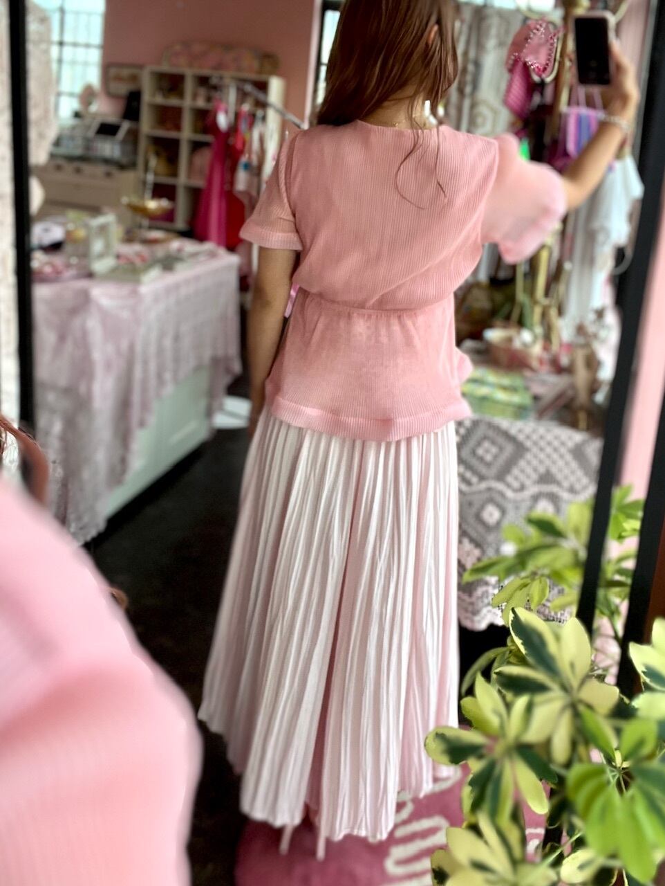 薄いピンクで合わせやすく、綺麗めにも着ていただけます。