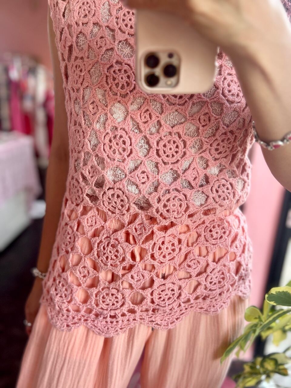 クロシェット編みが可愛いピンクトップス♡