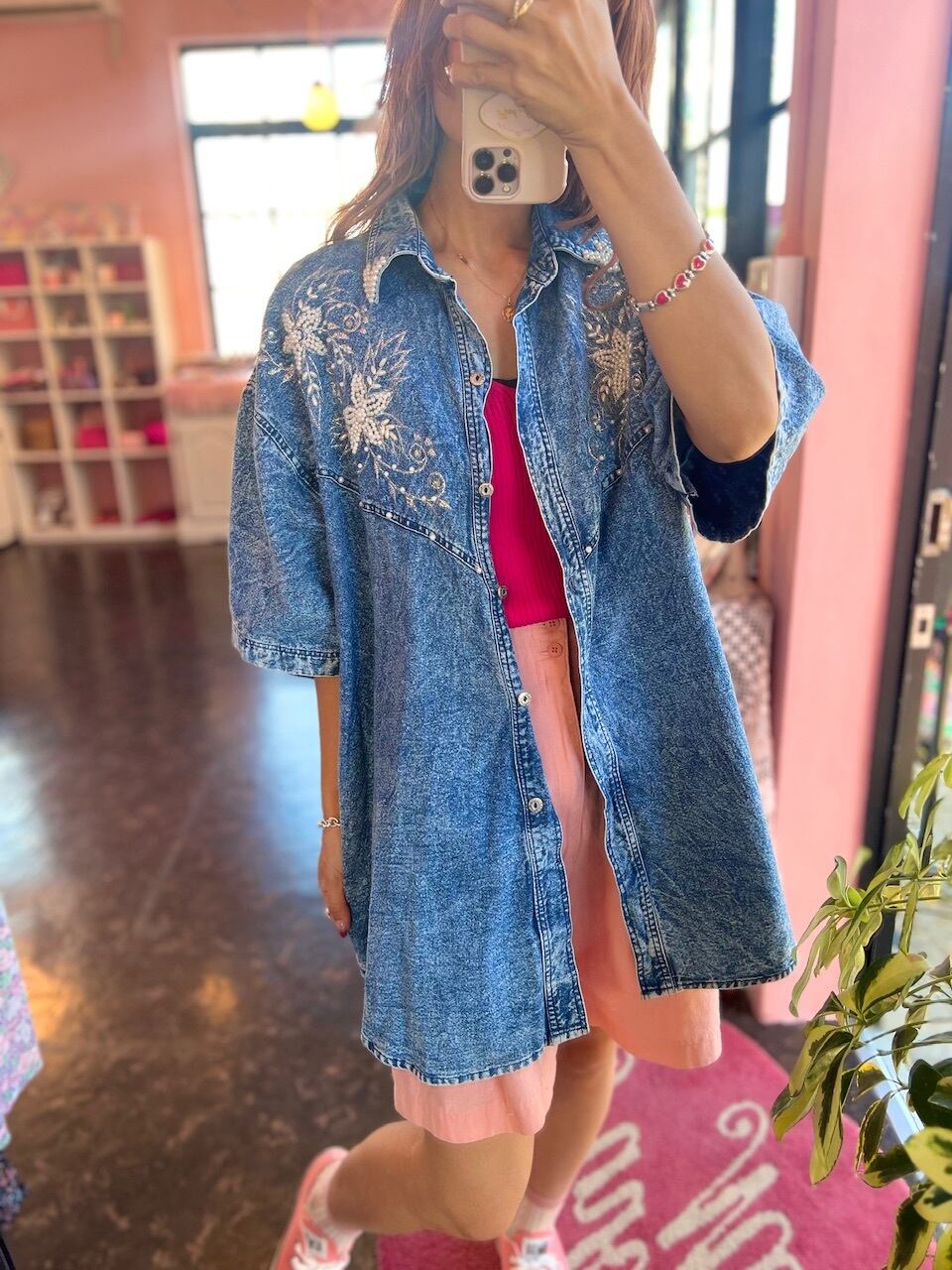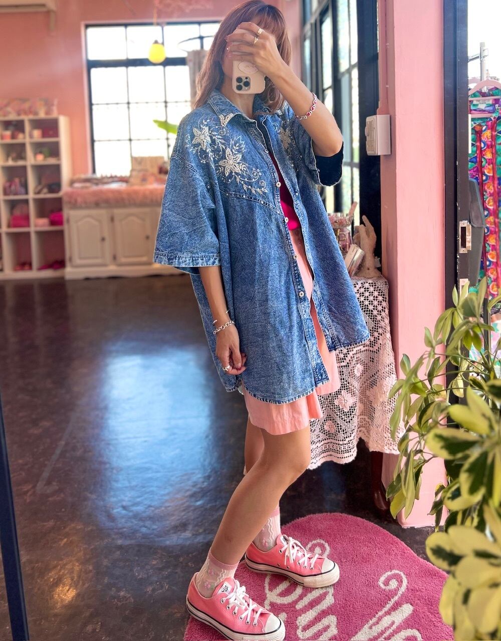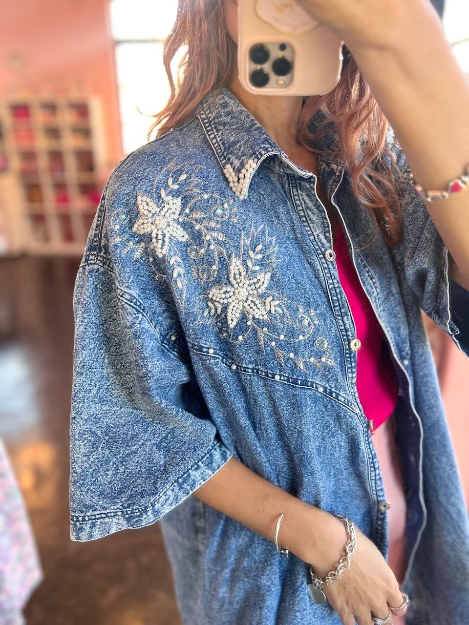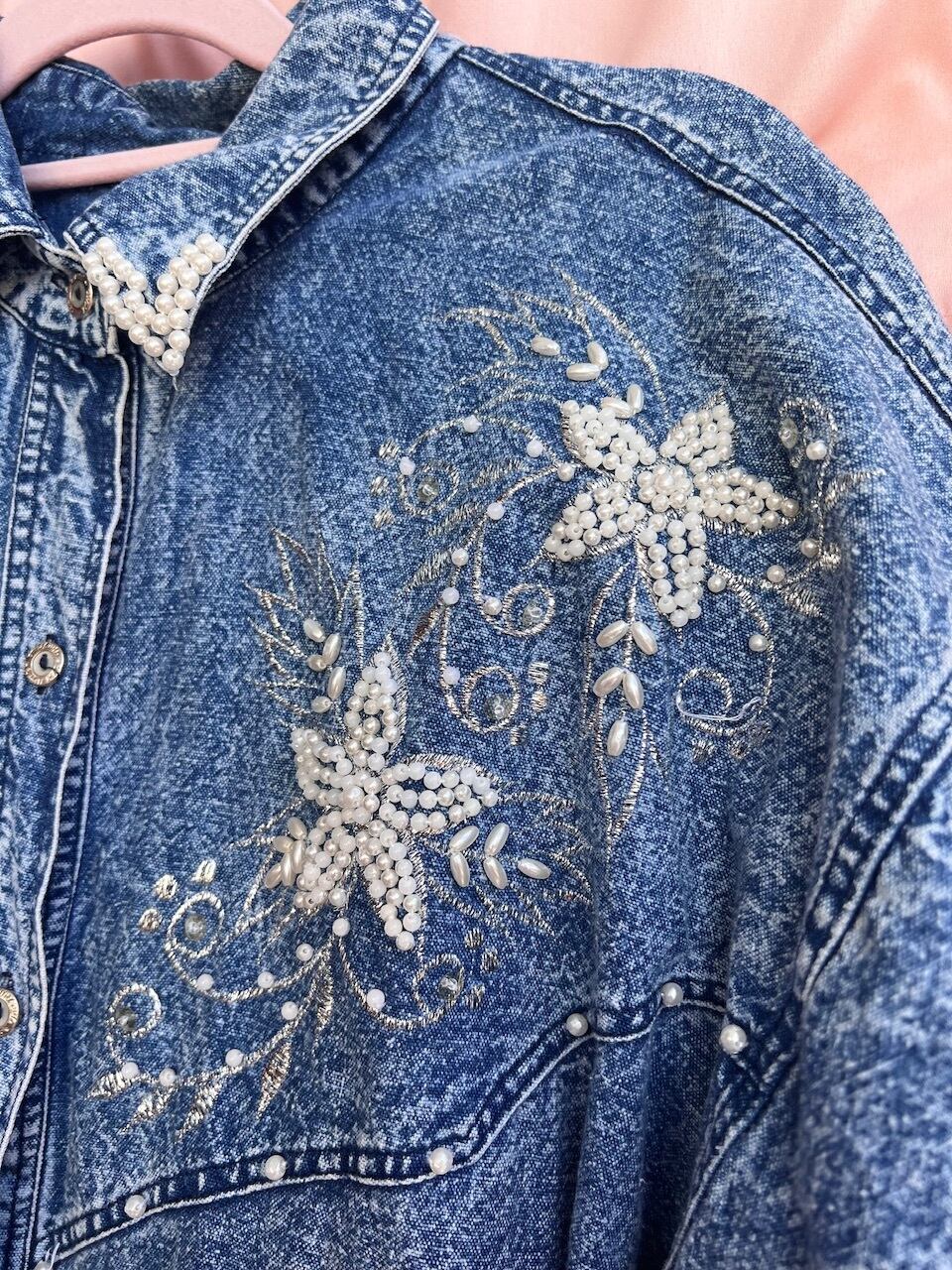パールでできたお花の模様と、植物柄の刺繍が素敵なケミカルデニムシャツ♡
