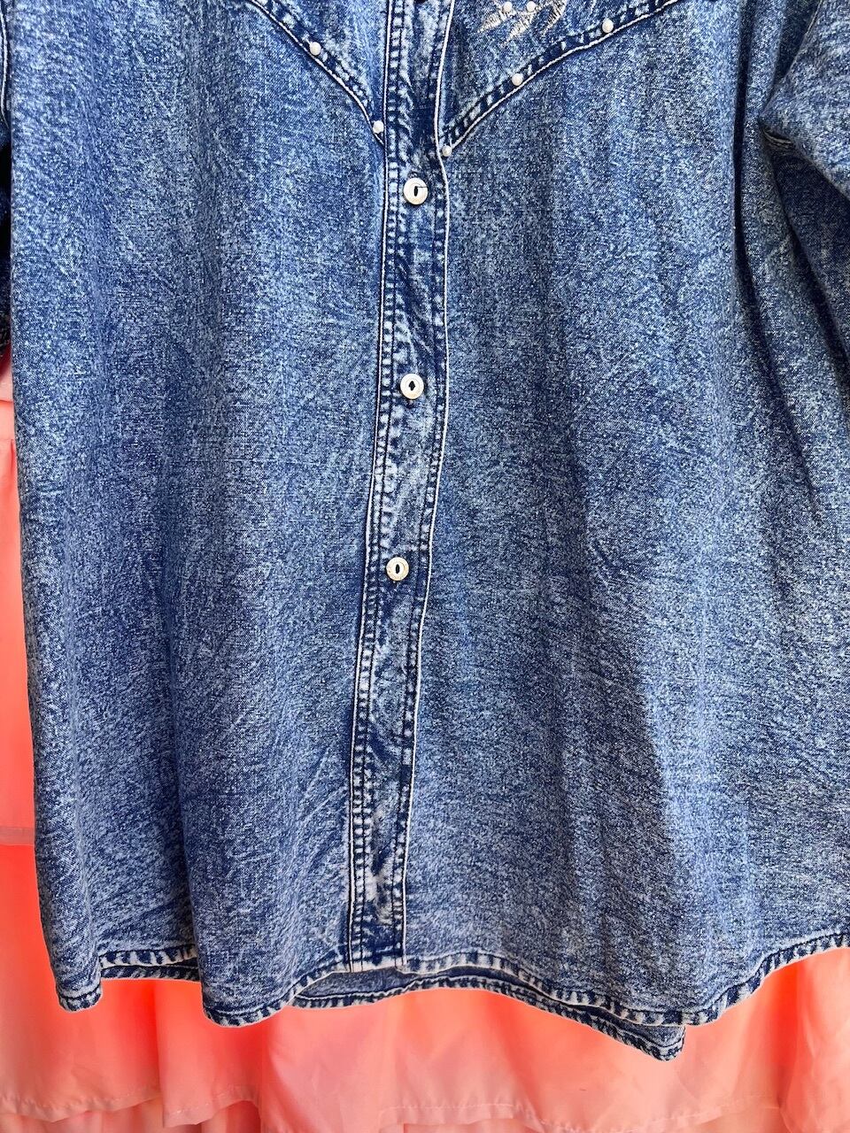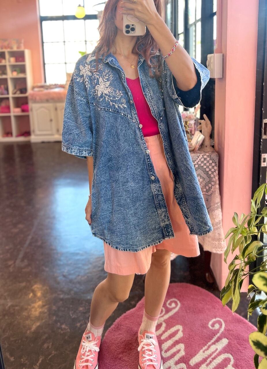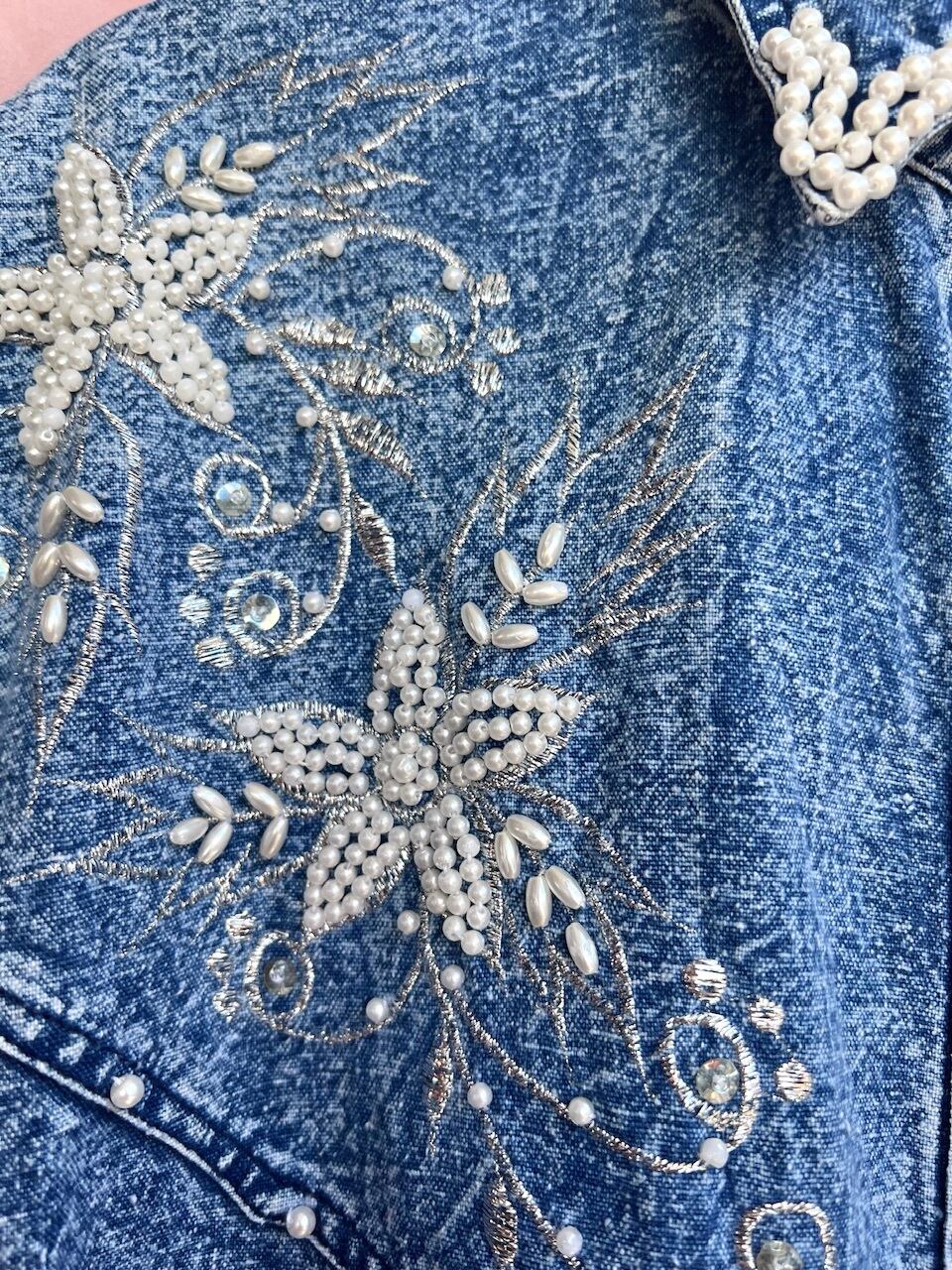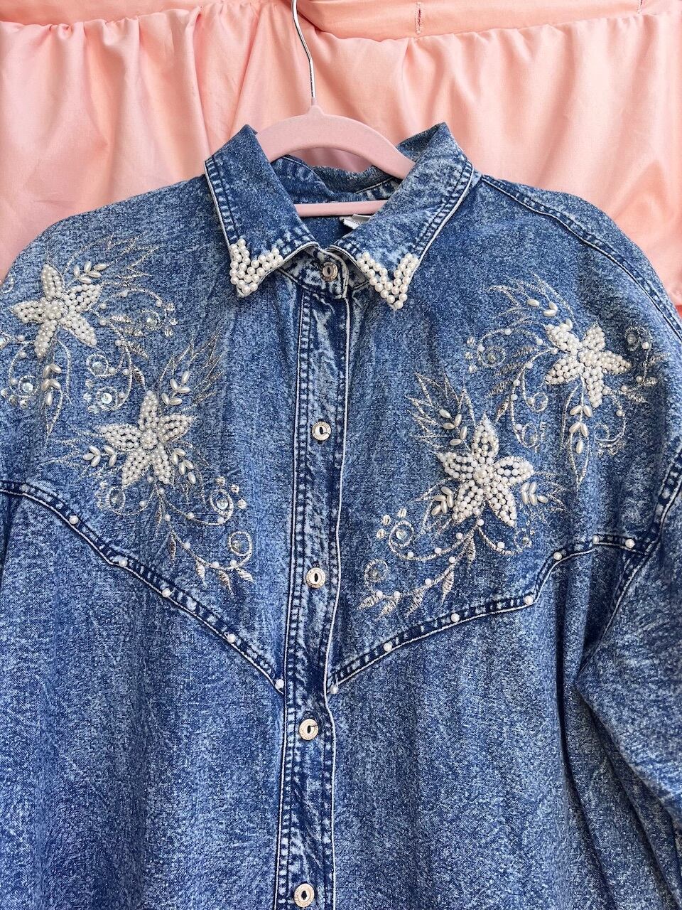 パールでできたお花の模様と、植物柄の刺繍が素敵なケミカルデニムシャツ♡
