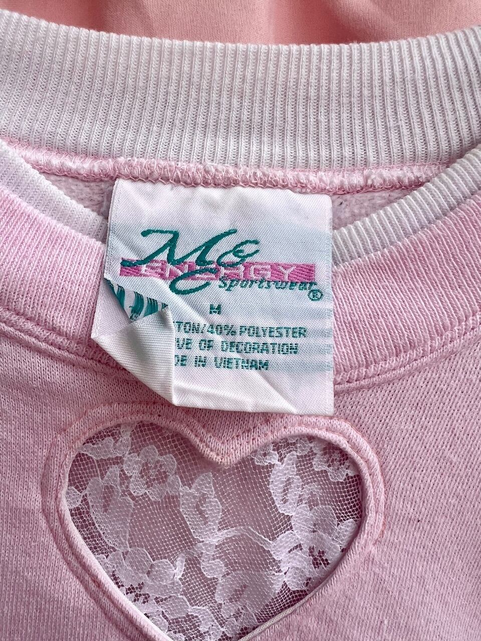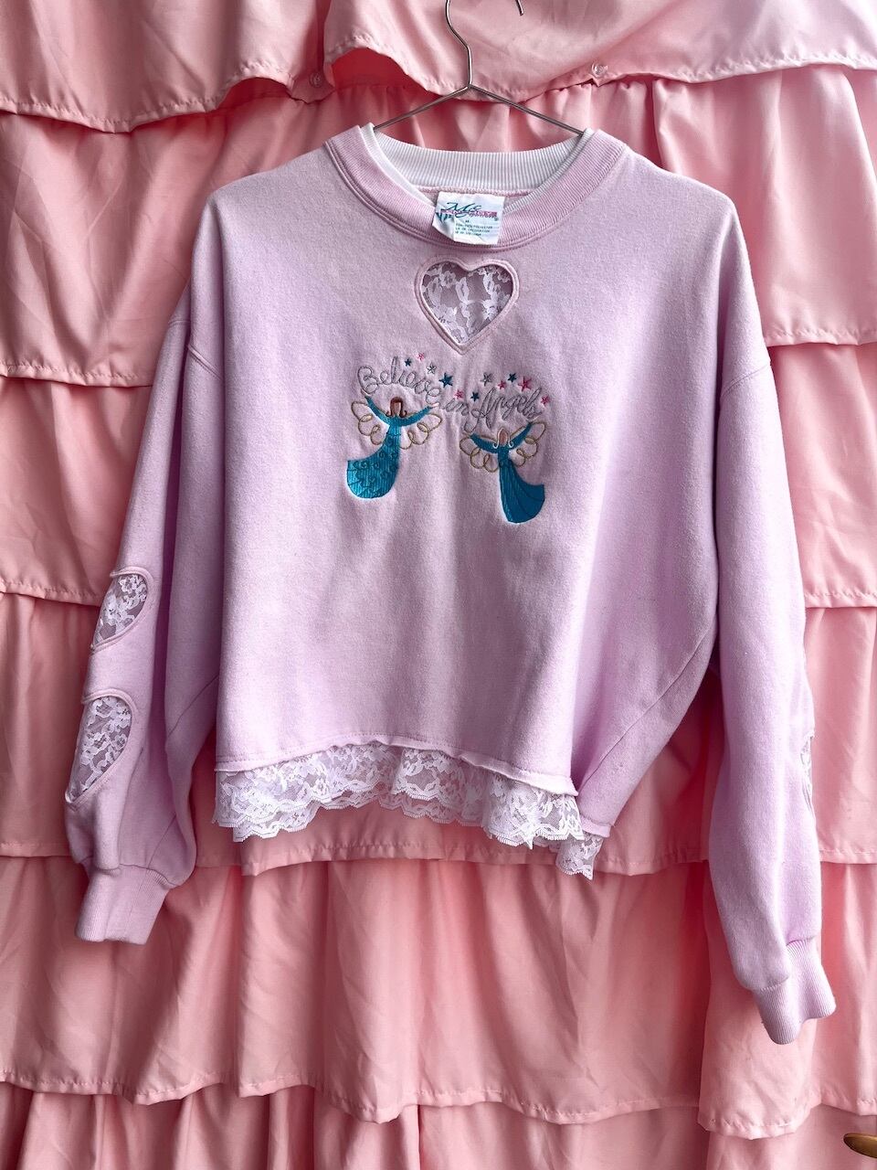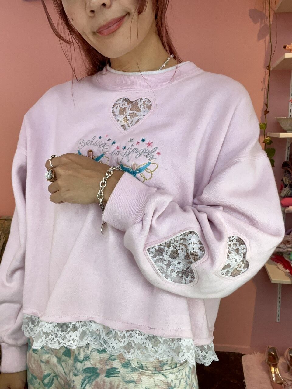 エンジェルの刺繍が施されているスウェットに、ハートのレースを5箇所施しました♡