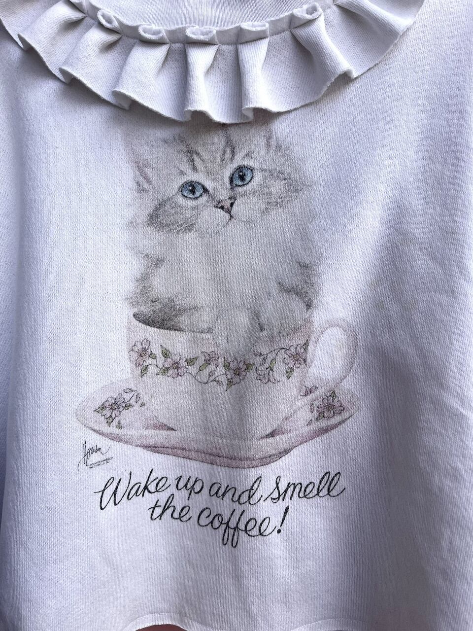 猫の絵柄が可愛いスウェットにヴィンテージレースを施しました♡