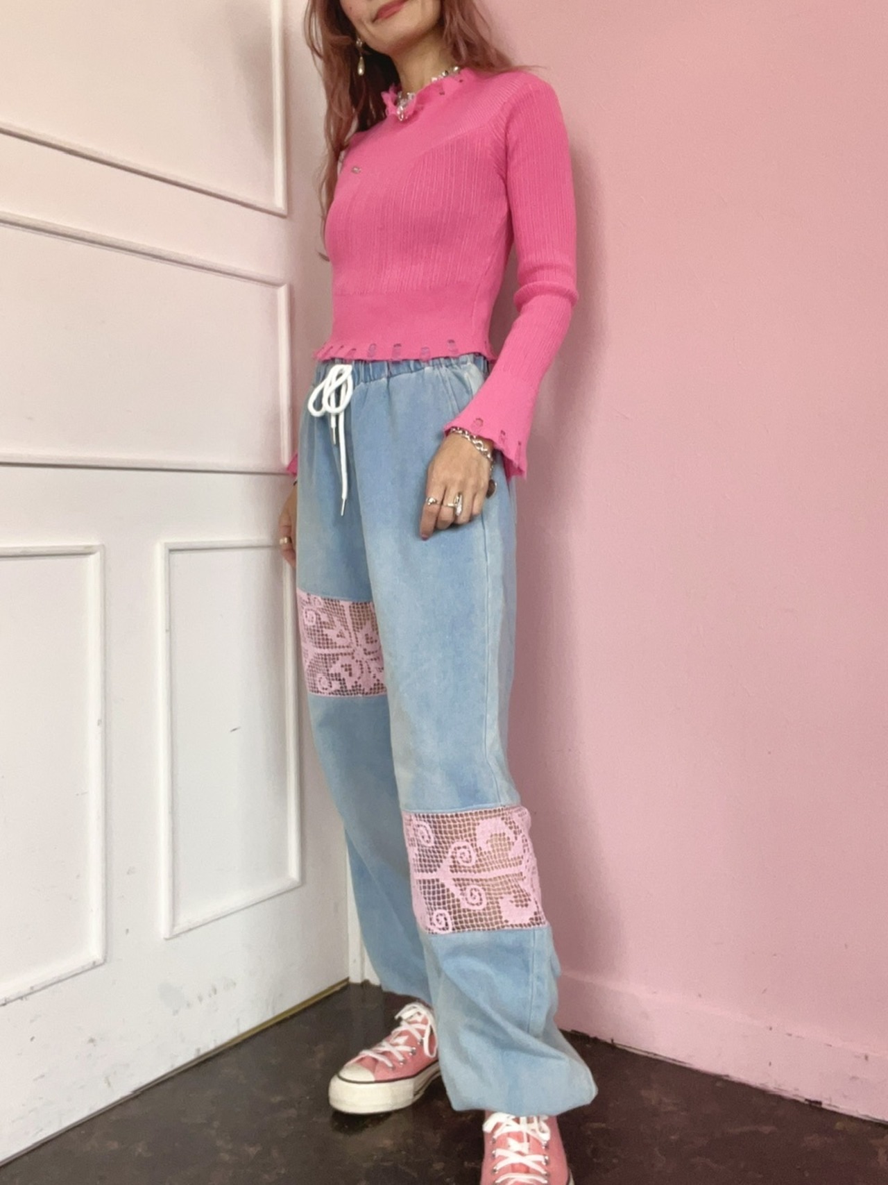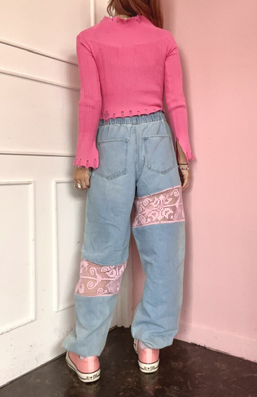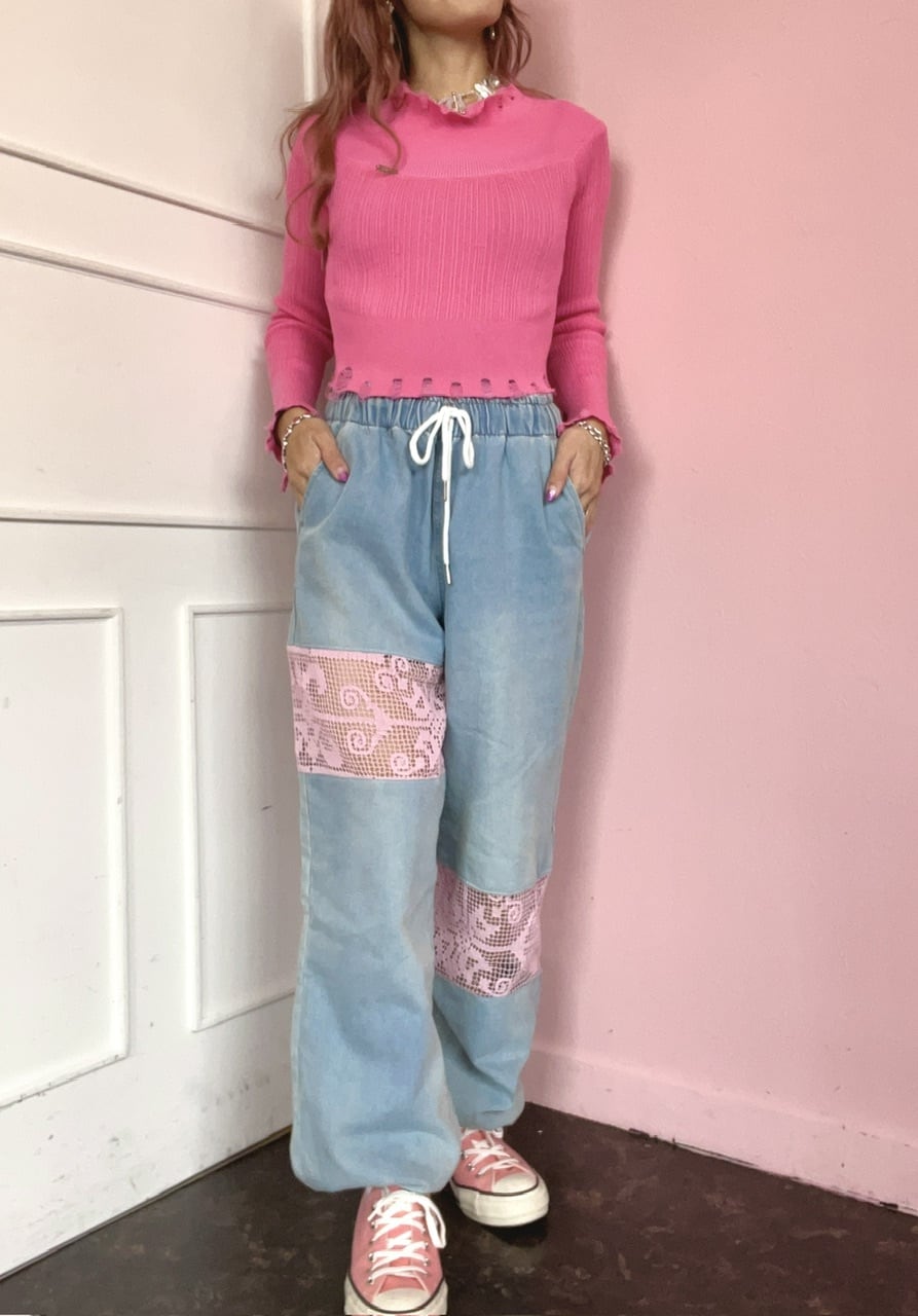 裾が絞られたデザインのイージーパンツにレースを組み合わせました。