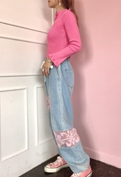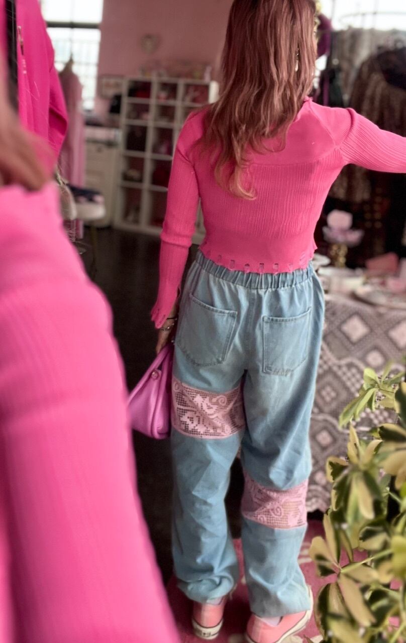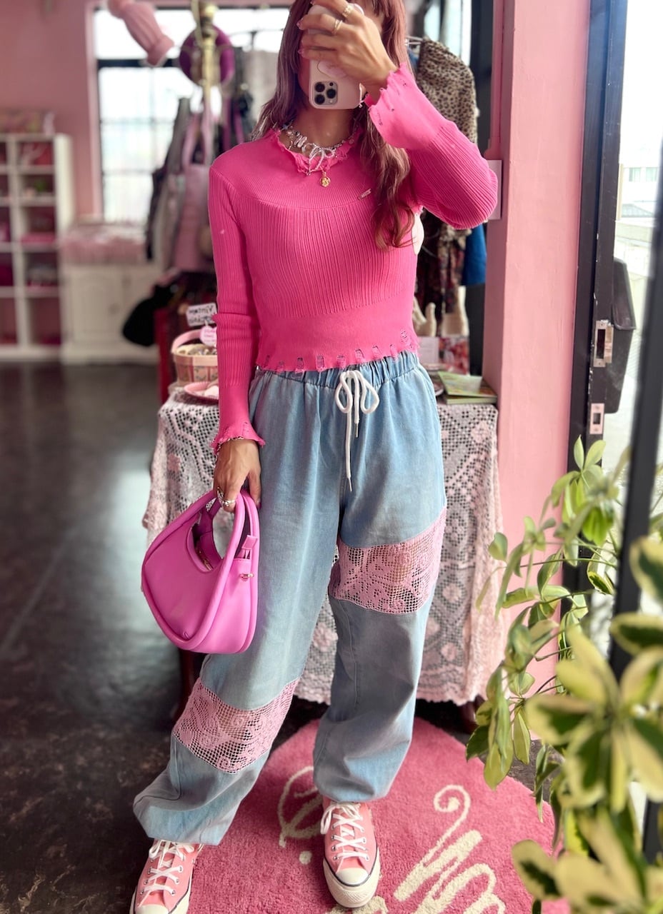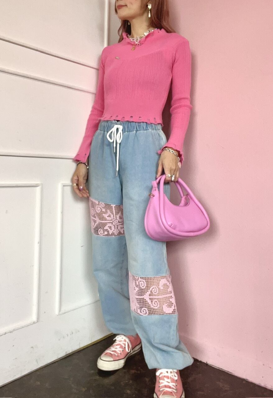 裾が絞られたデザインのイージーパンツにレースを組み合わせました。