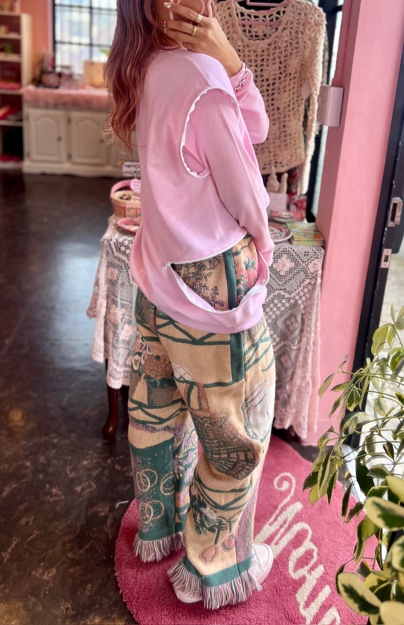 袖が取れるデザインにリメイクしたピンクカラーが可愛いらしいスウェット。