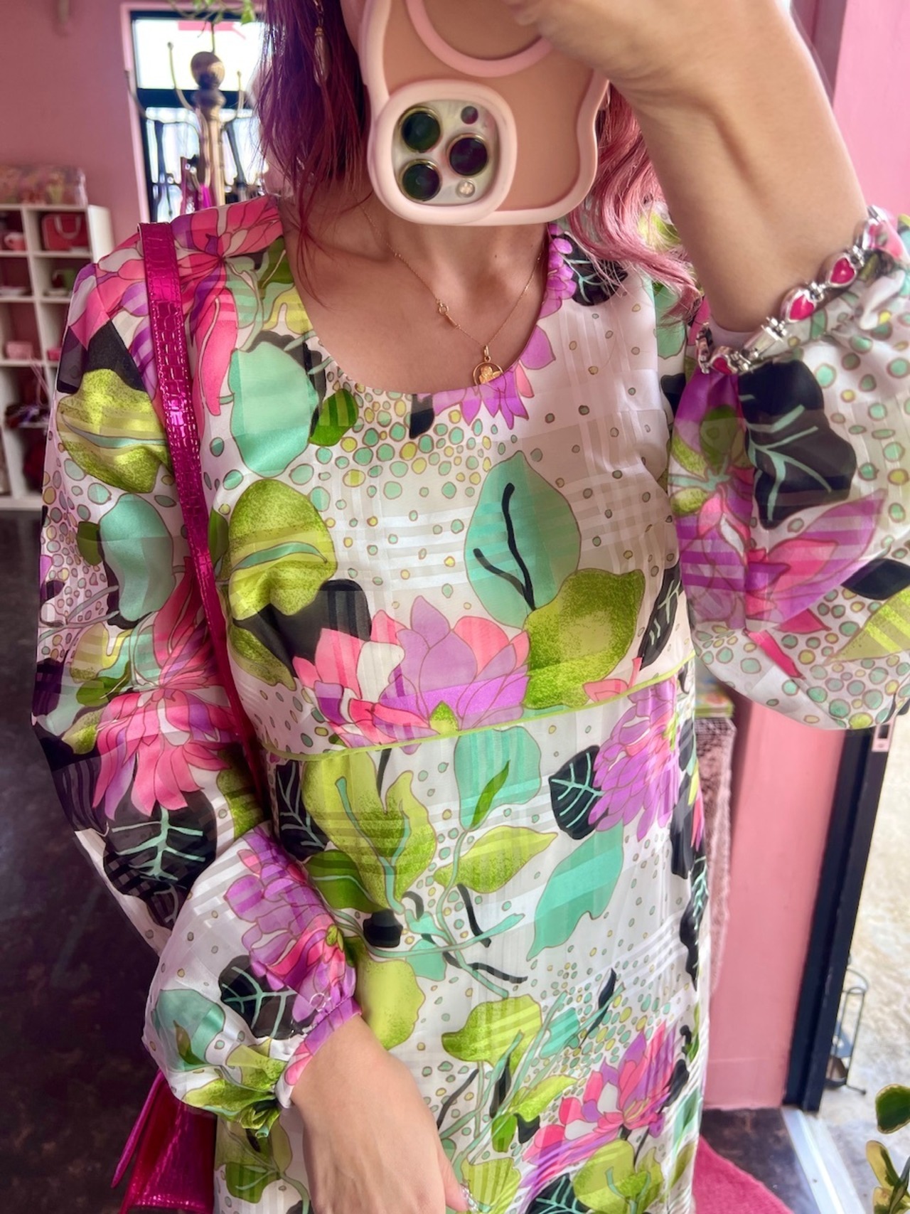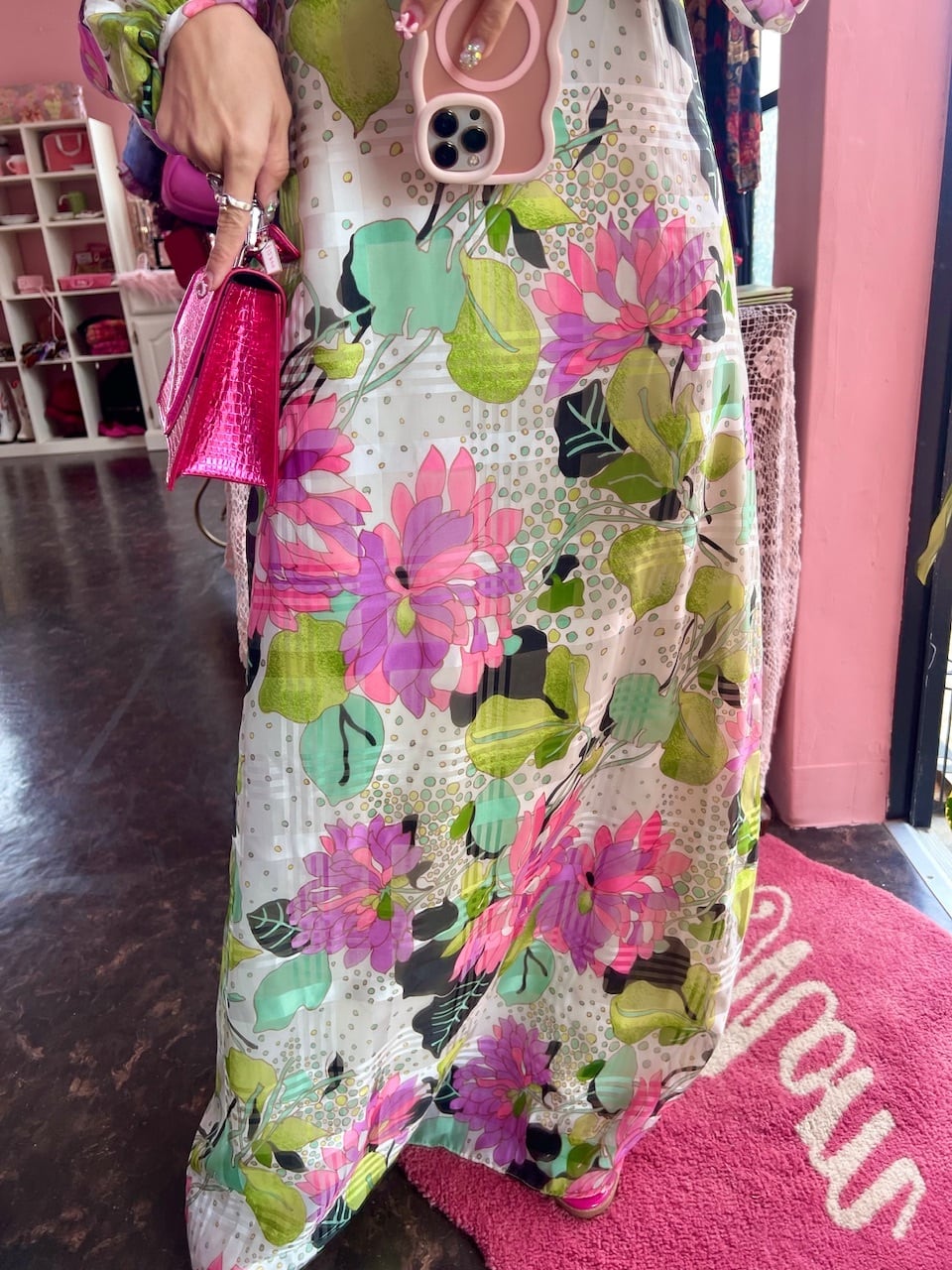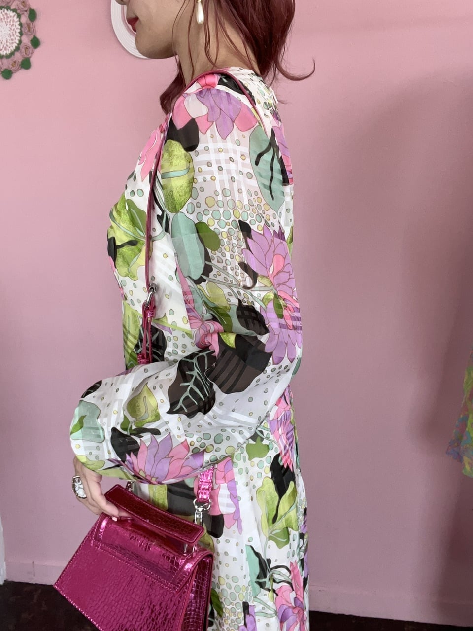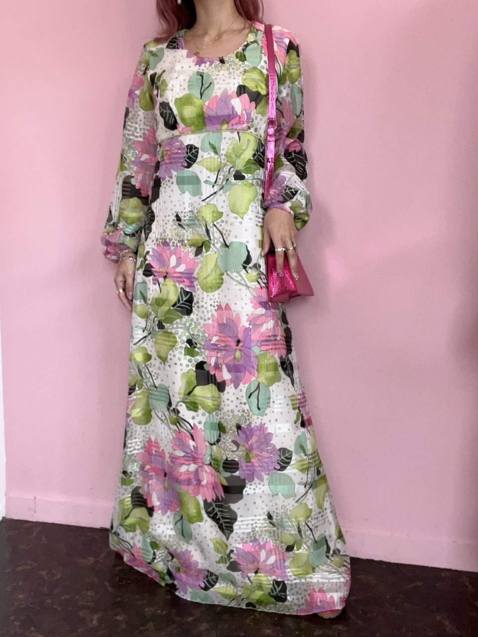 シアーの袖や70sらしいカラフルな模様が可愛いマキシ丈ワンピース♡