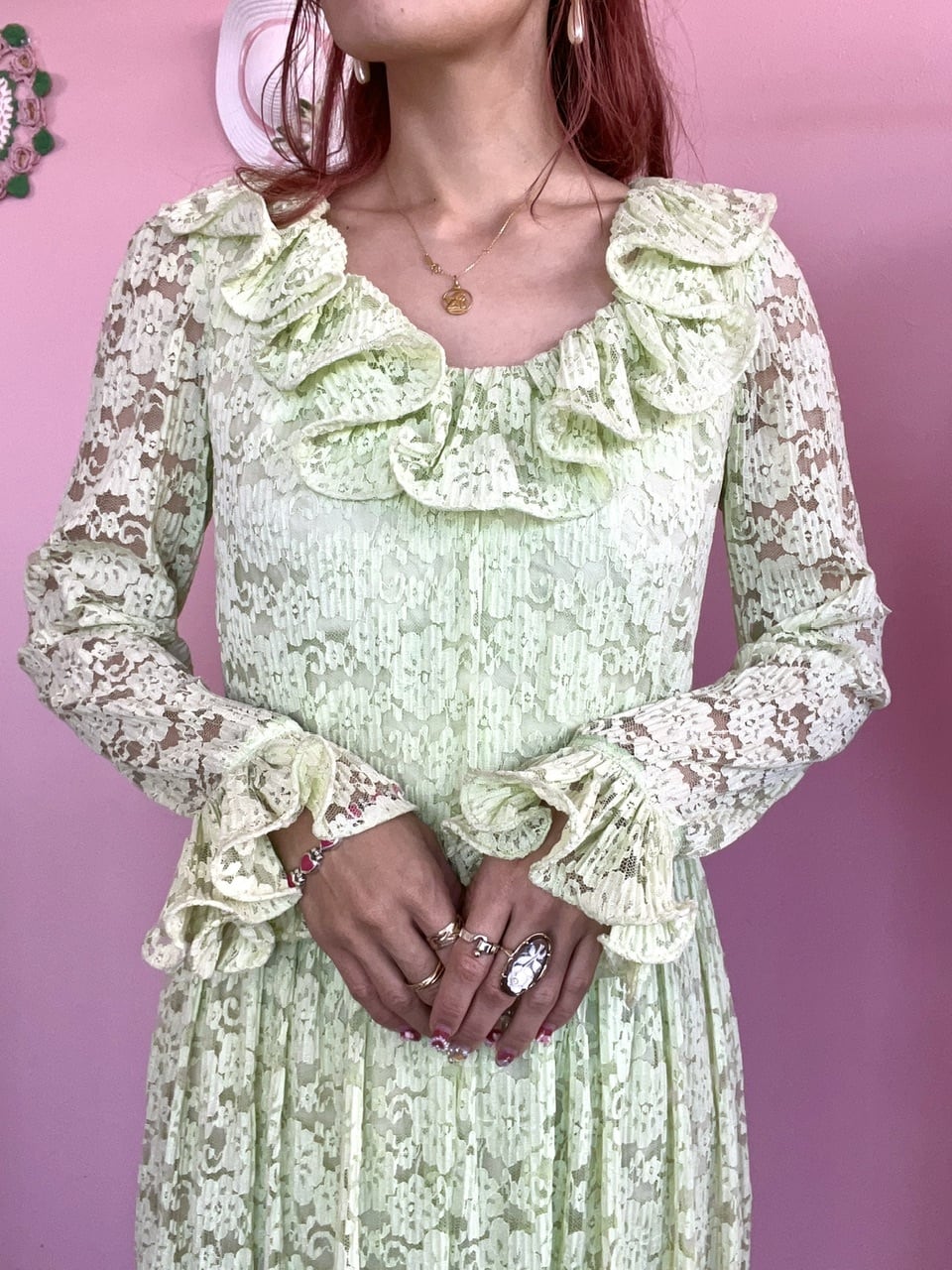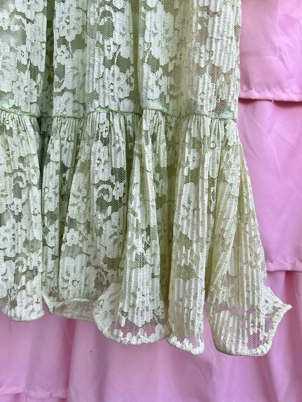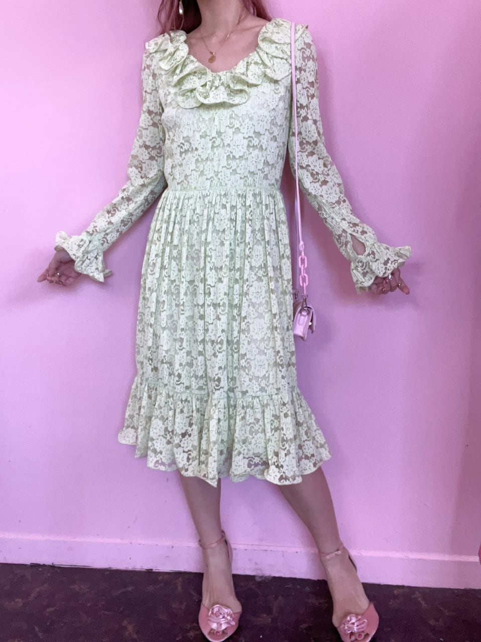ミントグリーンの色味やレース、フリルシルエットが可愛いレースドレス♡