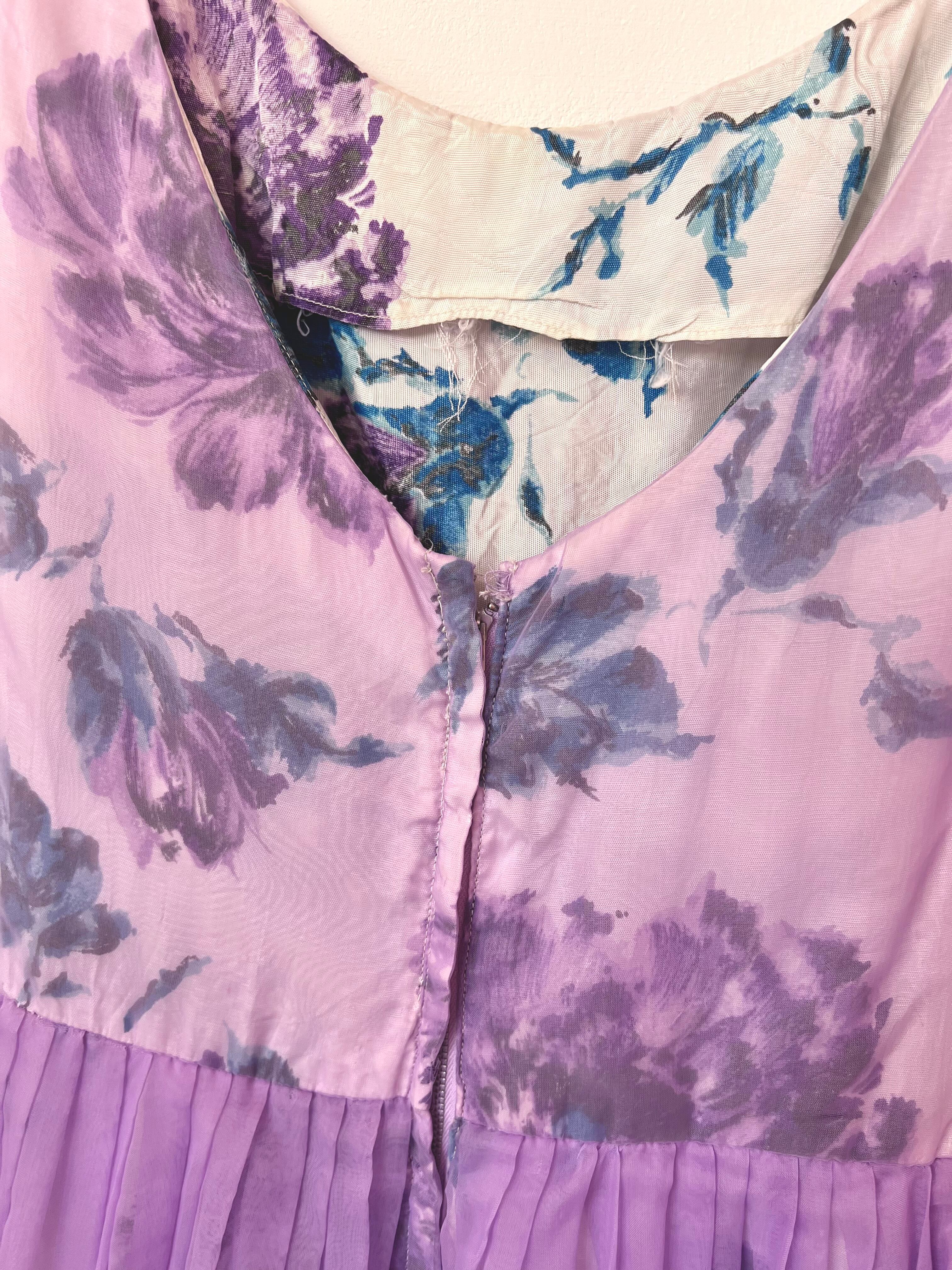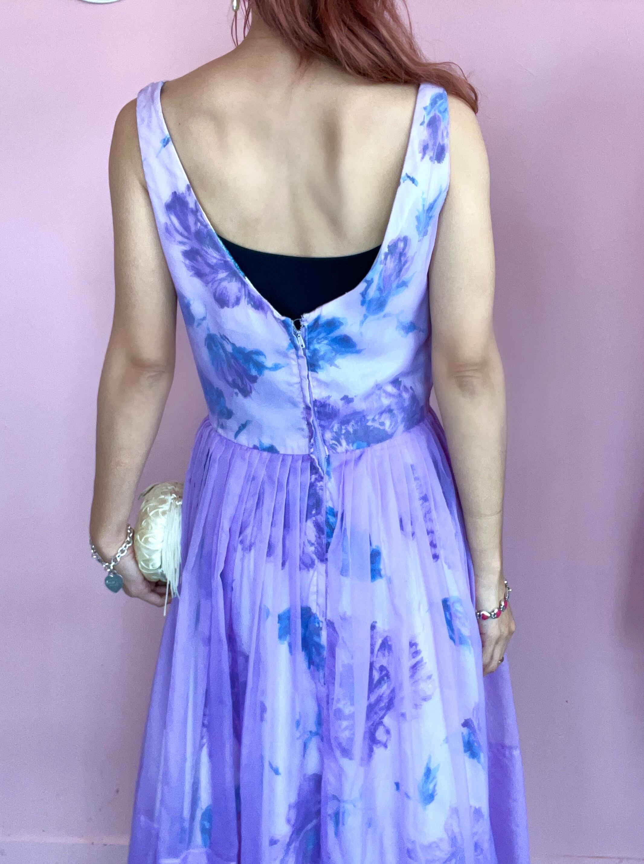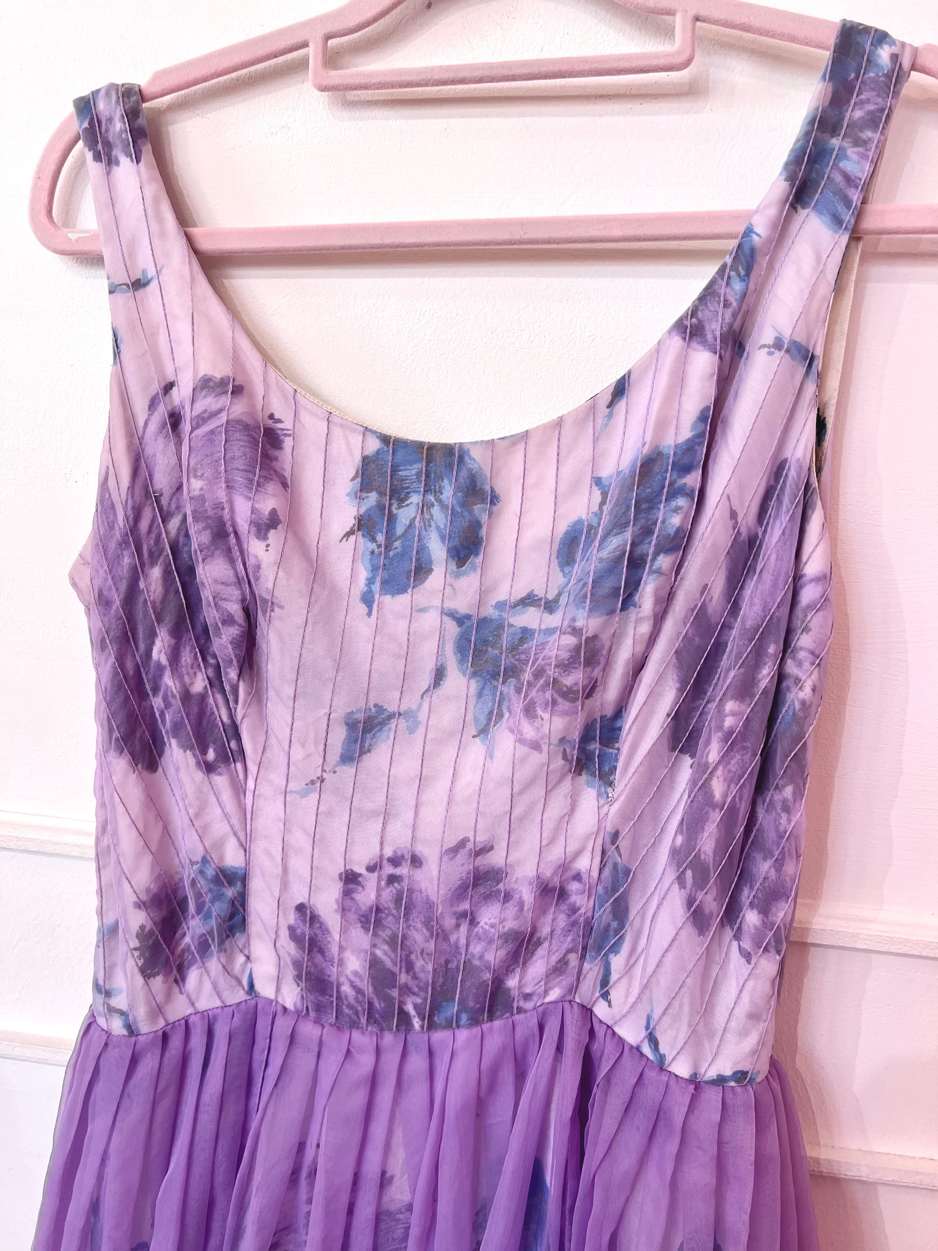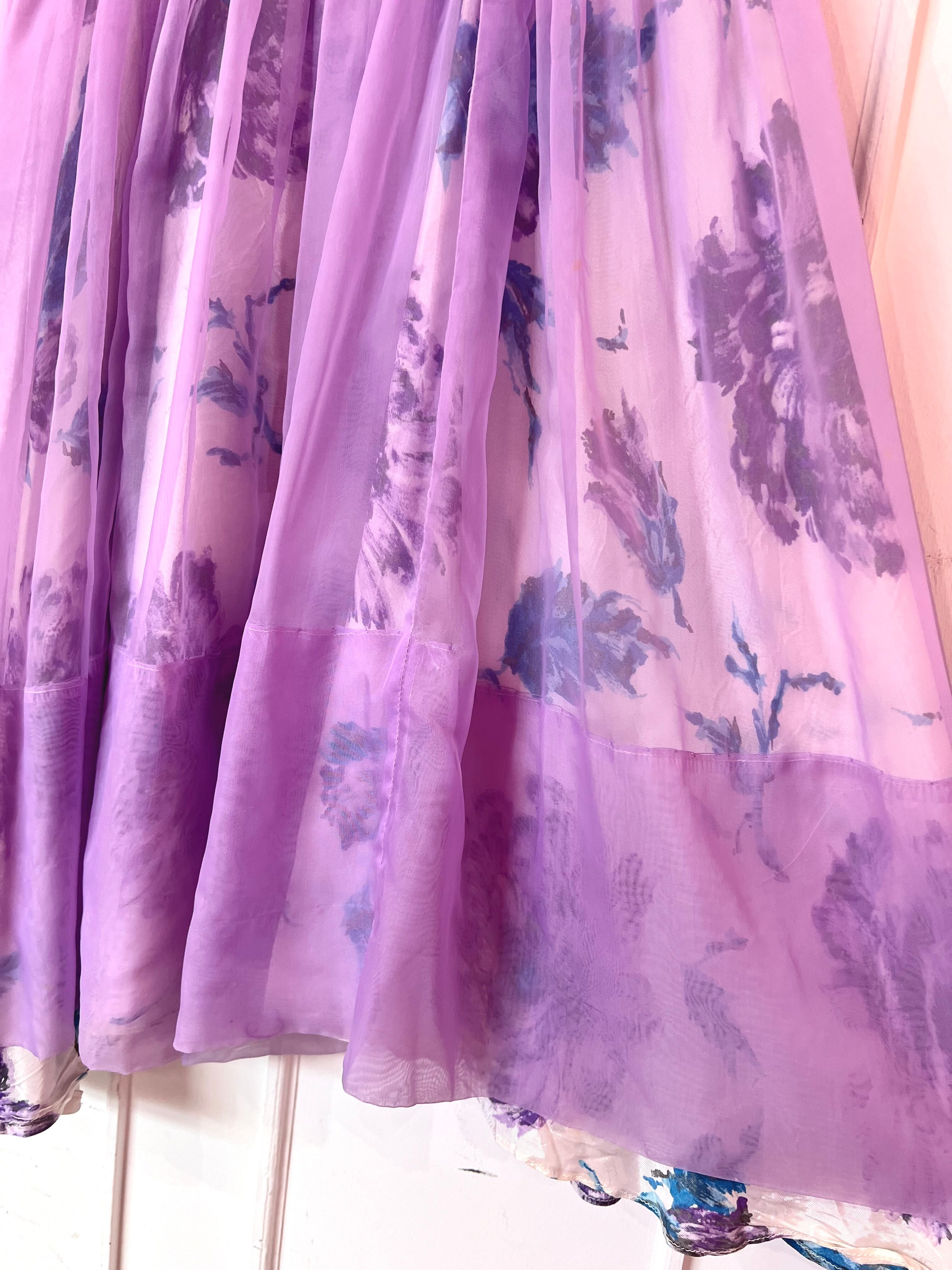 70〜80年代、水色とパープルのお花柄に、パープルのシフォン素材が重ね付けされたパーティードレス♡