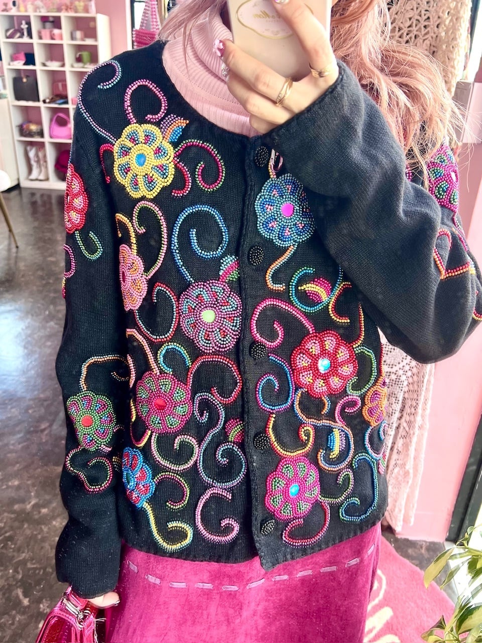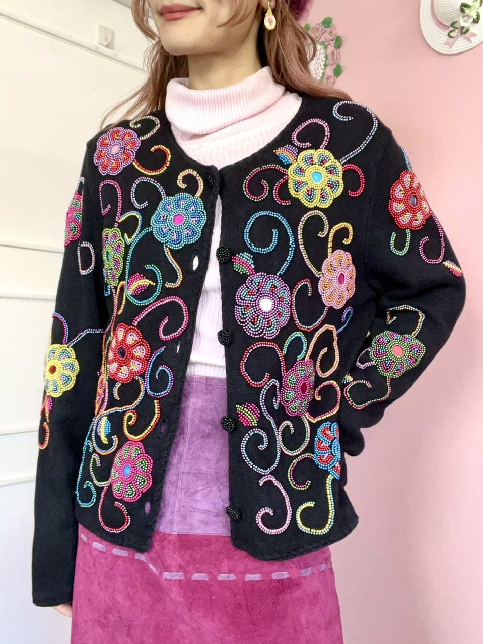 Michel Simon の花柄ビーズニットカーディガン。