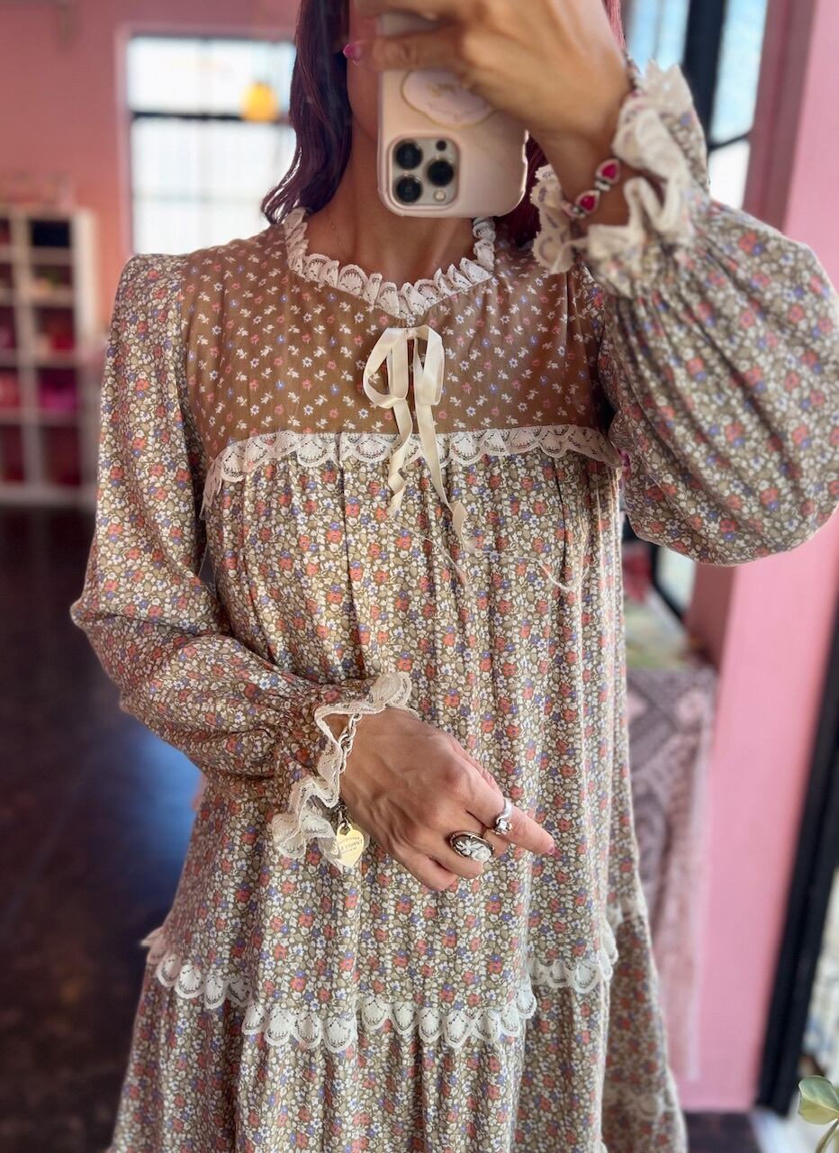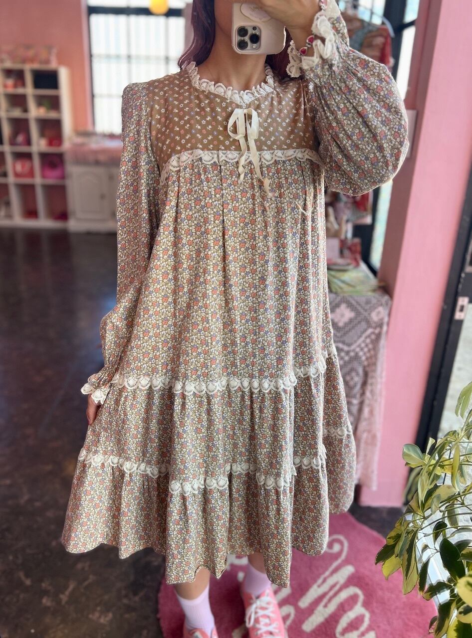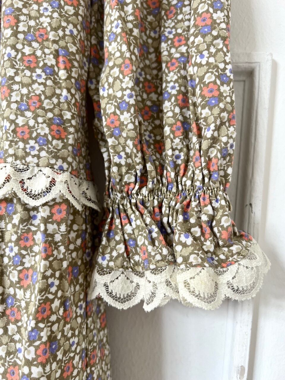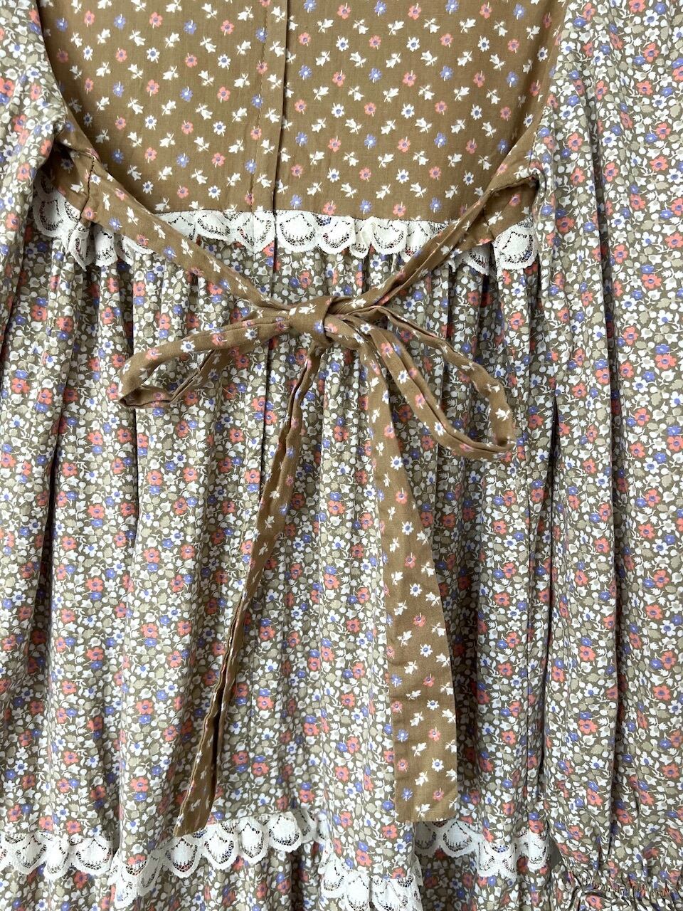 首元や袖にかけてのレースが可愛いらしい、70s花柄ワンピース。フリルでボリュームあるシルエットが可愛いデザインです。