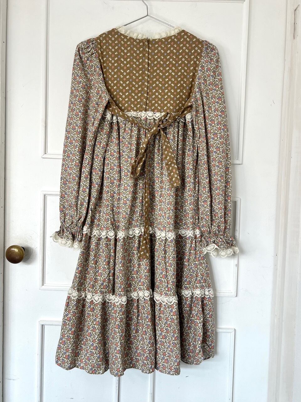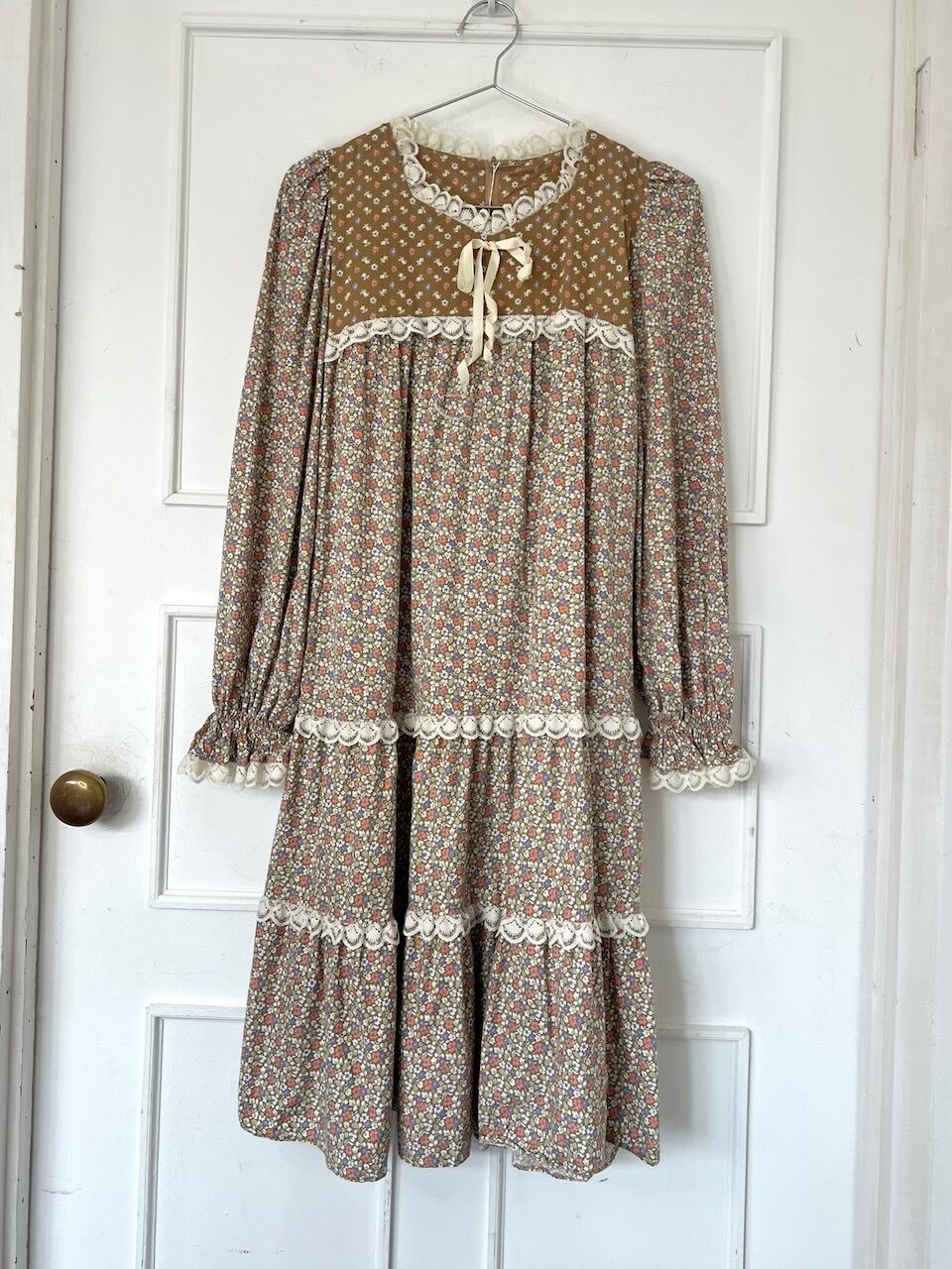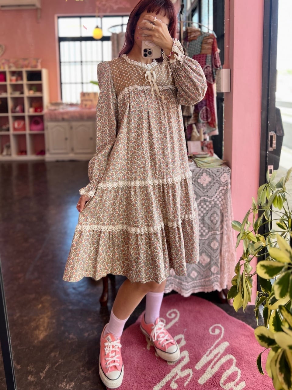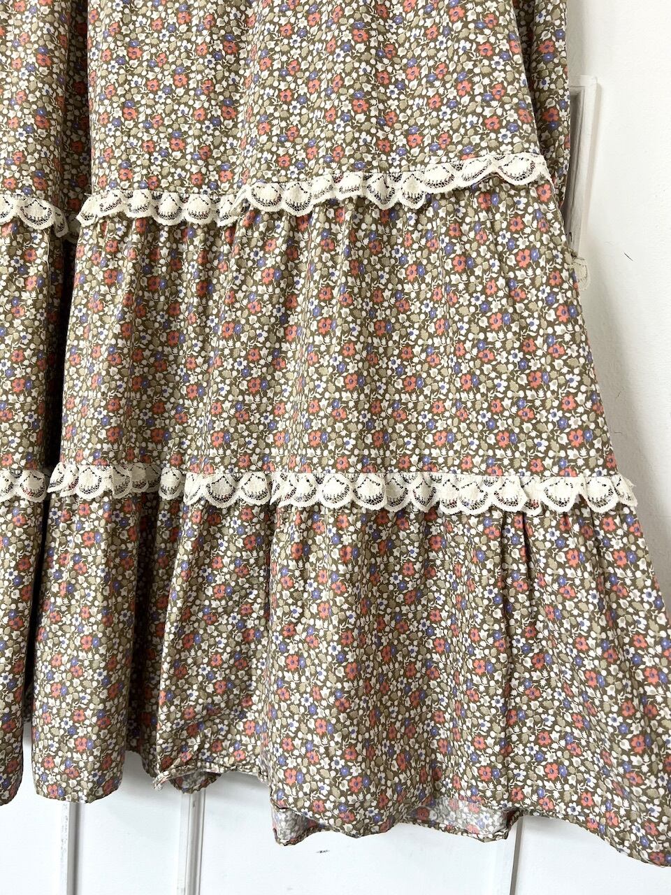 首元や袖にかけてのレースが可愛いらしい、70s花柄ワンピース。フリルでボリュームあるシルエットが可愛いデザインです。