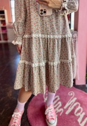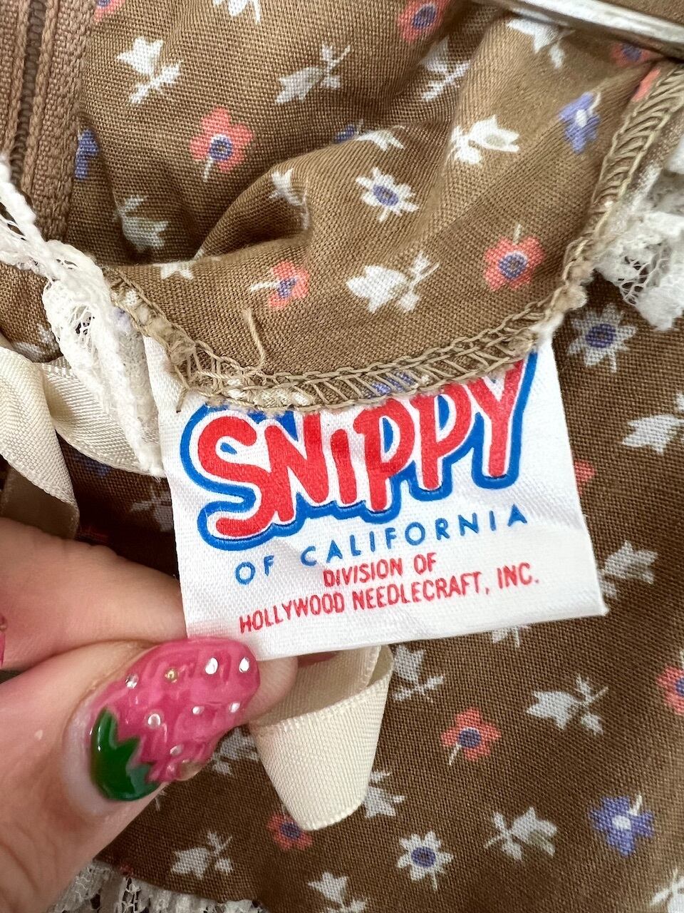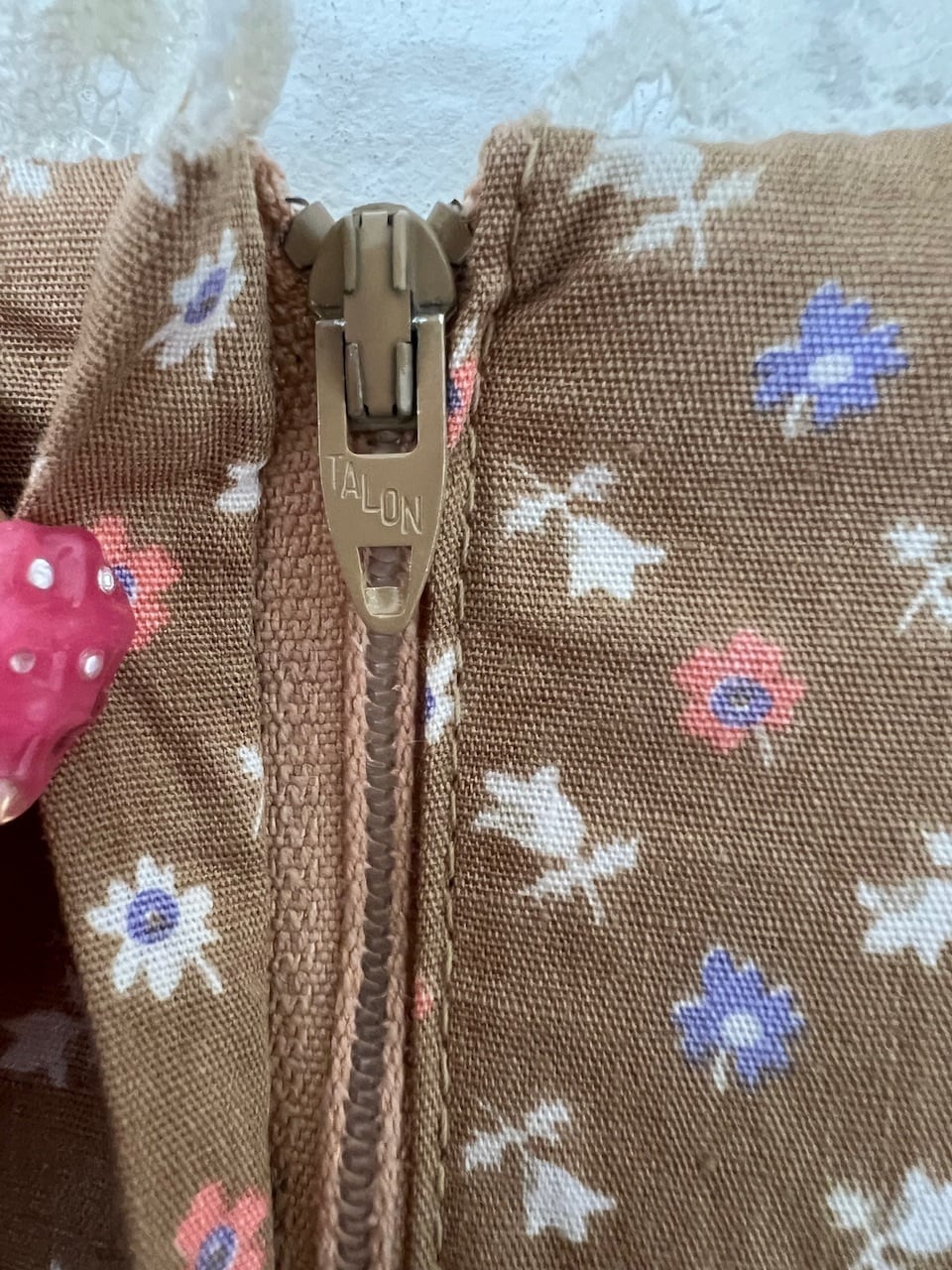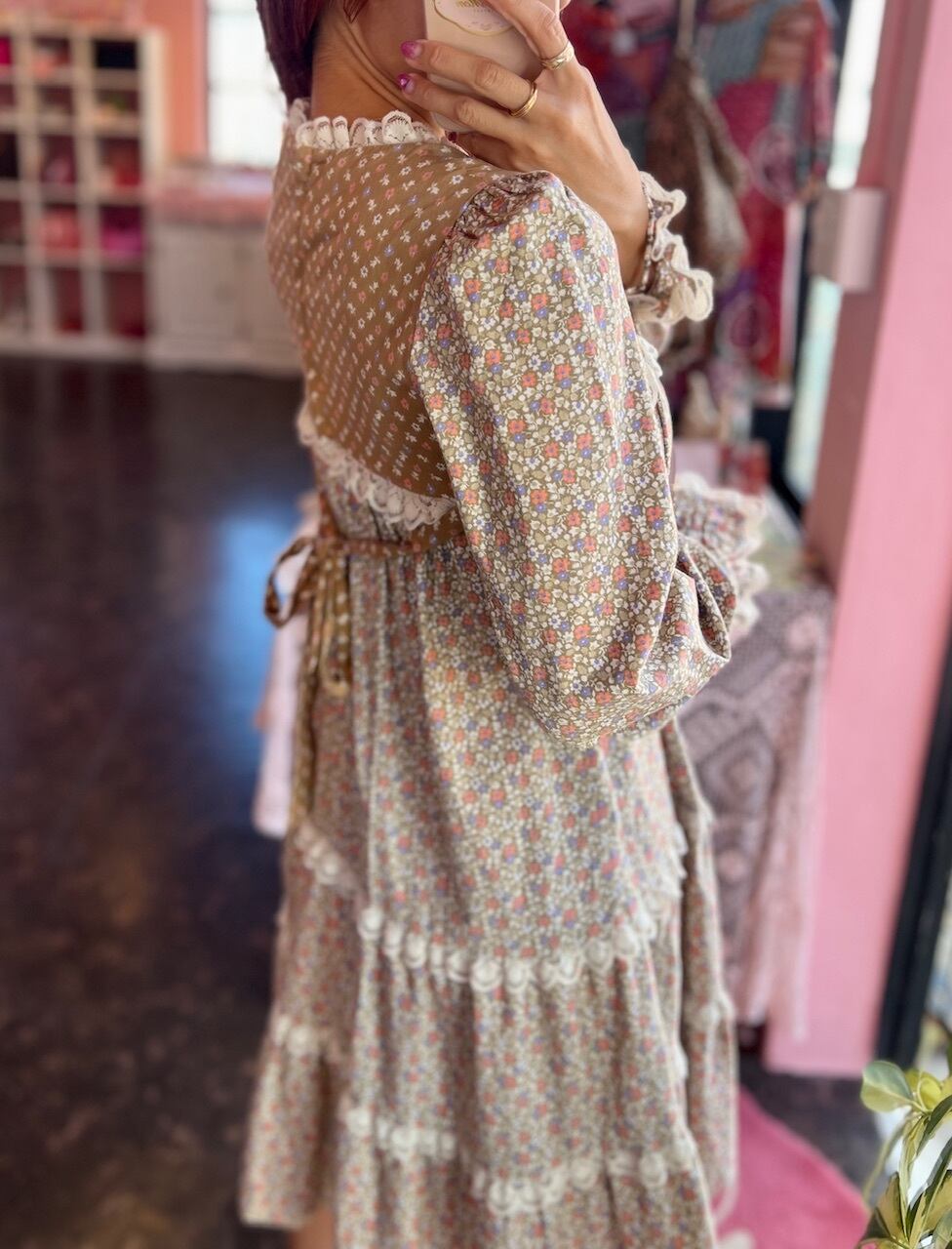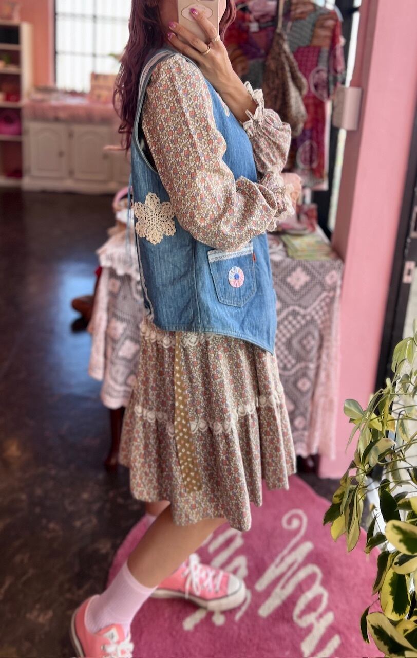 首元や袖にかけてのレースが可愛いらしい、70s花柄ワンピース。フリルでボリュームあるシルエットが可愛いデザインです。