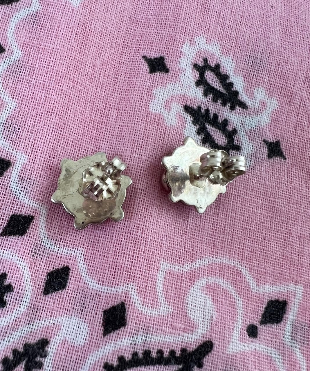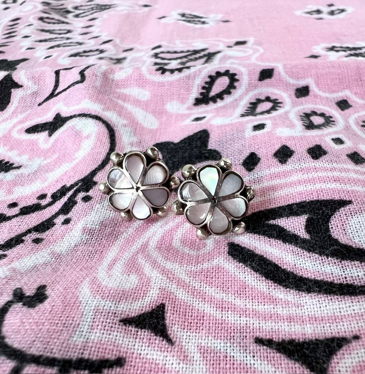 ピンクシェル×スターリングシルバーのズニ族お花模様のピアスです。