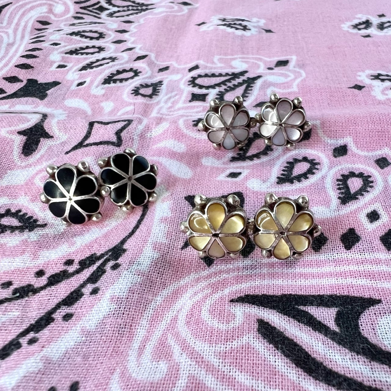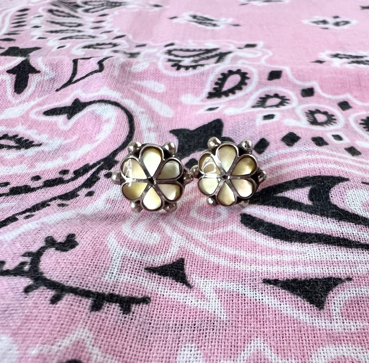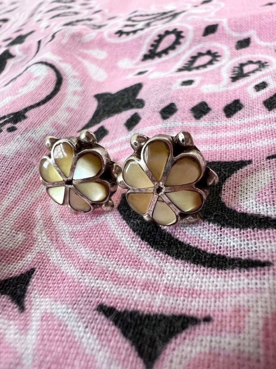イエローシェル×スターリングシルバーのズニ族お花模様のピアスです。