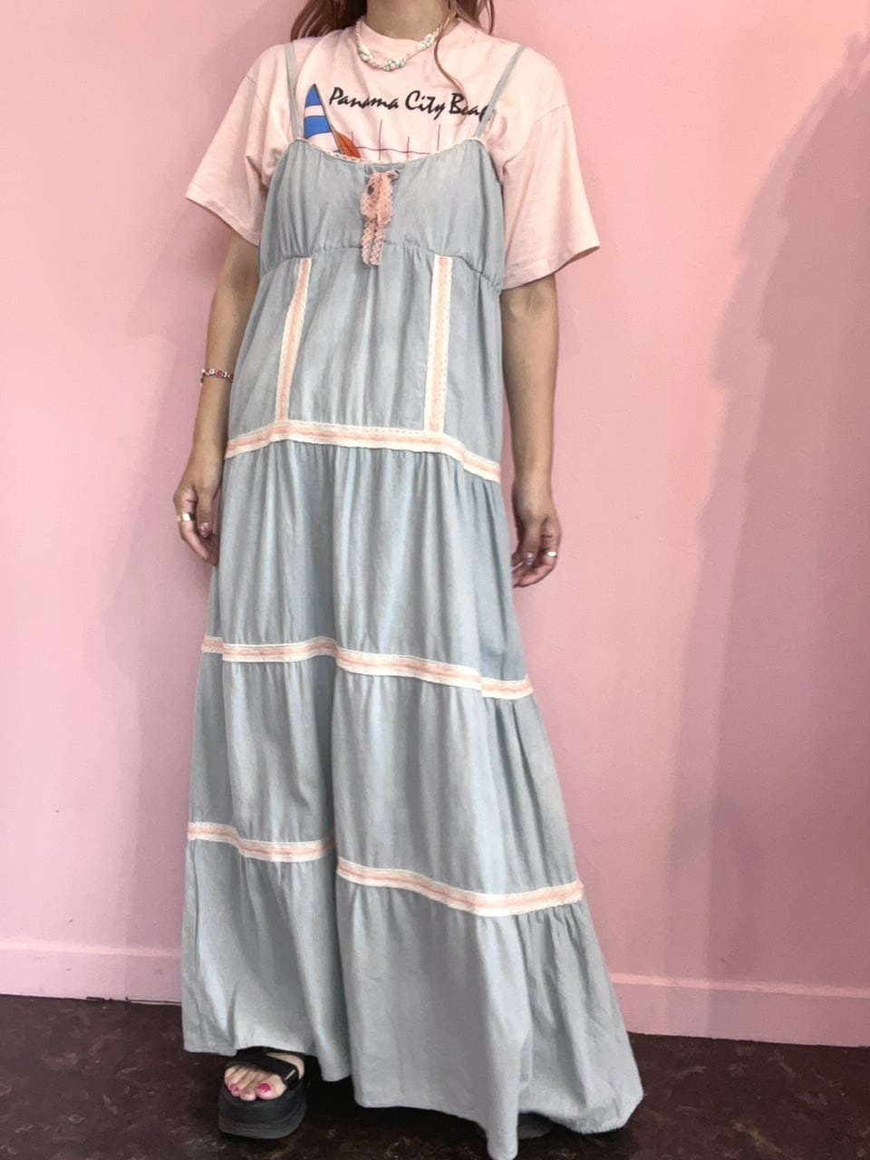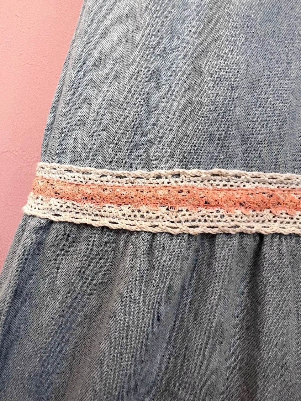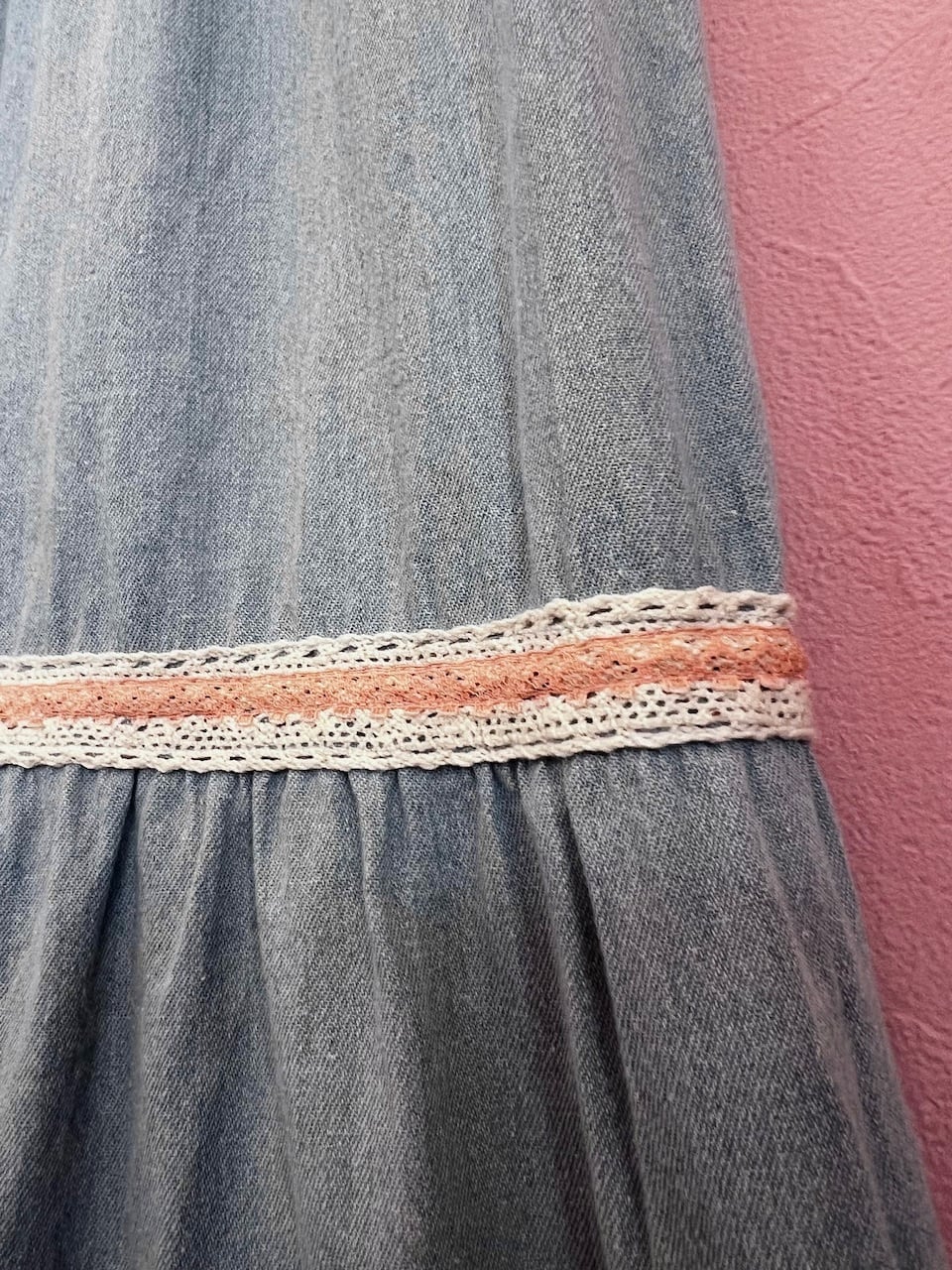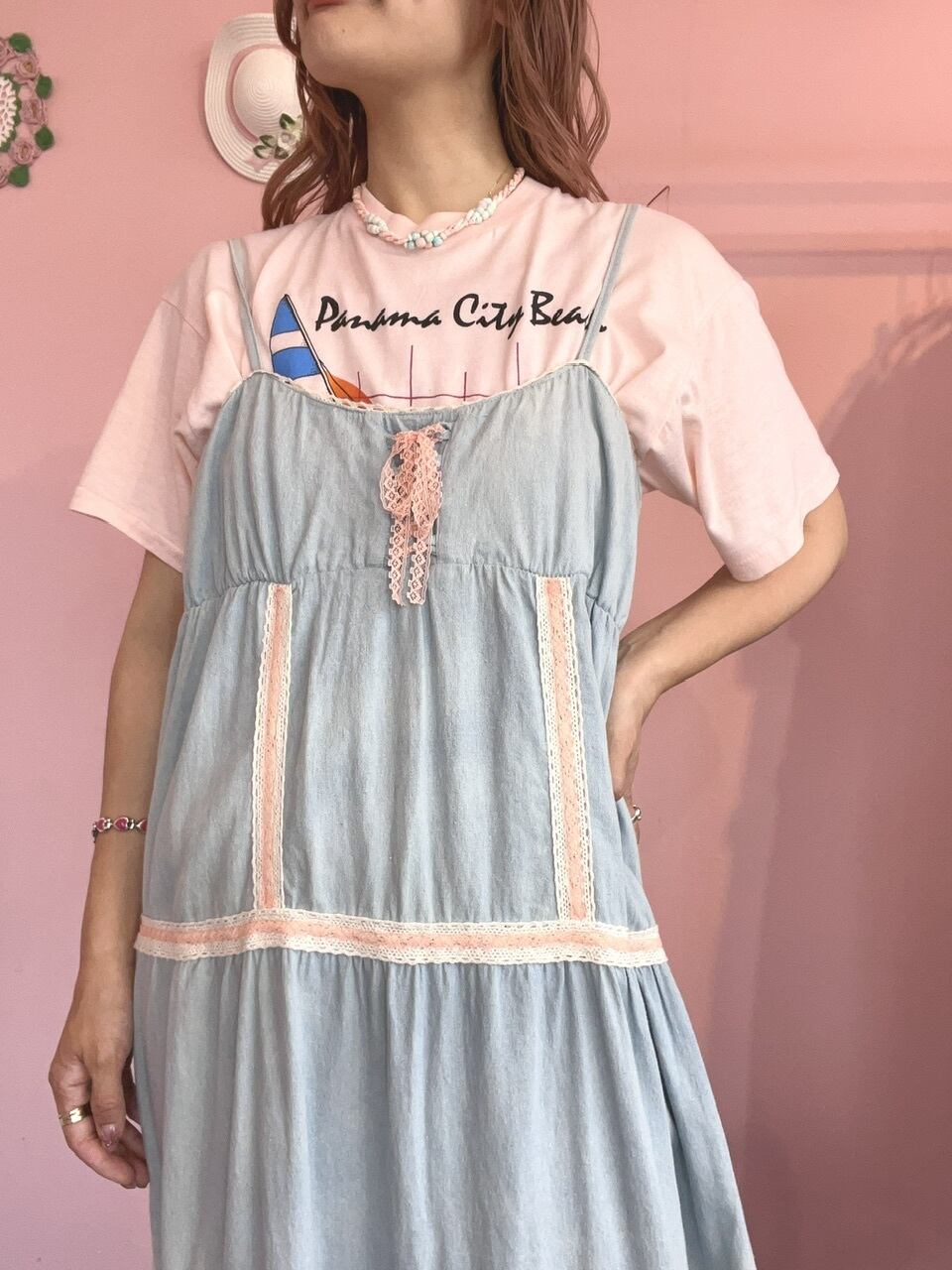 レースのテープリボンがデザインされているデニムワンピースに、ヴィンテージピンクレースを重ねました♡