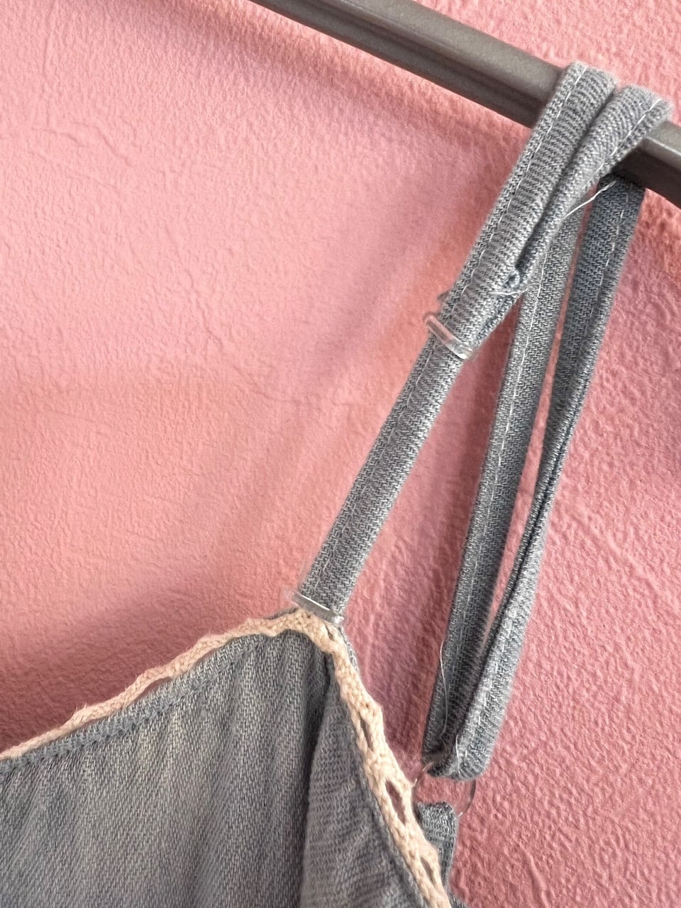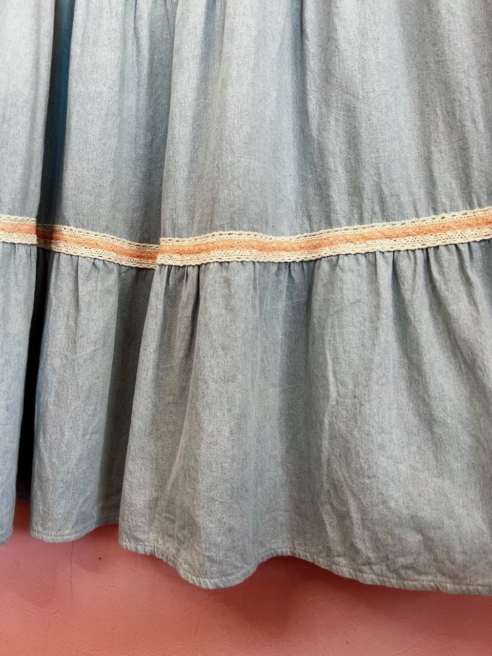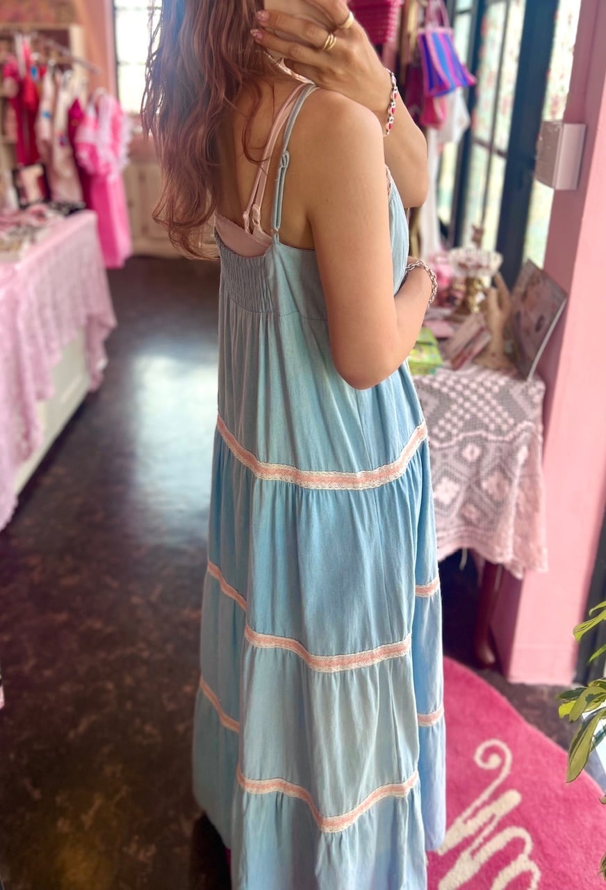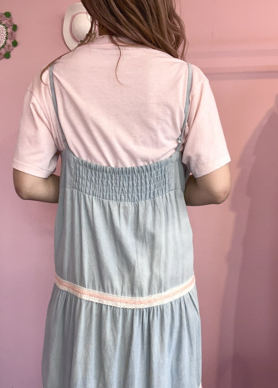 レースのテープリボンがデザインされているデニムワンピースに、ヴィンテージピンクレースを重ねました♡