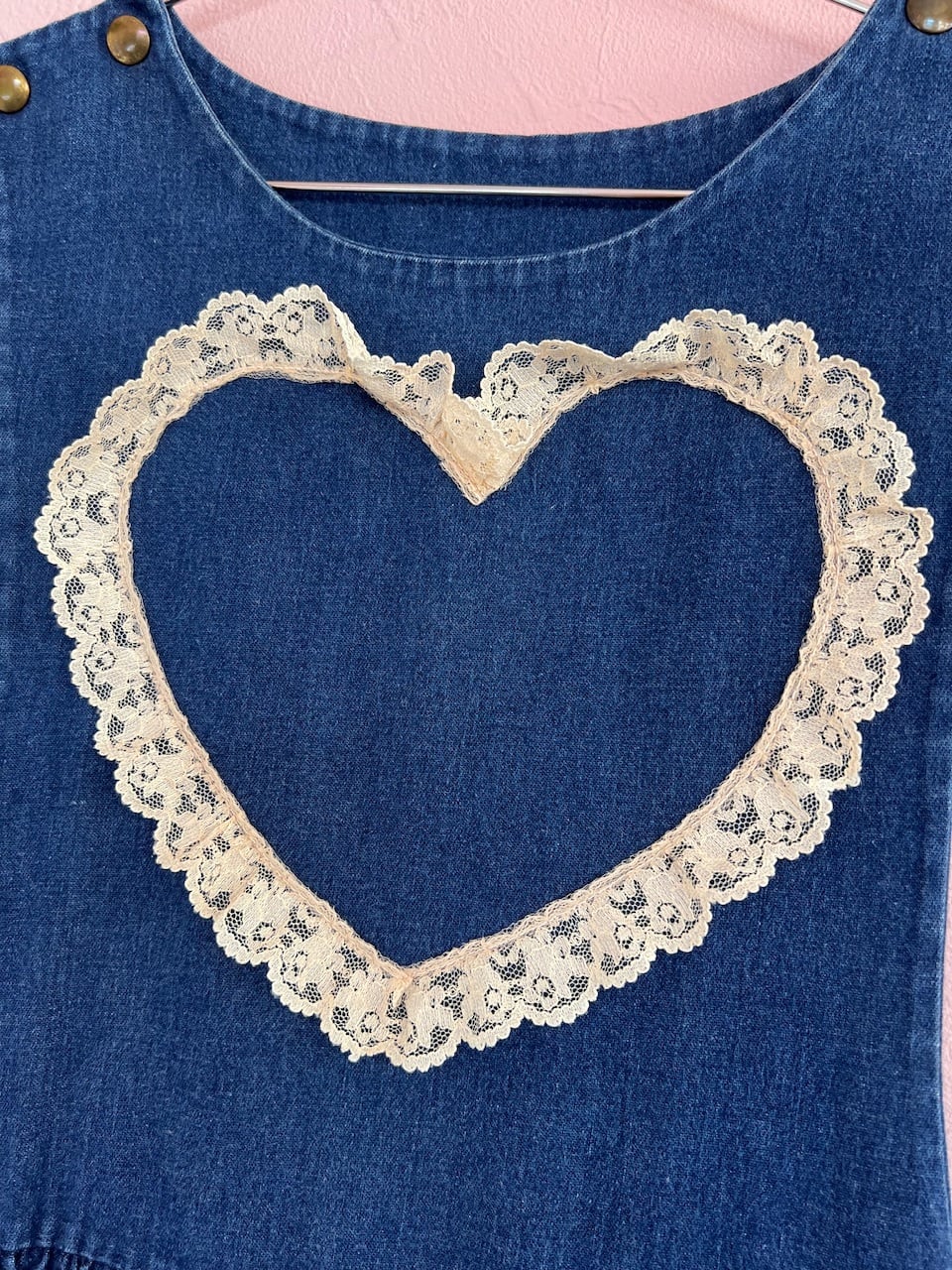 サイドがスナップボタンになっているエプロン風なデニムワンピースに、プチリメイクでヴィンテージレースのハートが真ん中に施されています♡