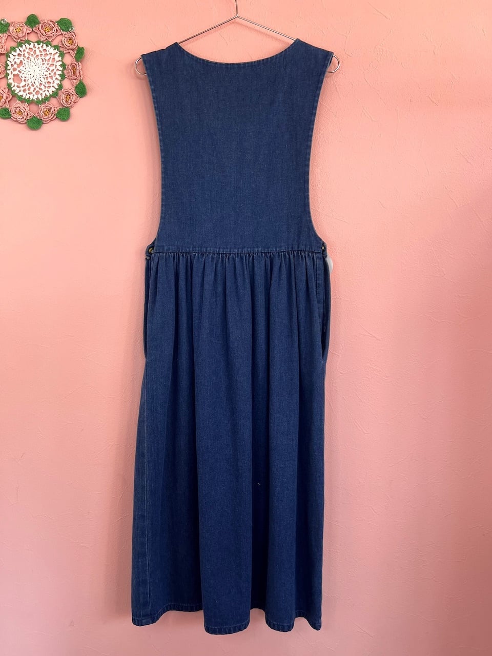 肩がスナップになっているエプロン風な形が可愛いデニムワンピース。