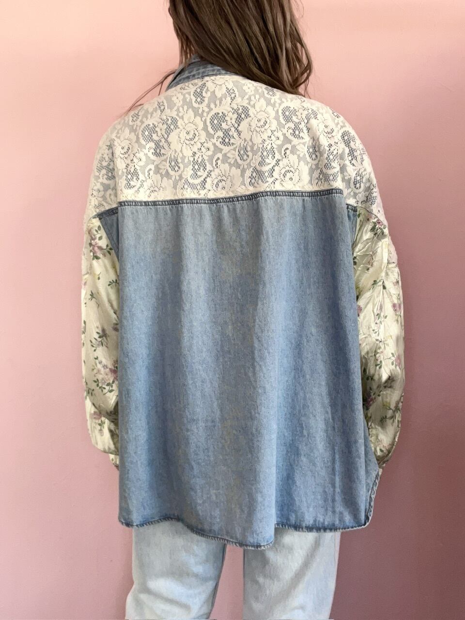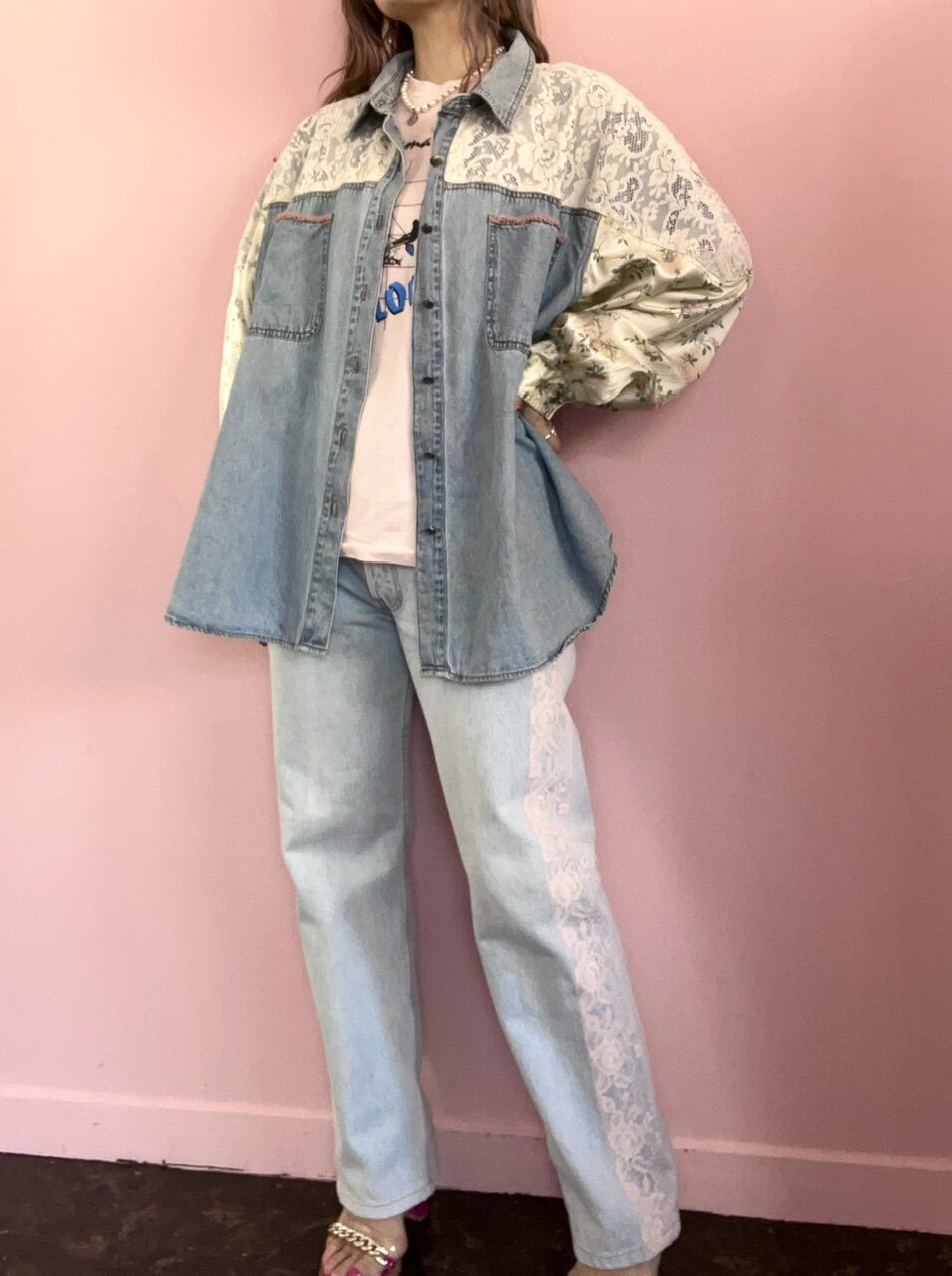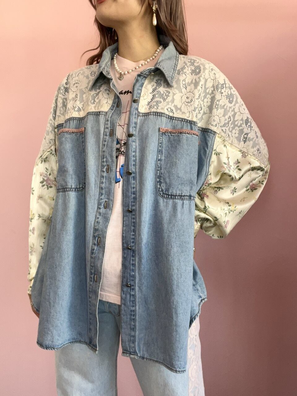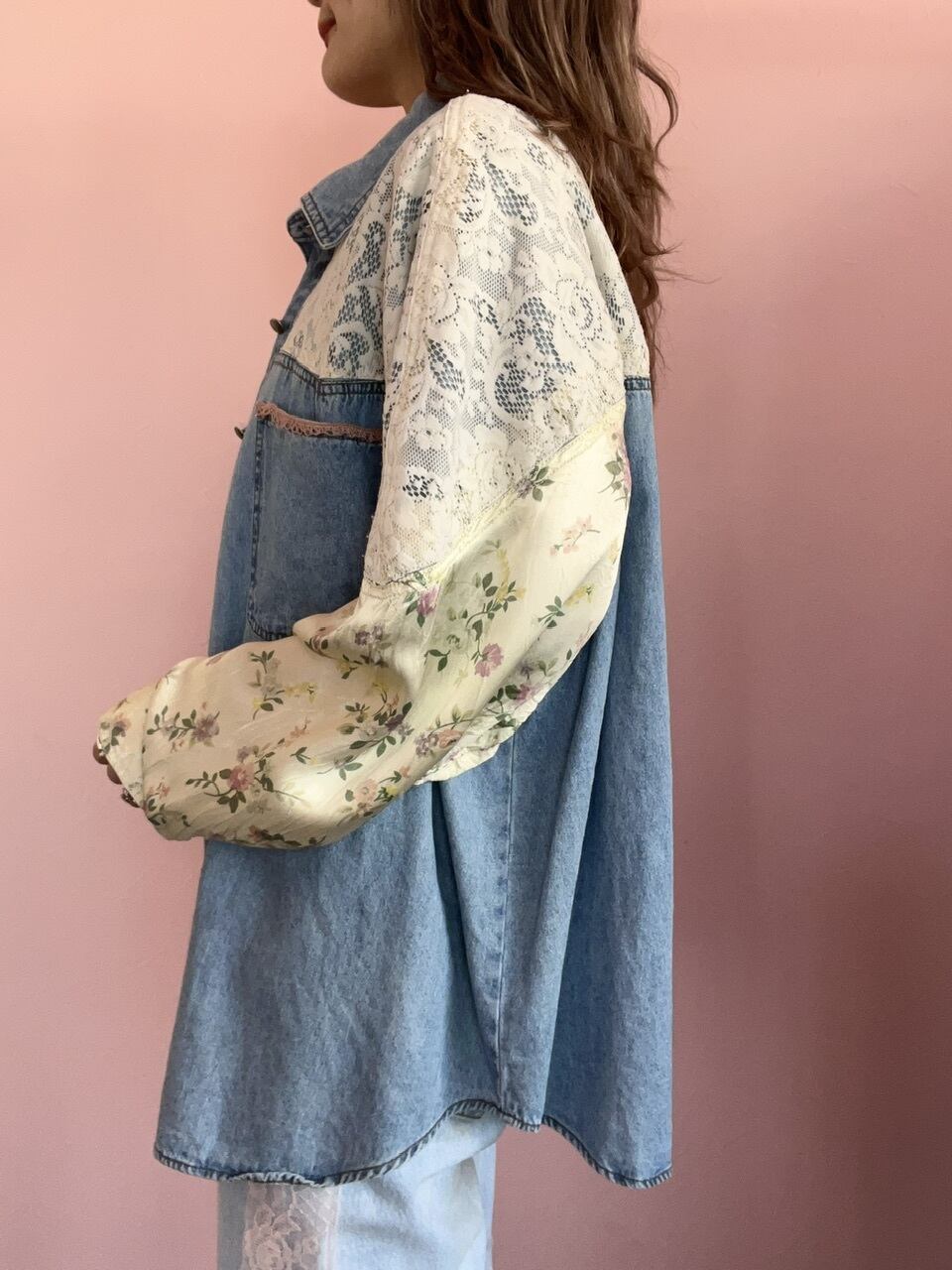 ビッグシルエットのデニムシャツで袖、首元がリメイクされています。肩にはレース、袖は花柄で、サテンのような光沢感ある素材です。ポケットにはアメリカで買い付けてきたヴィンテージレースが施されています。コンチョボタンがワンポイント。