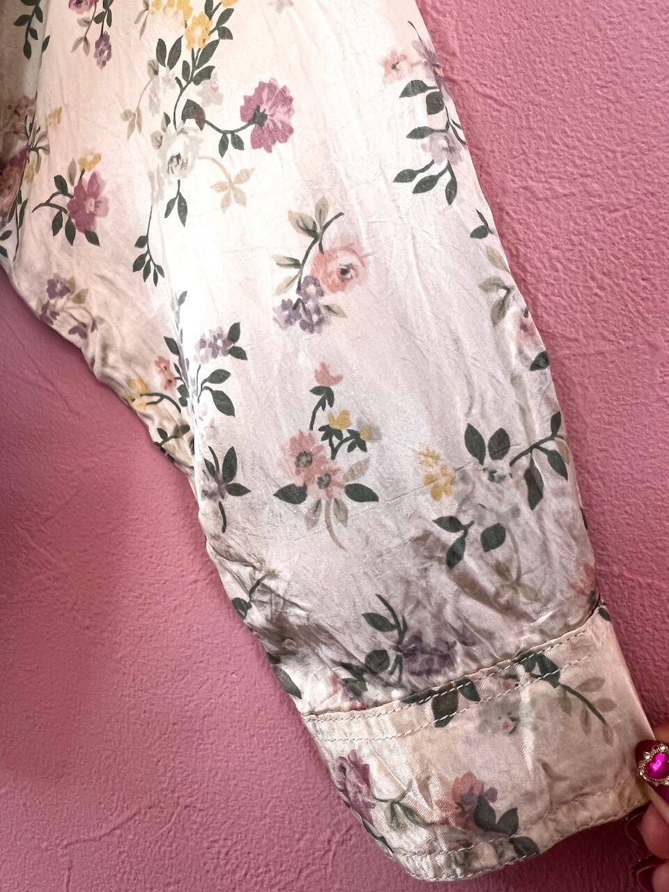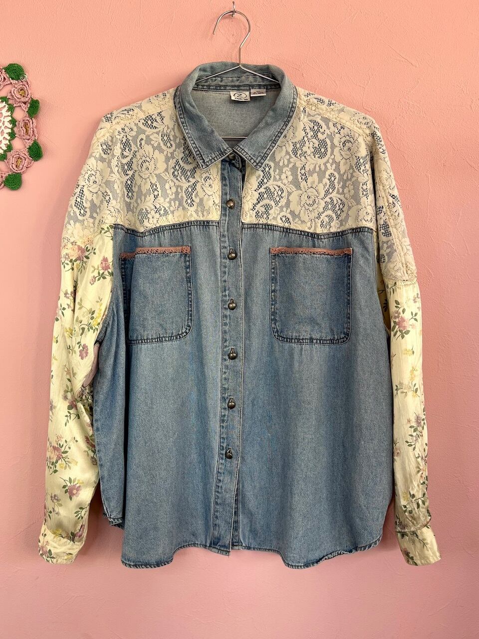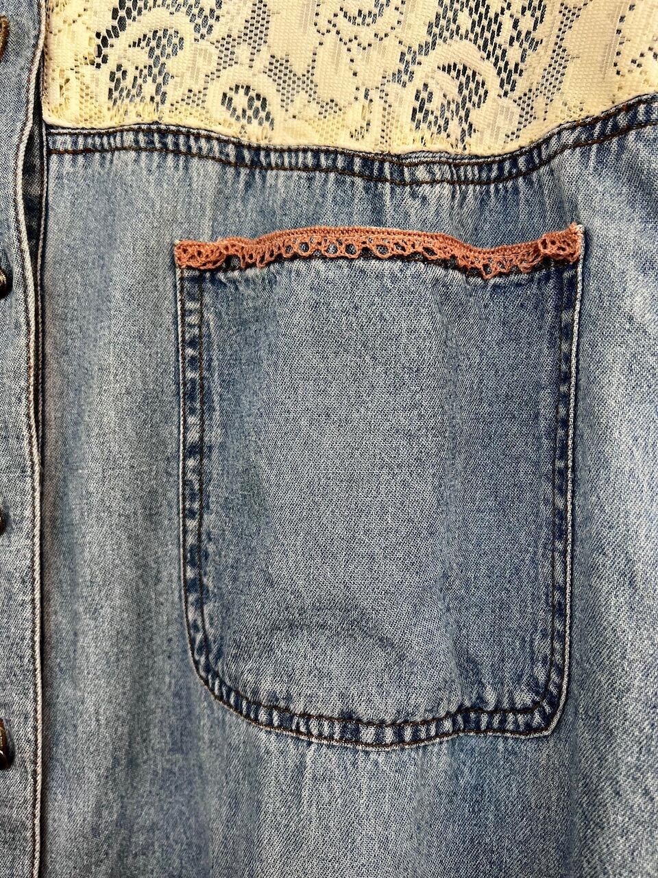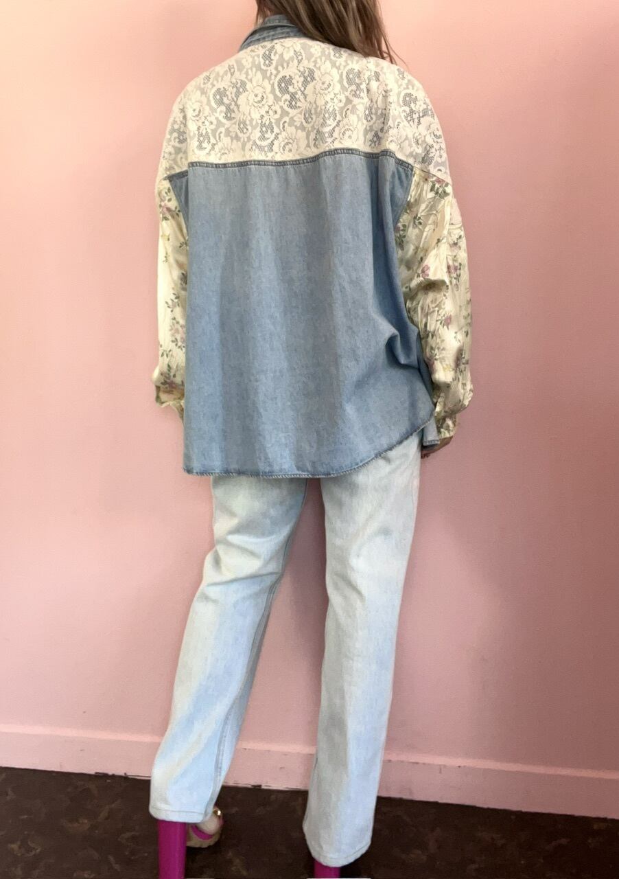 ビッグシルエットのデニムシャツで袖、首元がリメイクされています。肩にはレース、袖は花柄で、サテンのような光沢感ある素材です。ポケットにはアメリカで買い付けてきたヴィンテージレースが施されています。コンチョボタンがワンポイント。