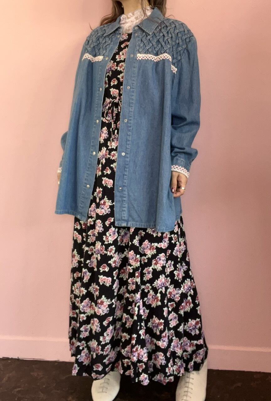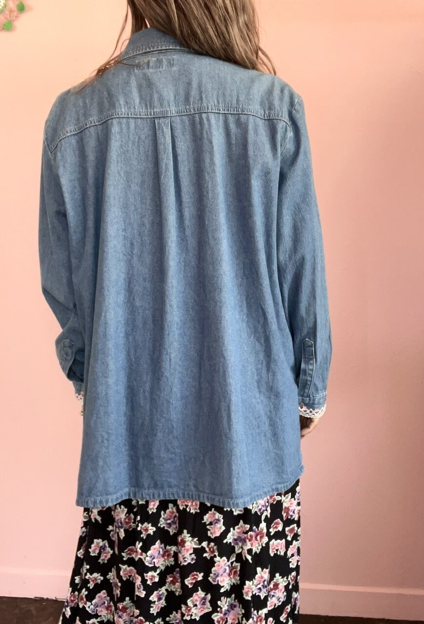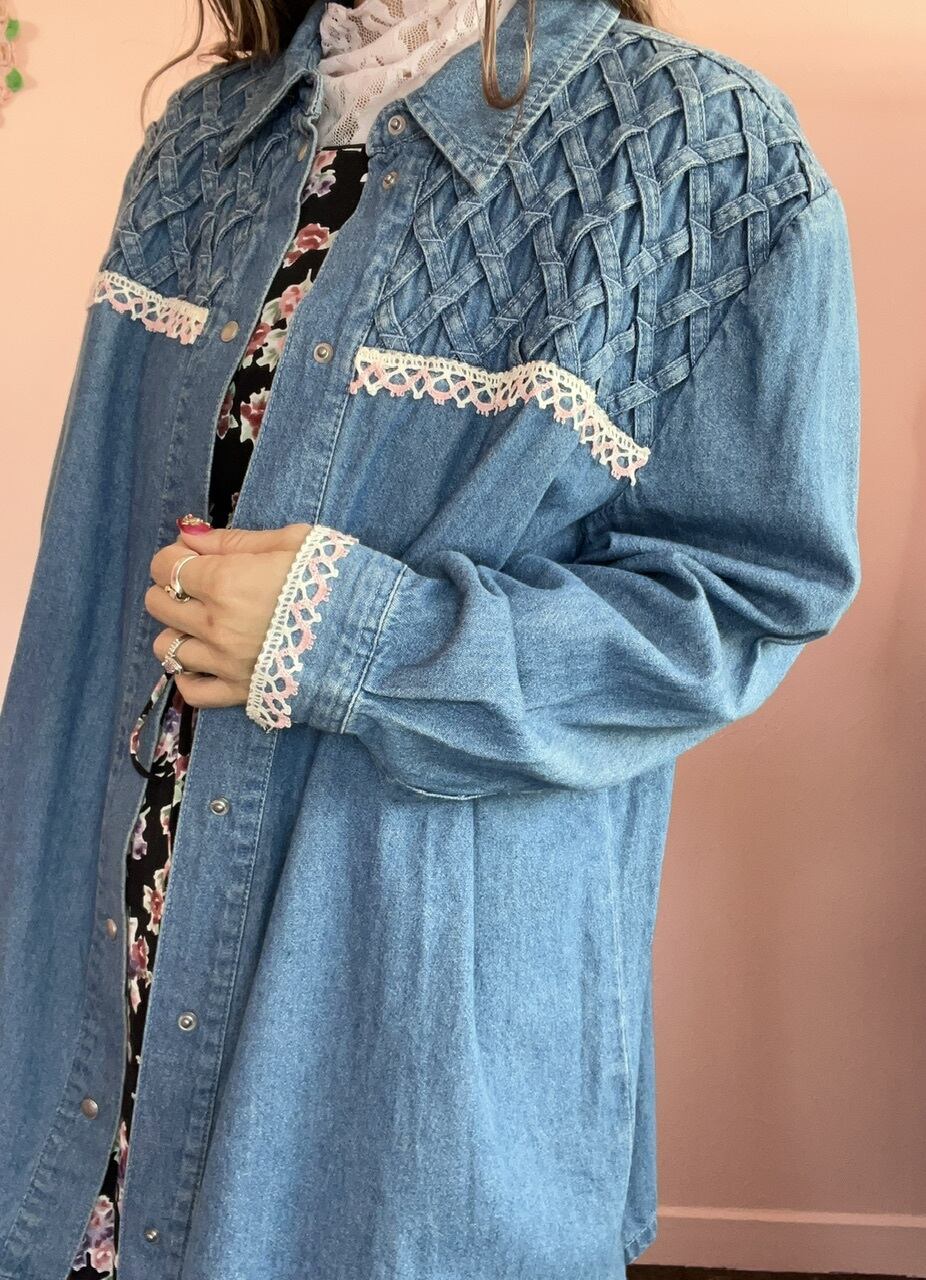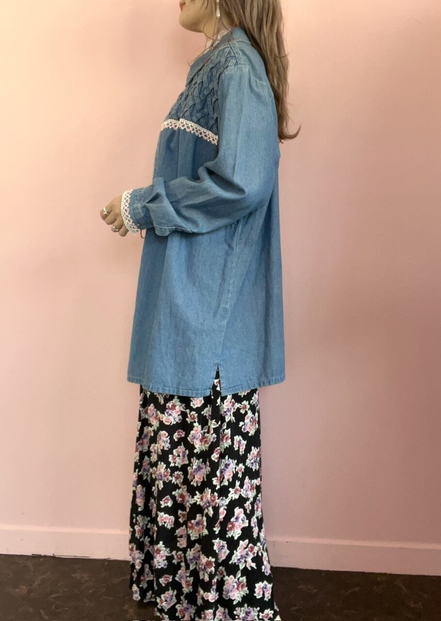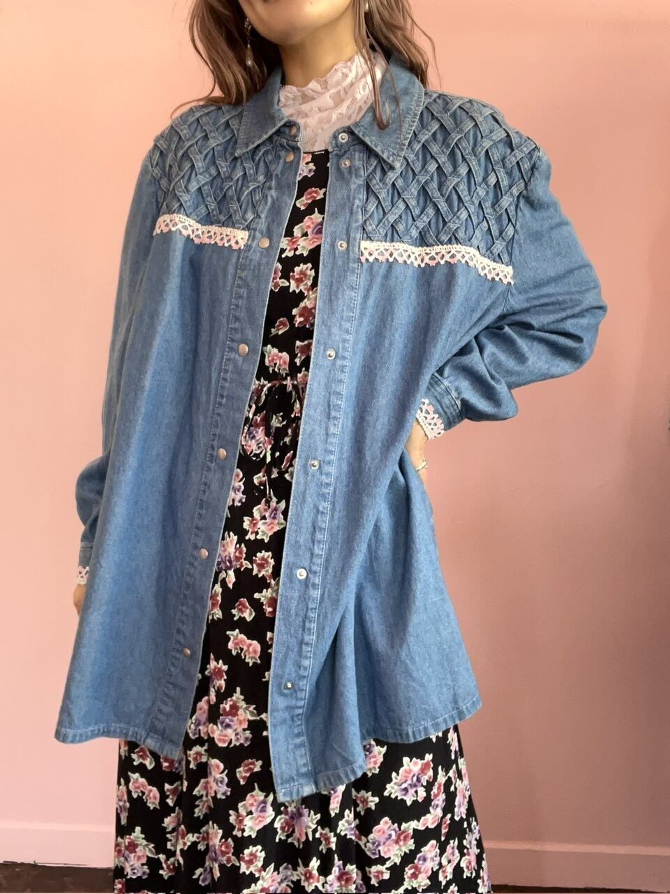 胸元の立体感あるデザイン素敵なデニムシャツにヴィンテージのレースを付けたデザインです。