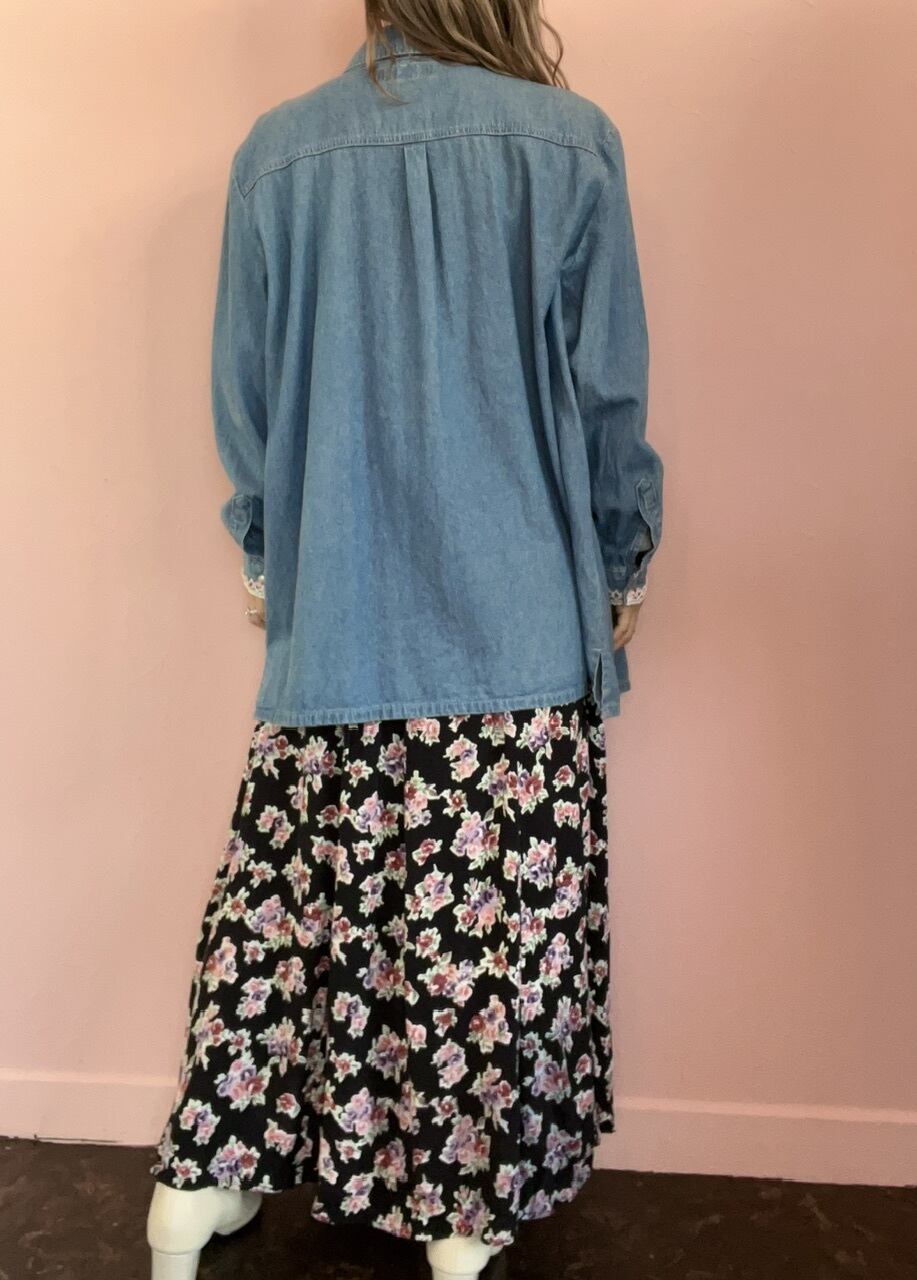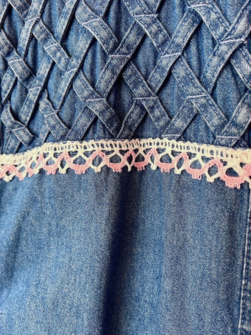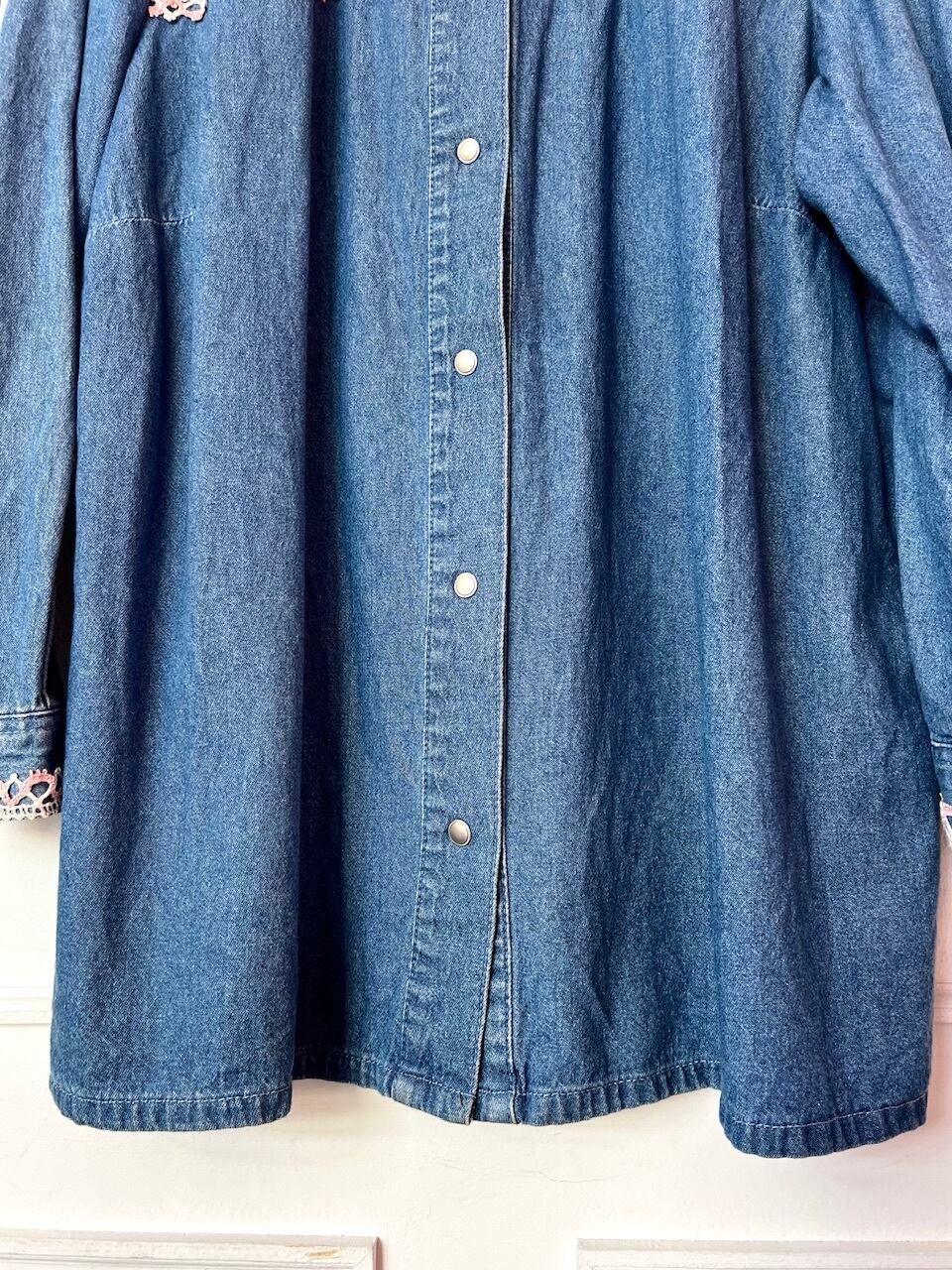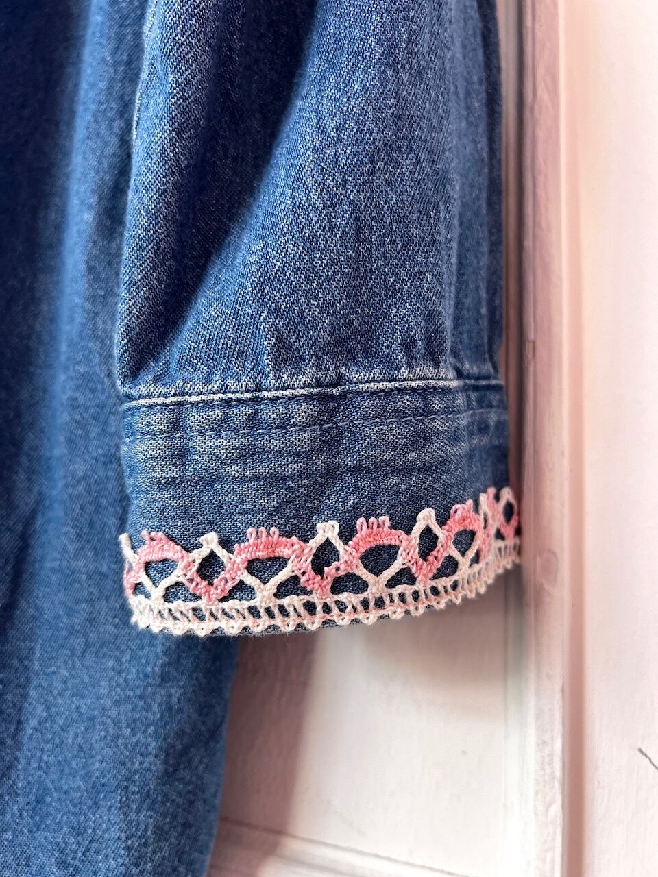 胸元の立体感あるデザイン素敵なデニムシャツにヴィンテージのレースを付けたデザインです。
