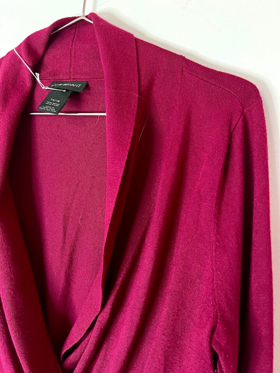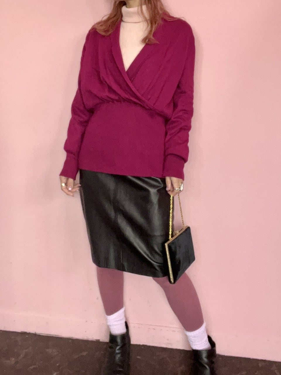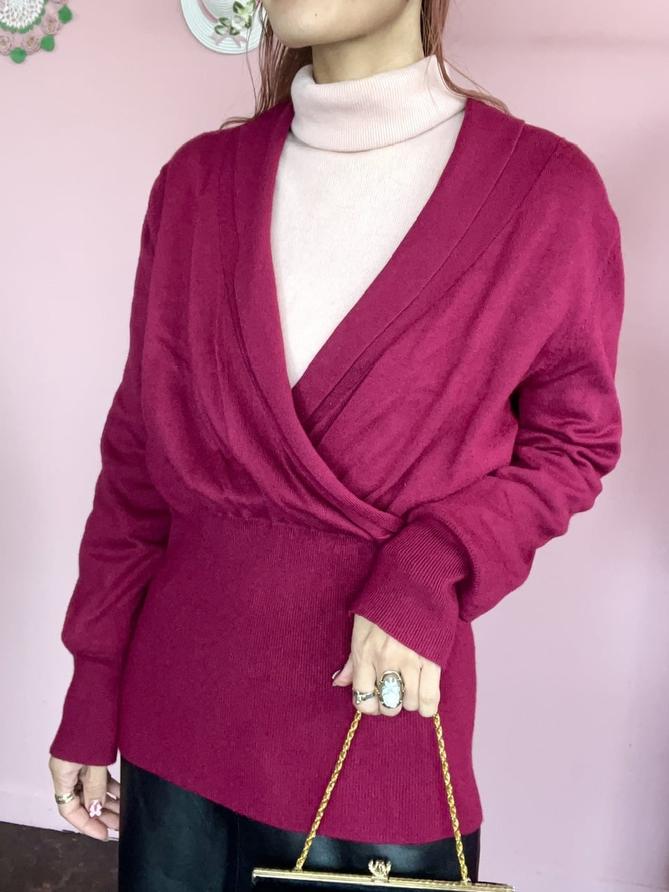 胸元が大きくクロスされているデザインが珍しいニットトップス。ウエストは絞られていて、スッキリと見せてくれます。