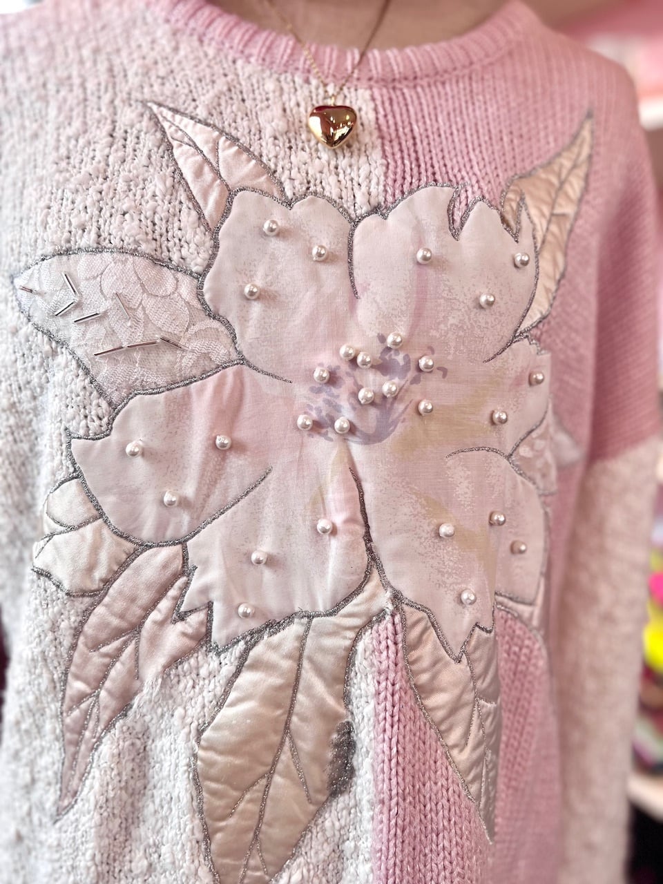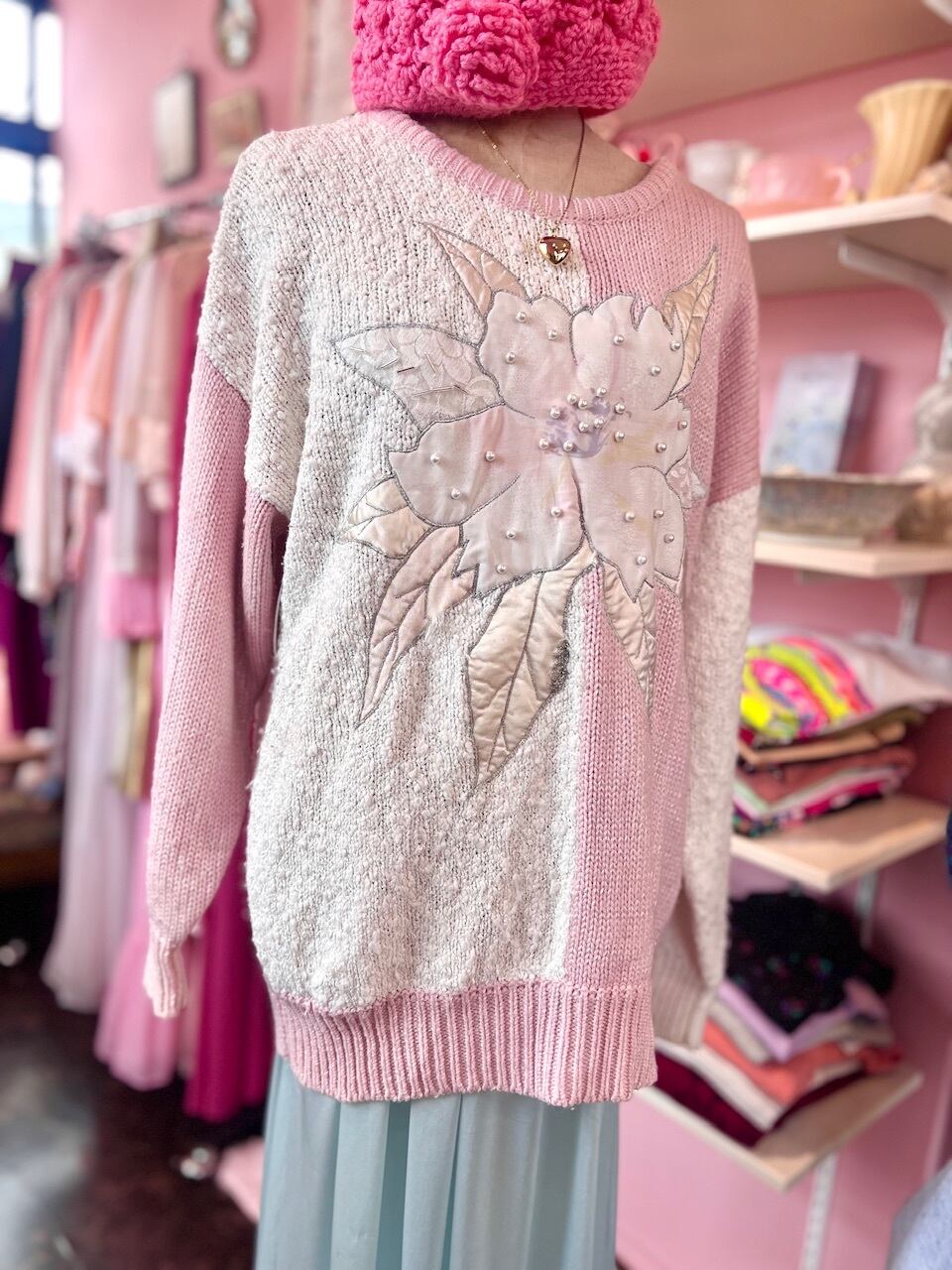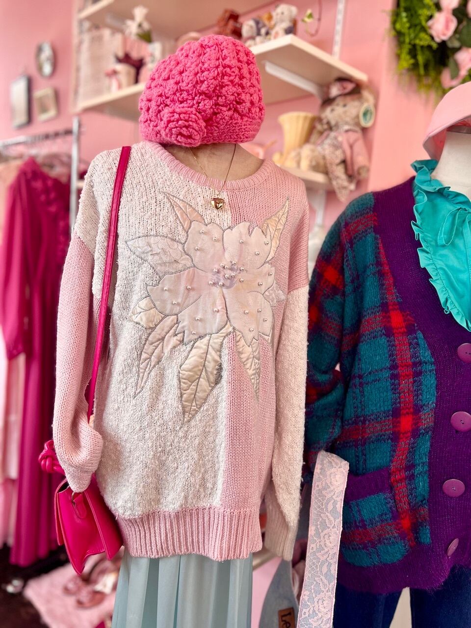 真ん中にお花のデザインが施されているデザインが素敵なニットトップス♡