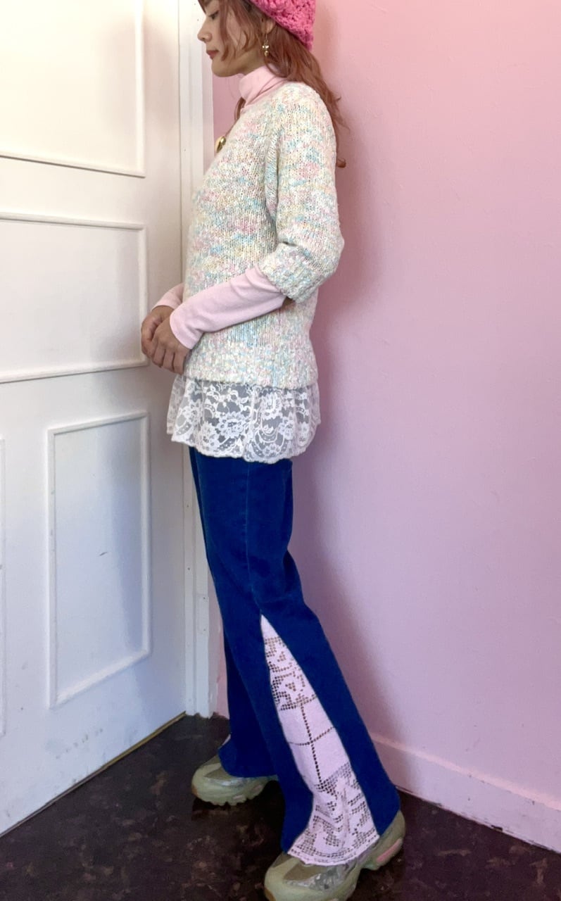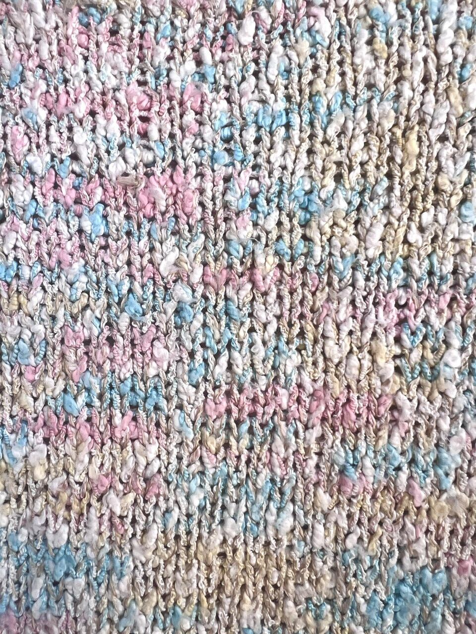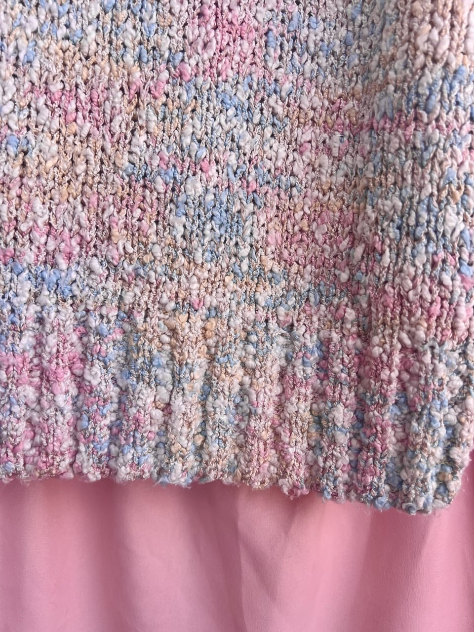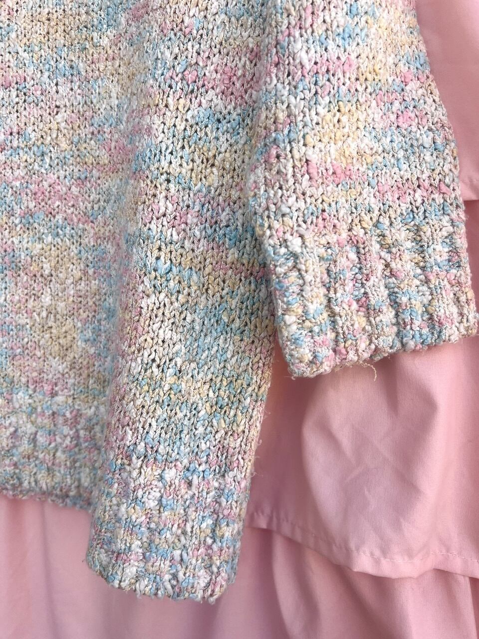 MIX柄で、ブルー、ピンク、ベージュ、ホワイトの3つのカラーで編まれています。