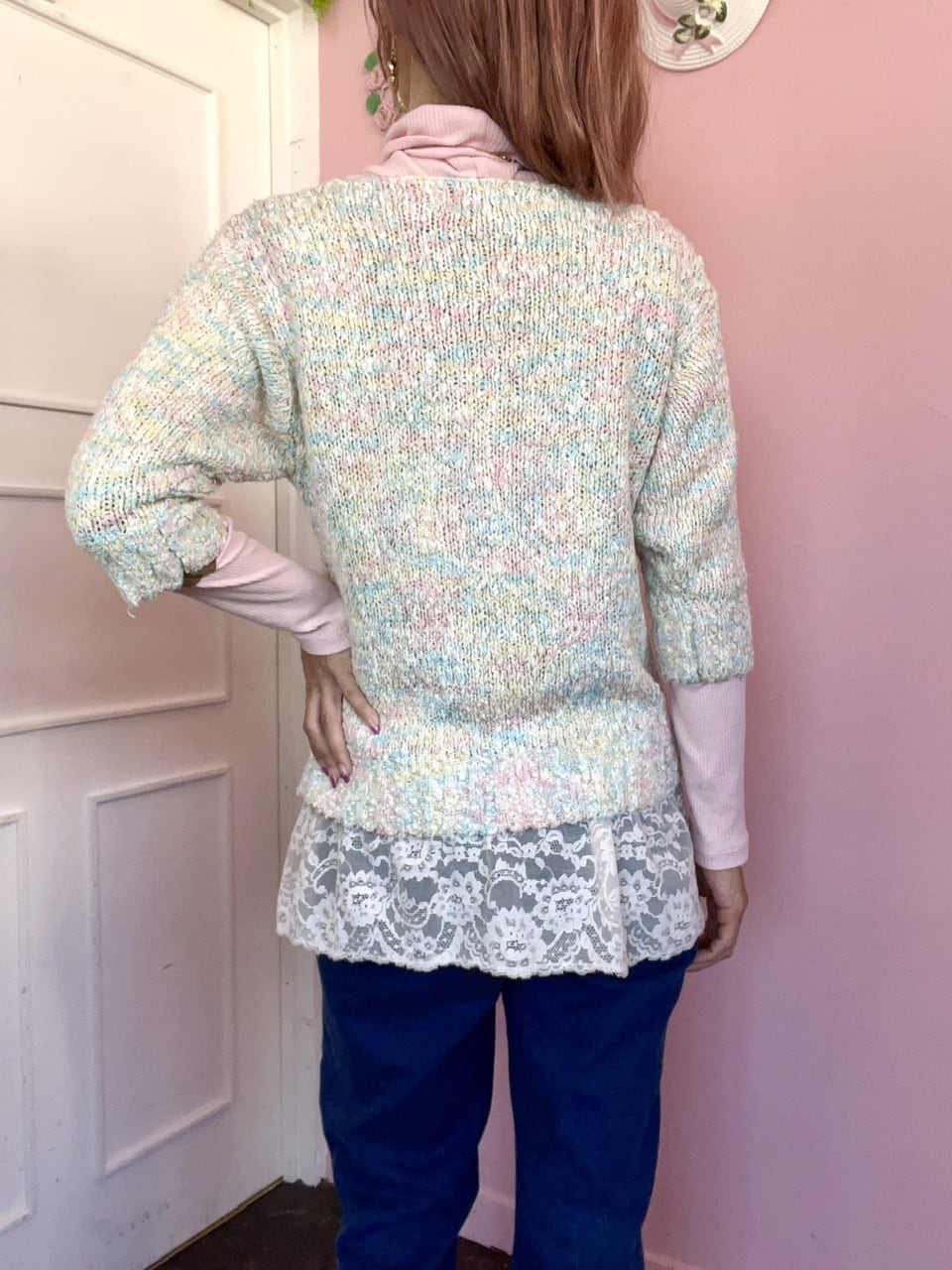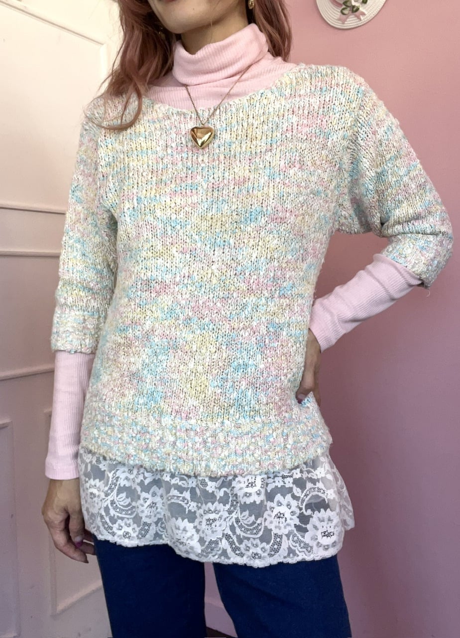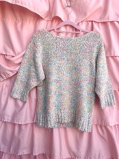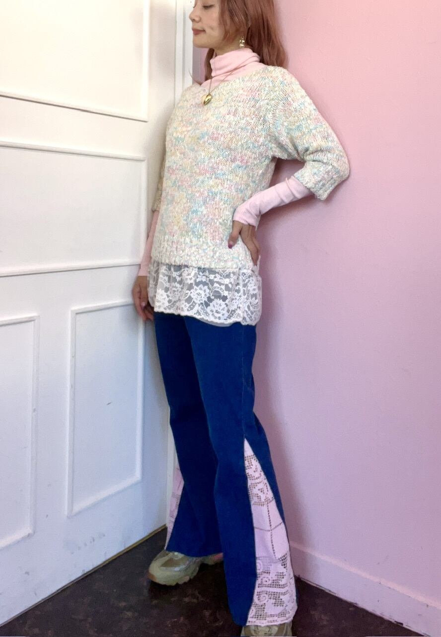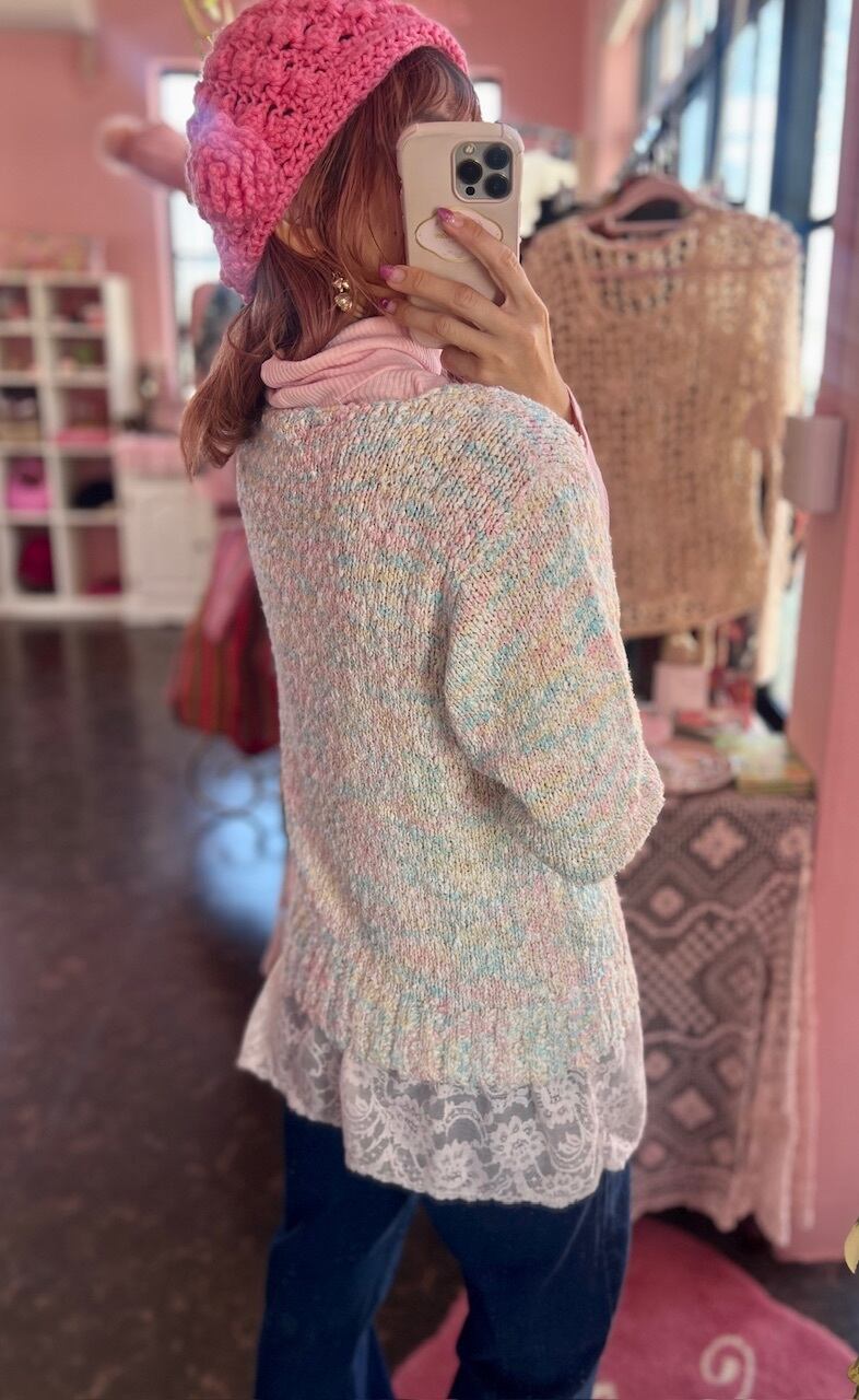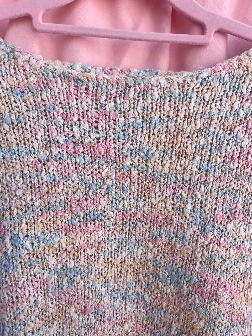 MIX柄で、ブルー、ピンク、ベージュ、ホワイトの3つのカラーで編まれています。