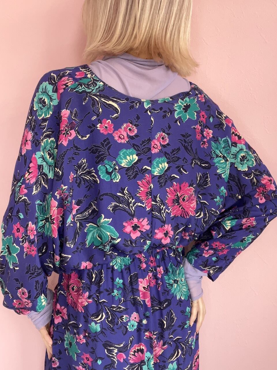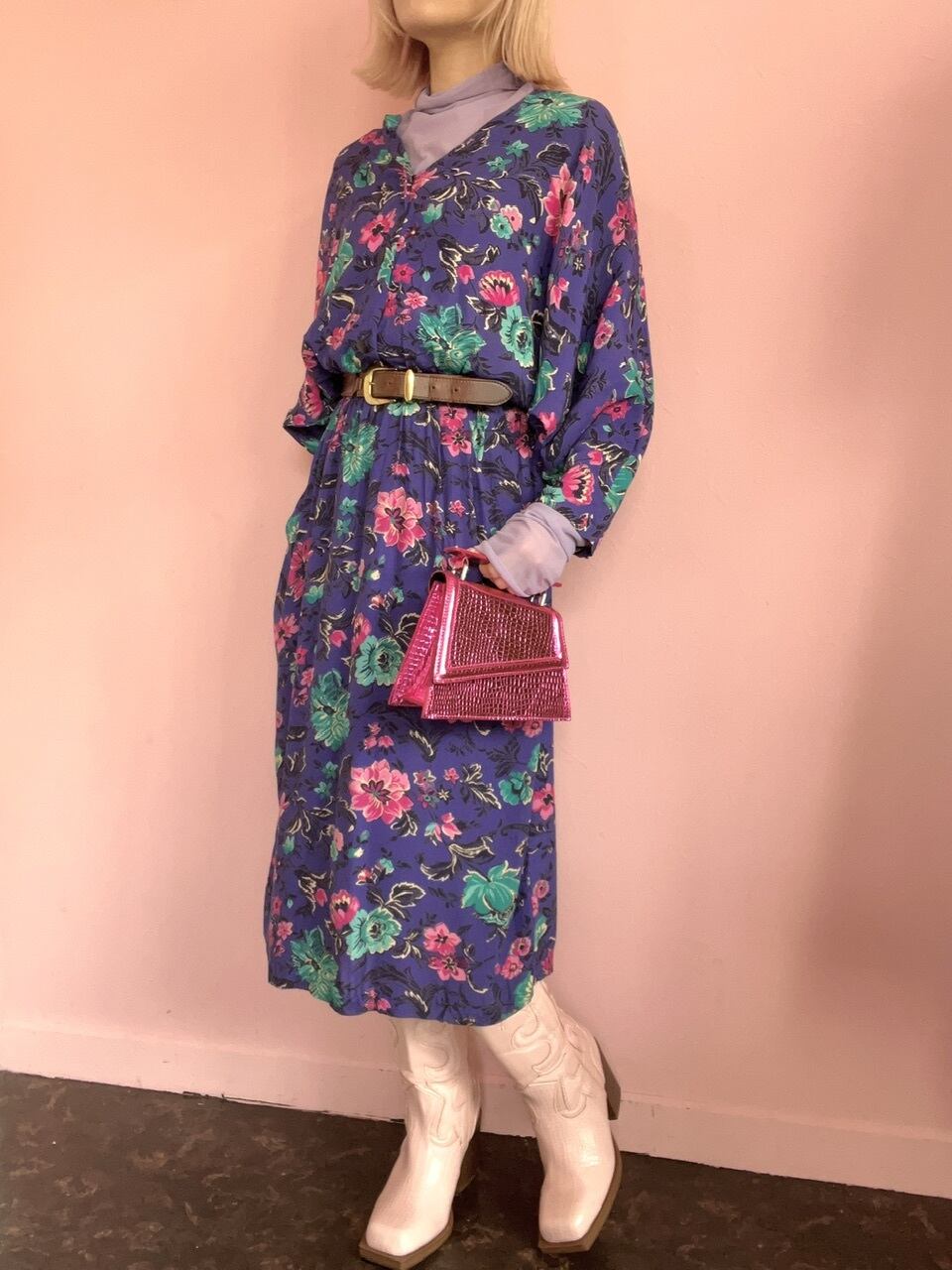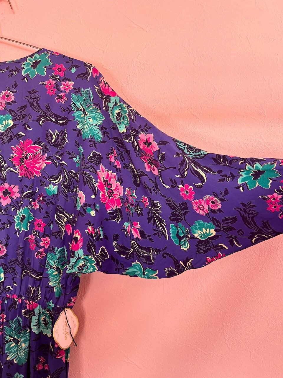 パープルカラーにピンクのお花柄が80sらしいワンピース。ドルマンスリーブでゆるっとしたシルエットが可愛いです♡