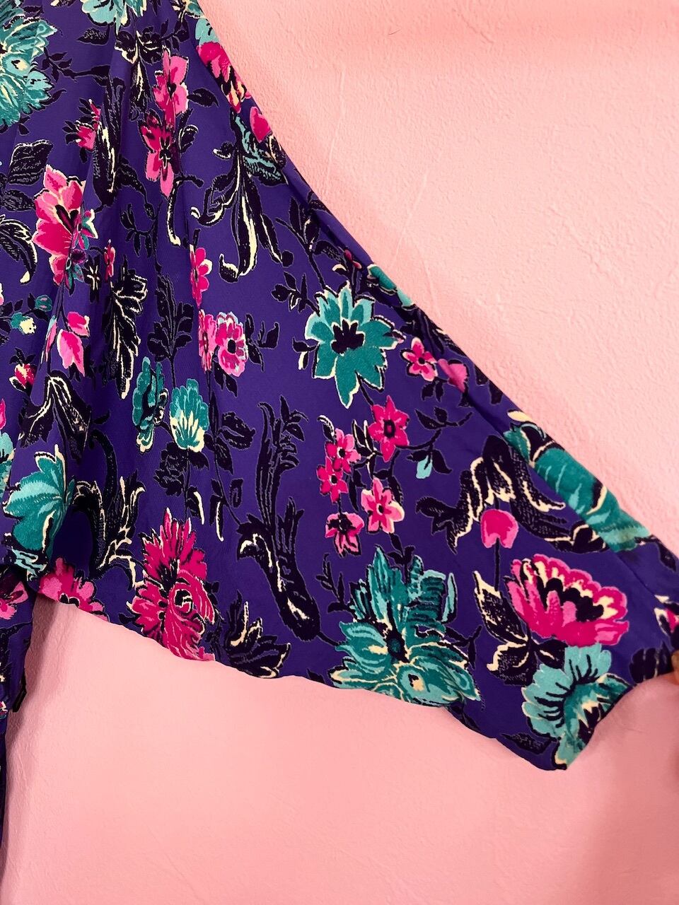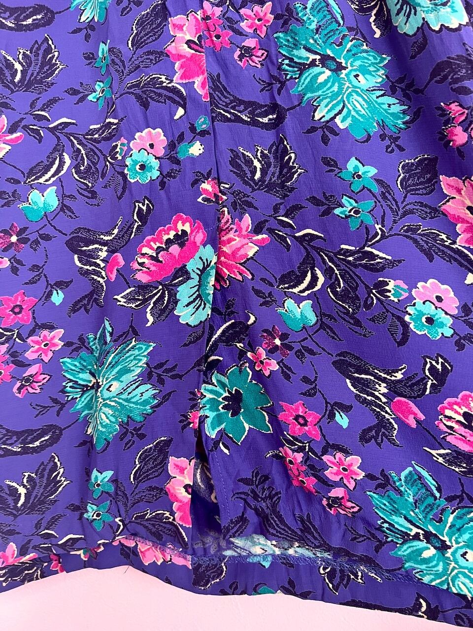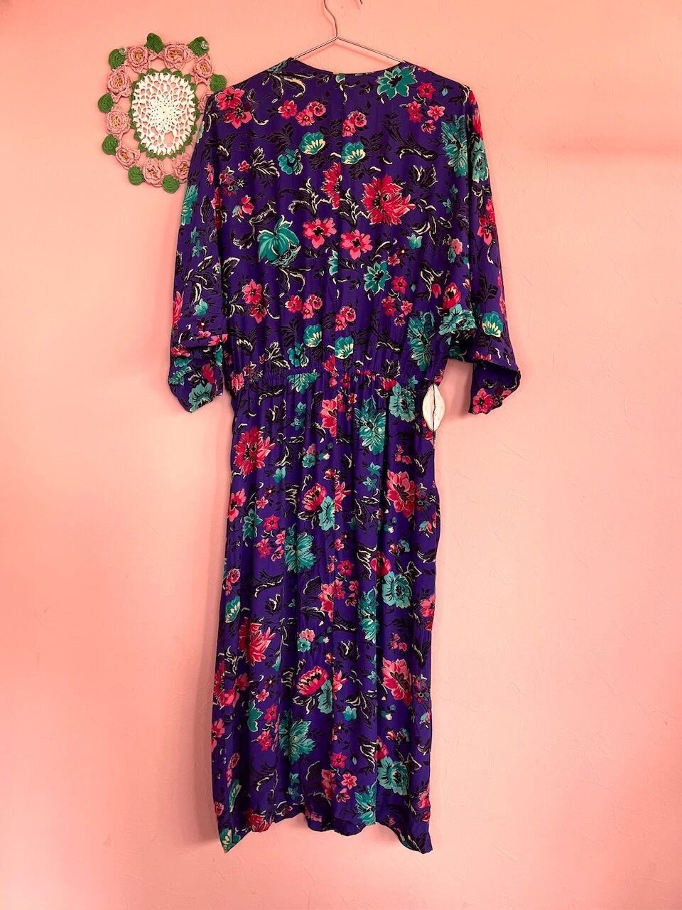 パープルカラーにピンクのお花柄が80sらしいワンピース。ドルマンスリーブでゆるっとしたシルエットが可愛いです♡