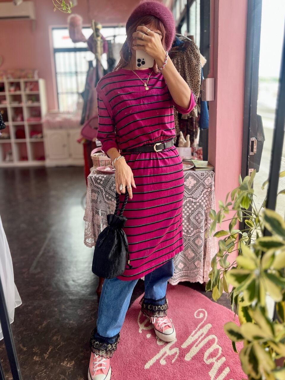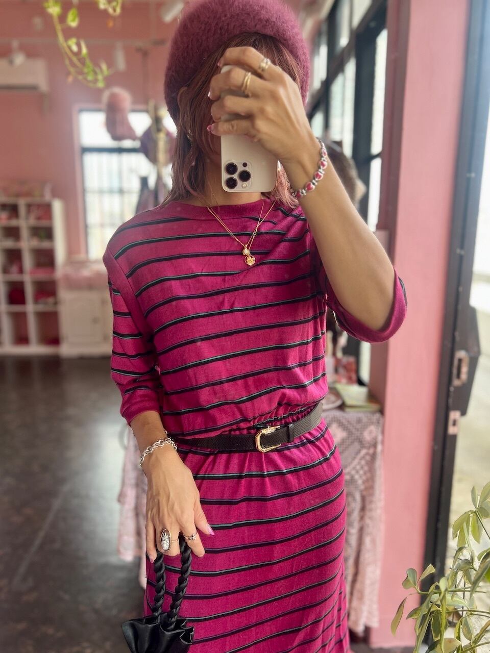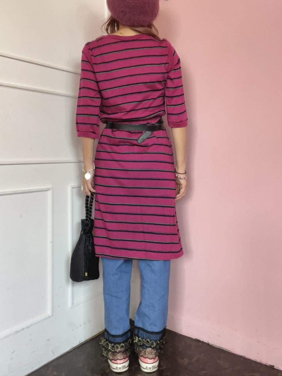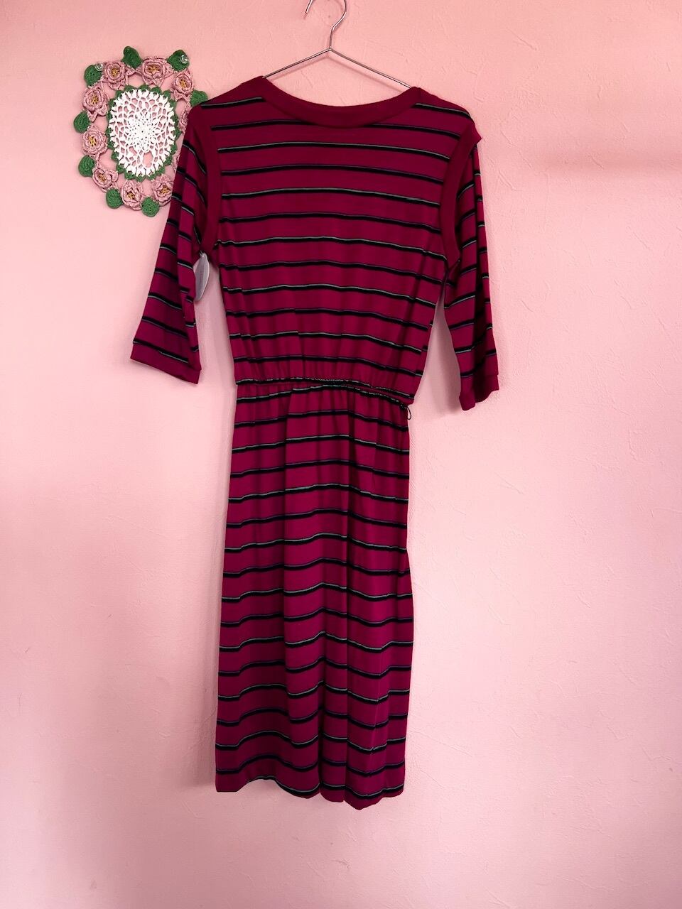 80sらしいローズピンクのボーダーワンピース。