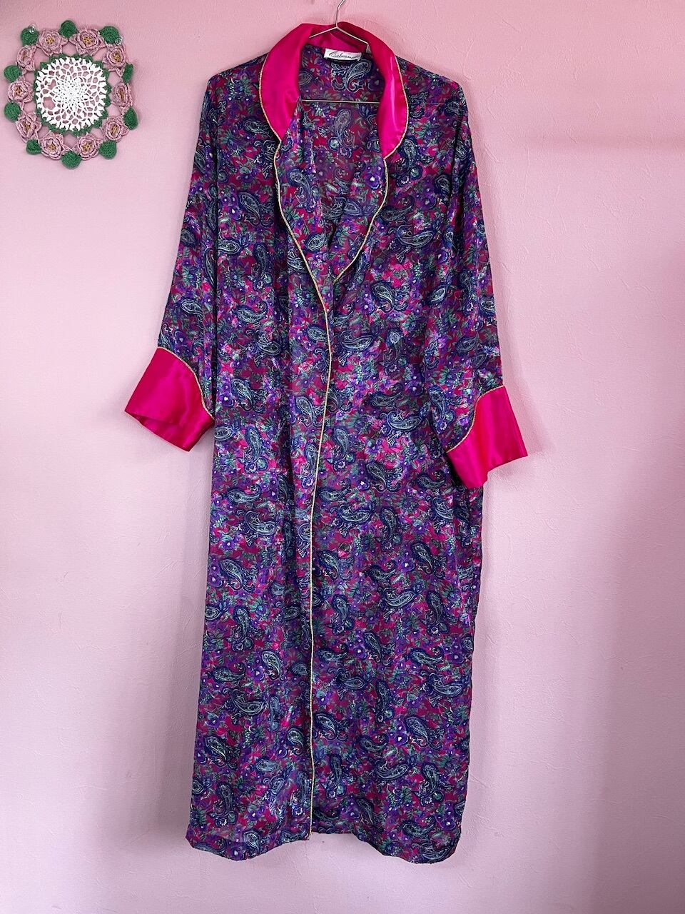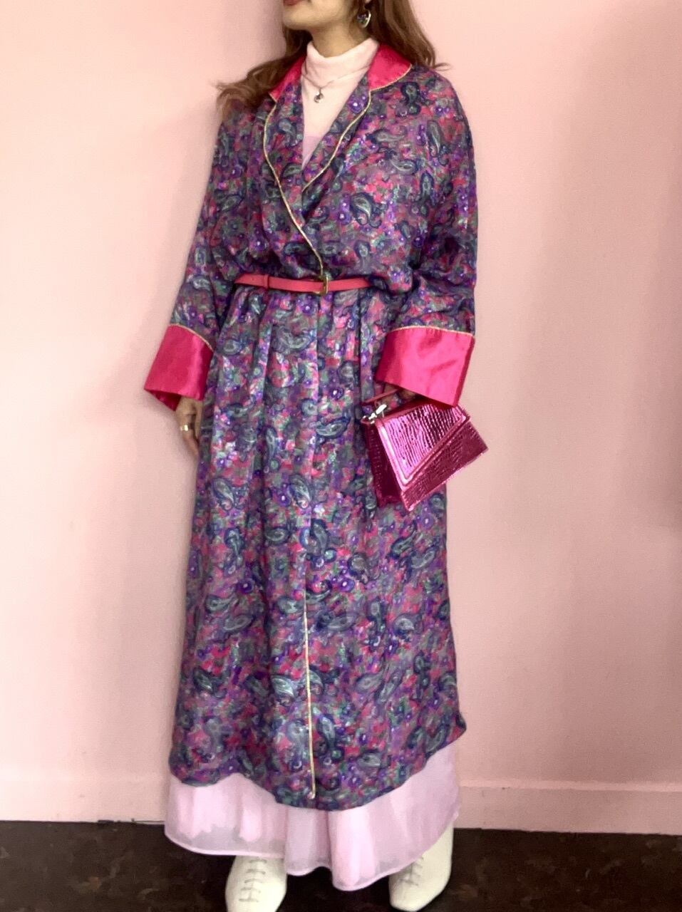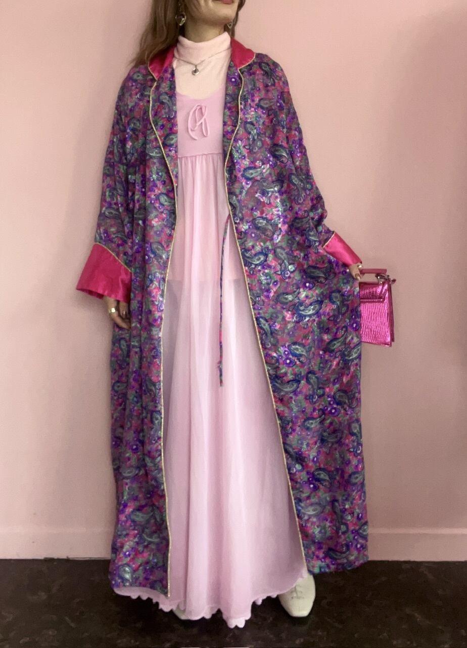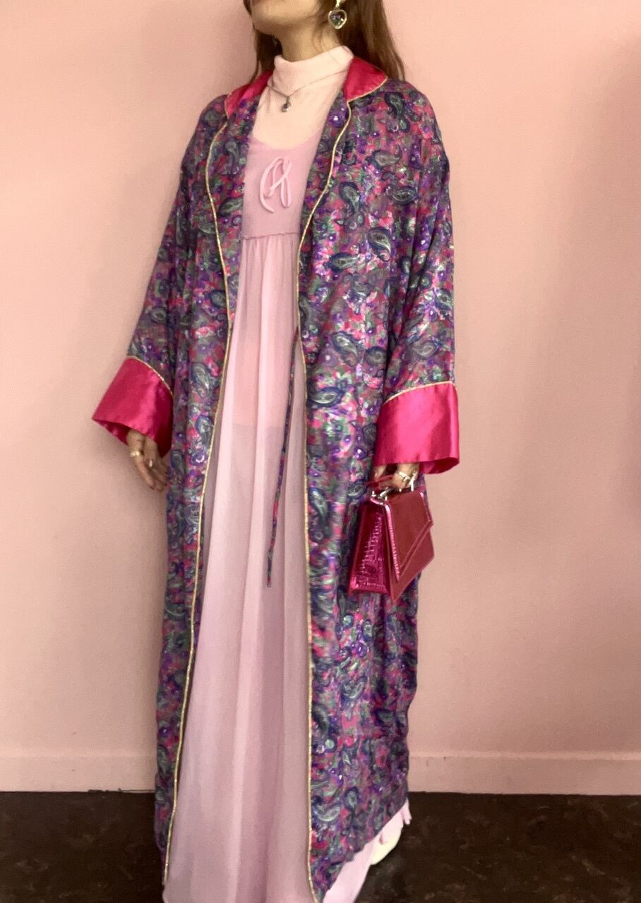 袖と襟の部分は光沢感ある生地で、ゴールドのパイピングが施されていて高級感あるガウンです。