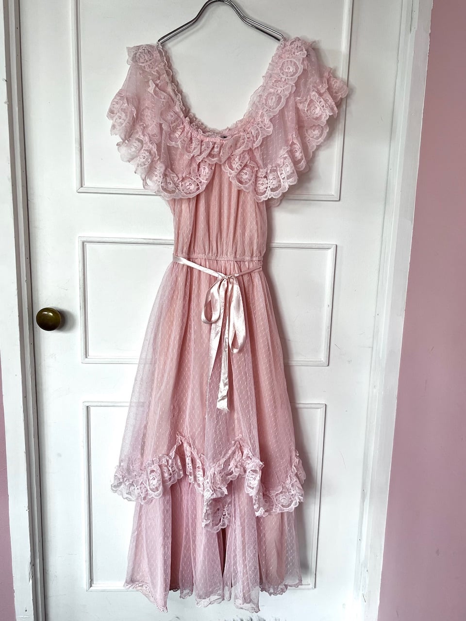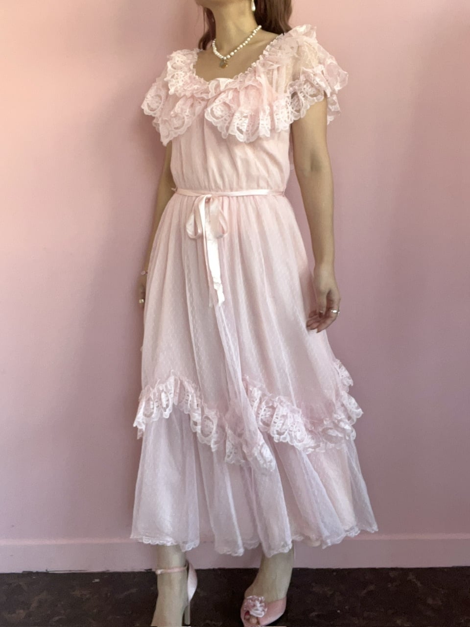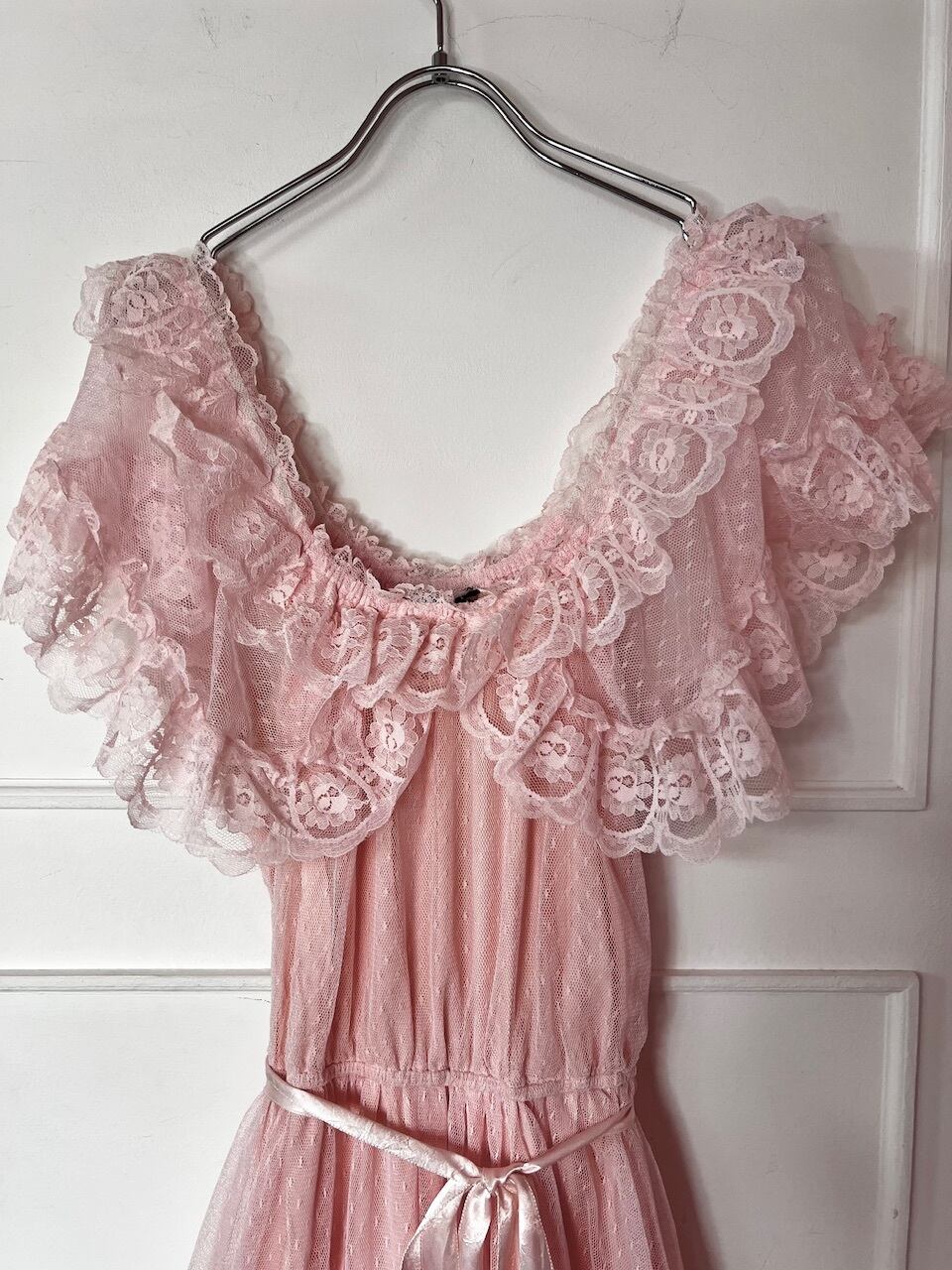 ウェーブされたレースや胸元のレースが可愛いらしく、1着は持っていたいヴィンテージドレスです♡