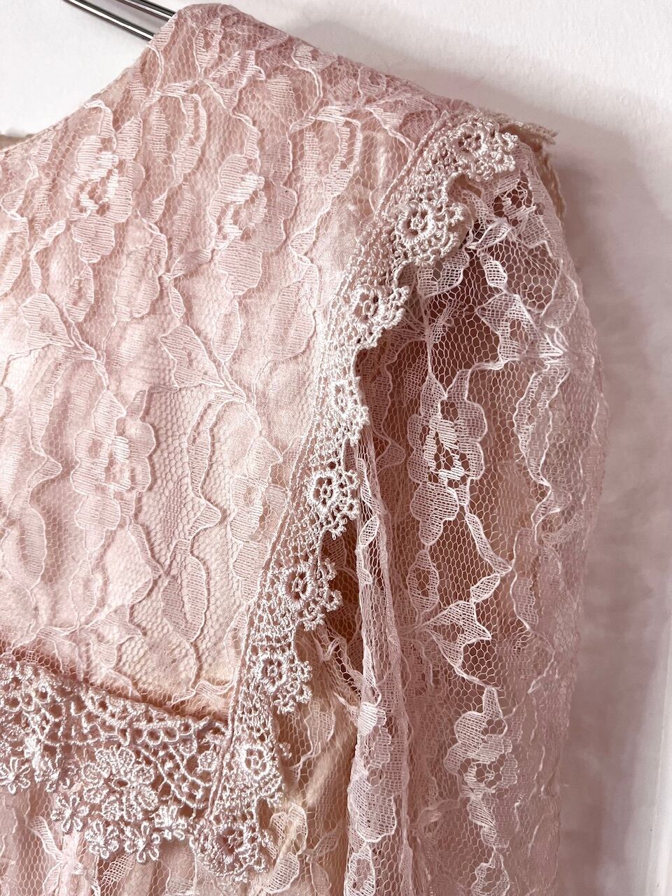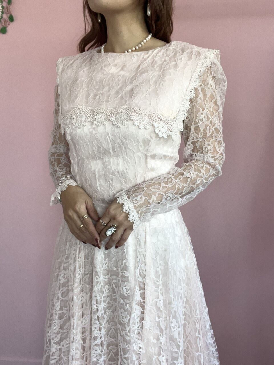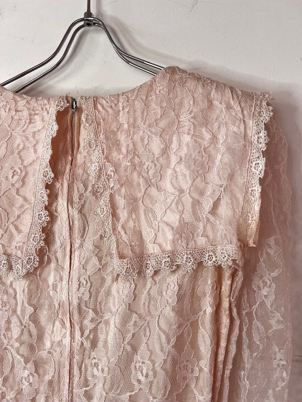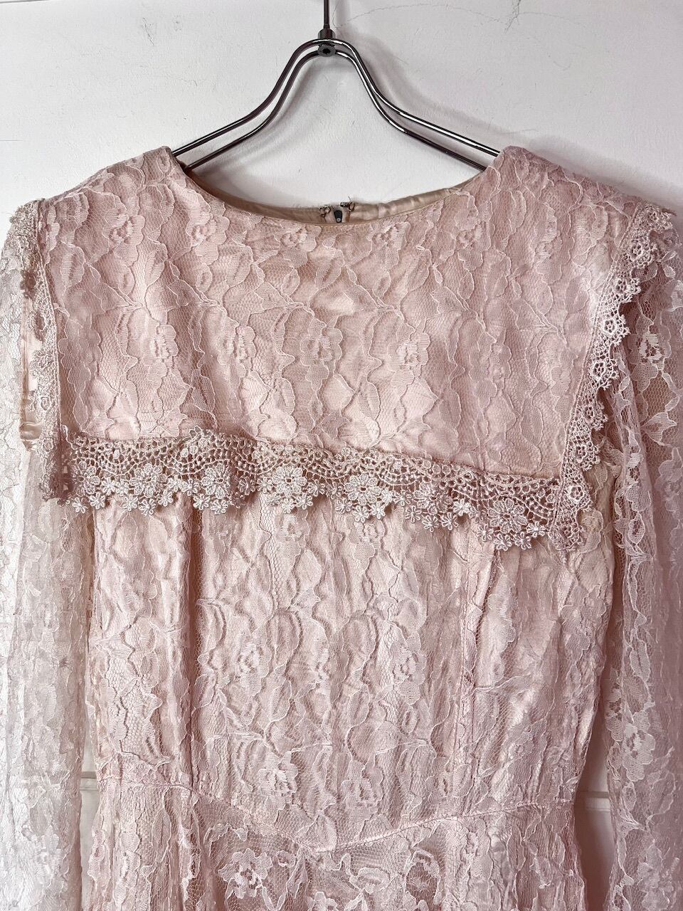 袖が透けるレースになっていて、ドリーミーなペールピンクの総レースドレス。