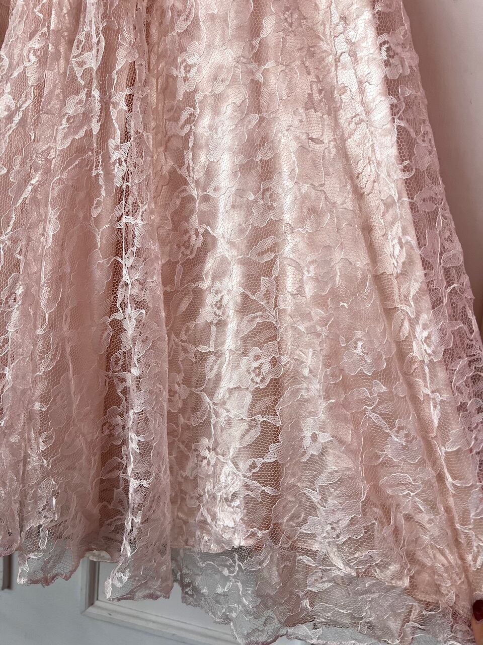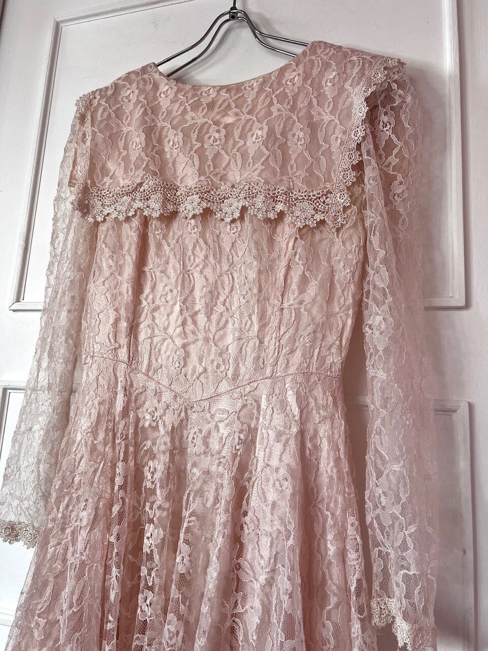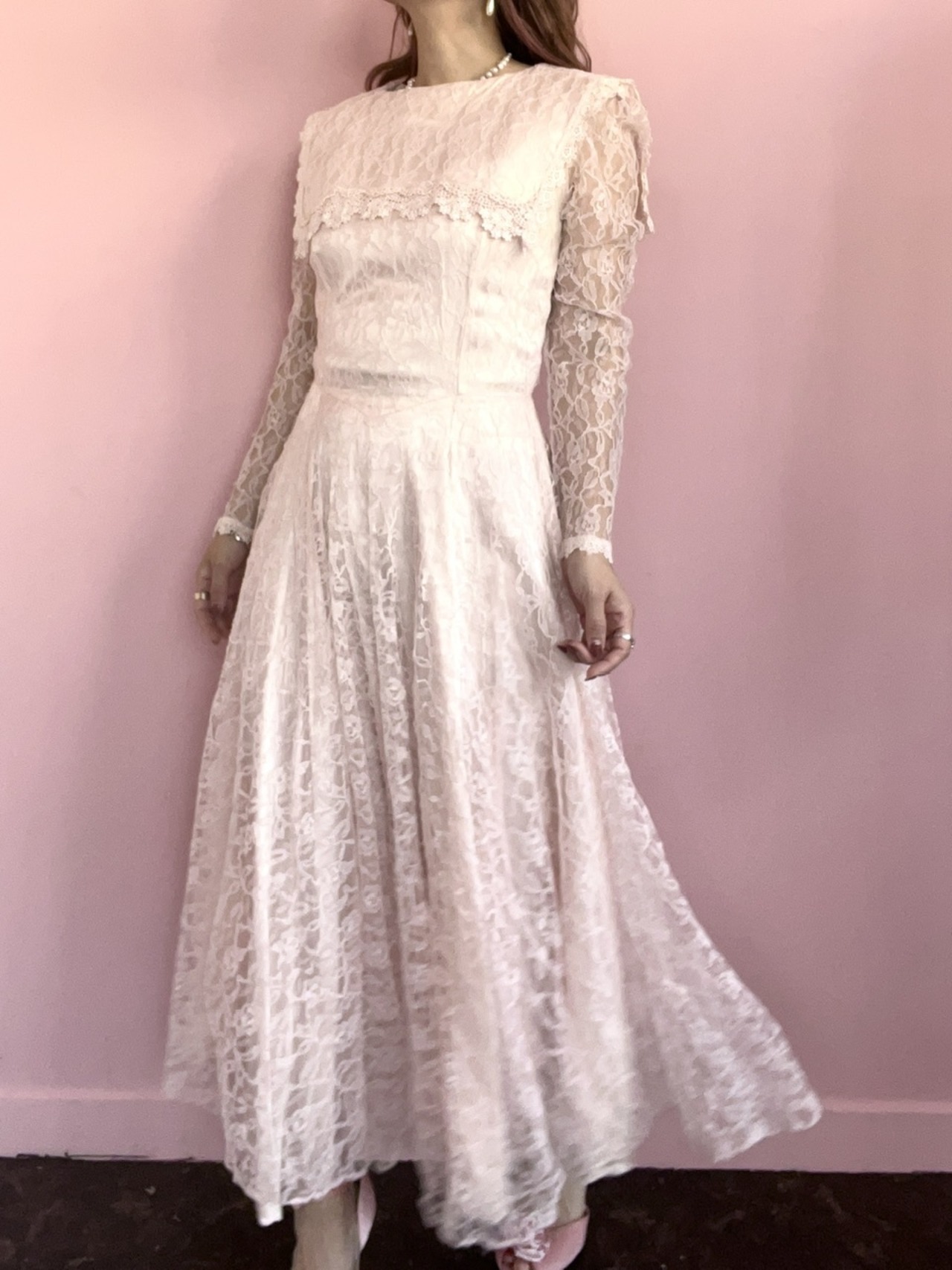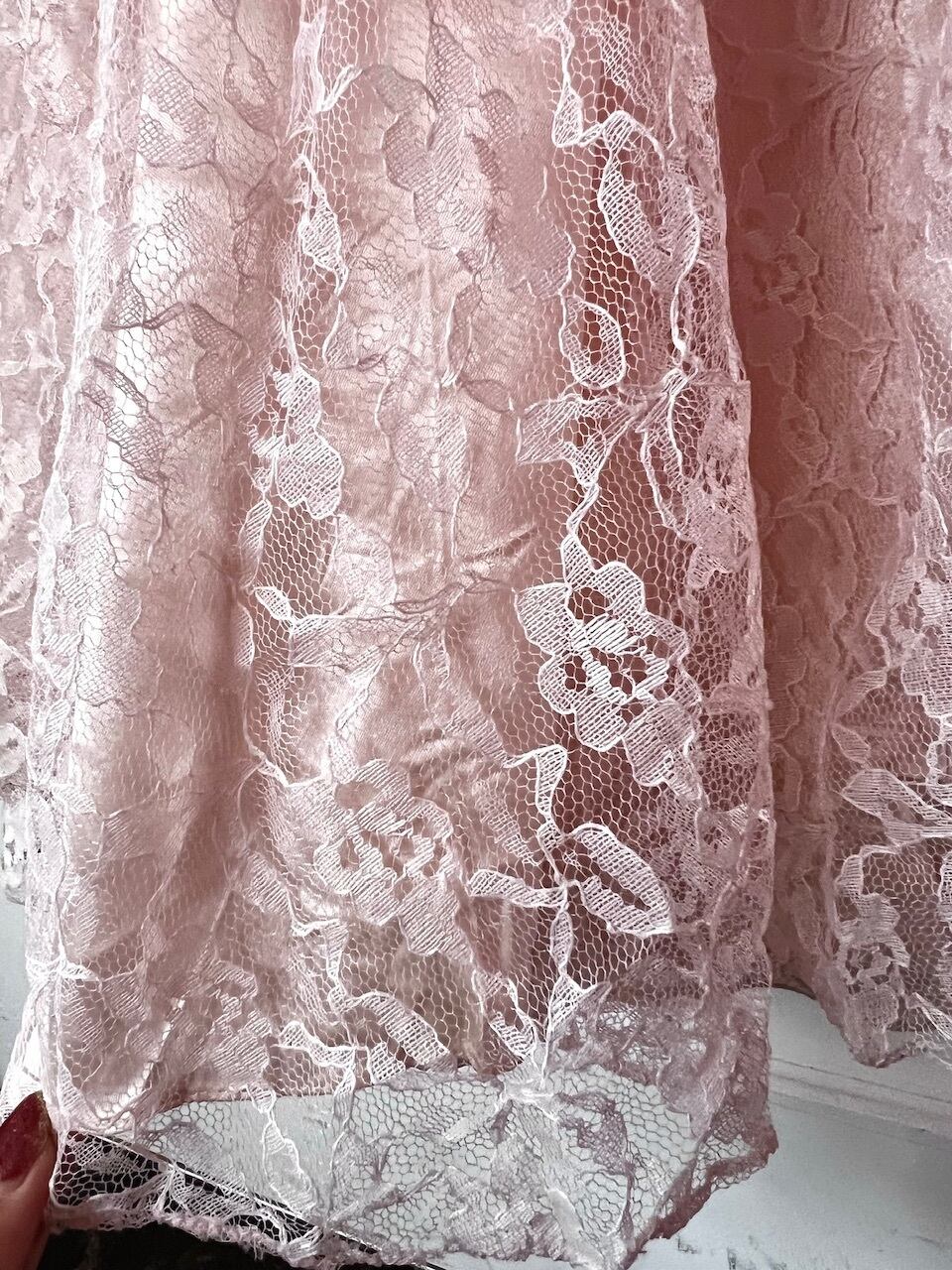 袖が透けるレースになっていて、ドリーミーなペールピンクの総レースドレス。
