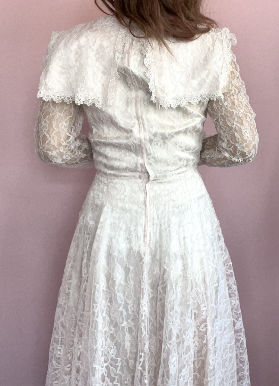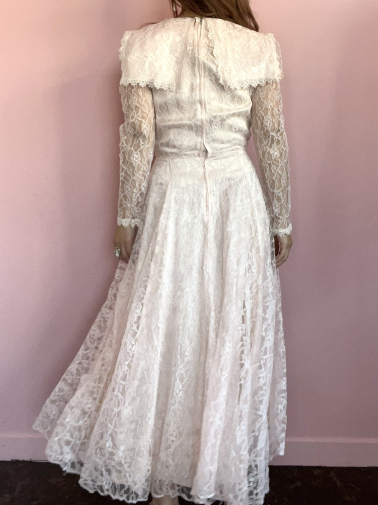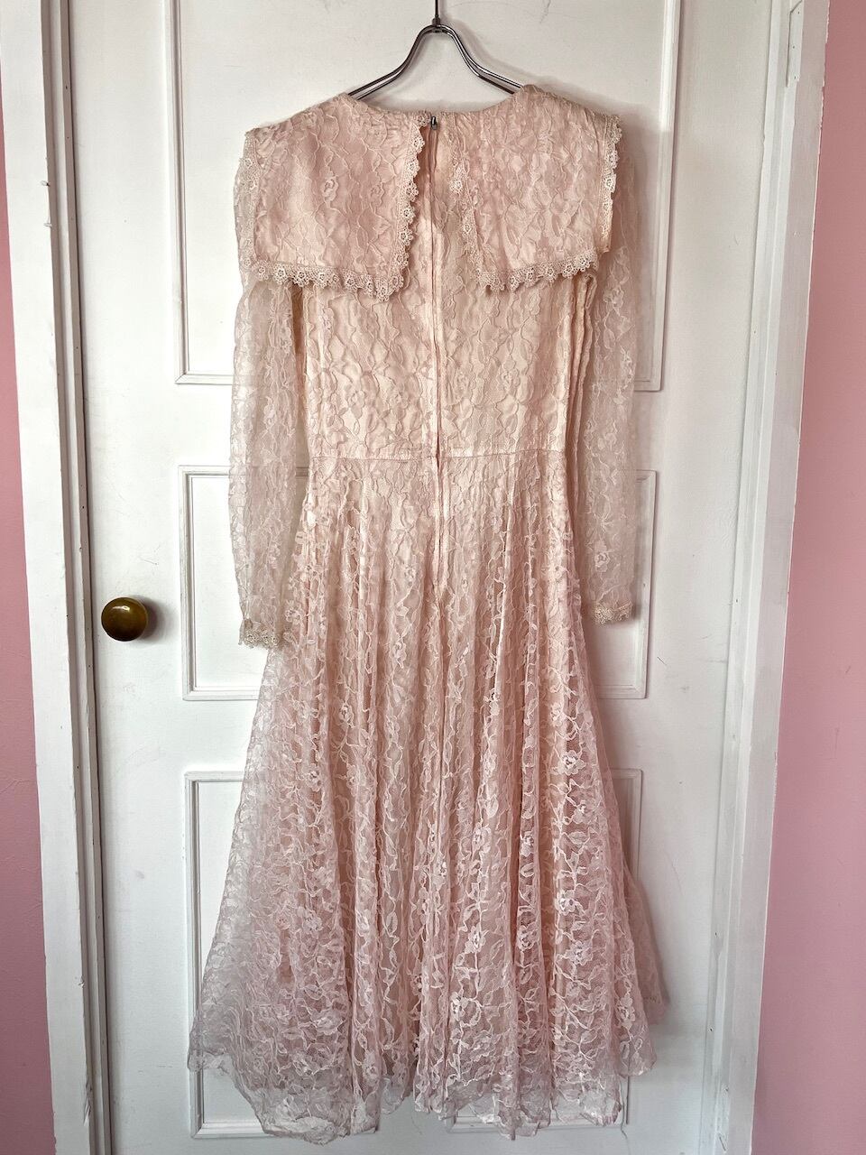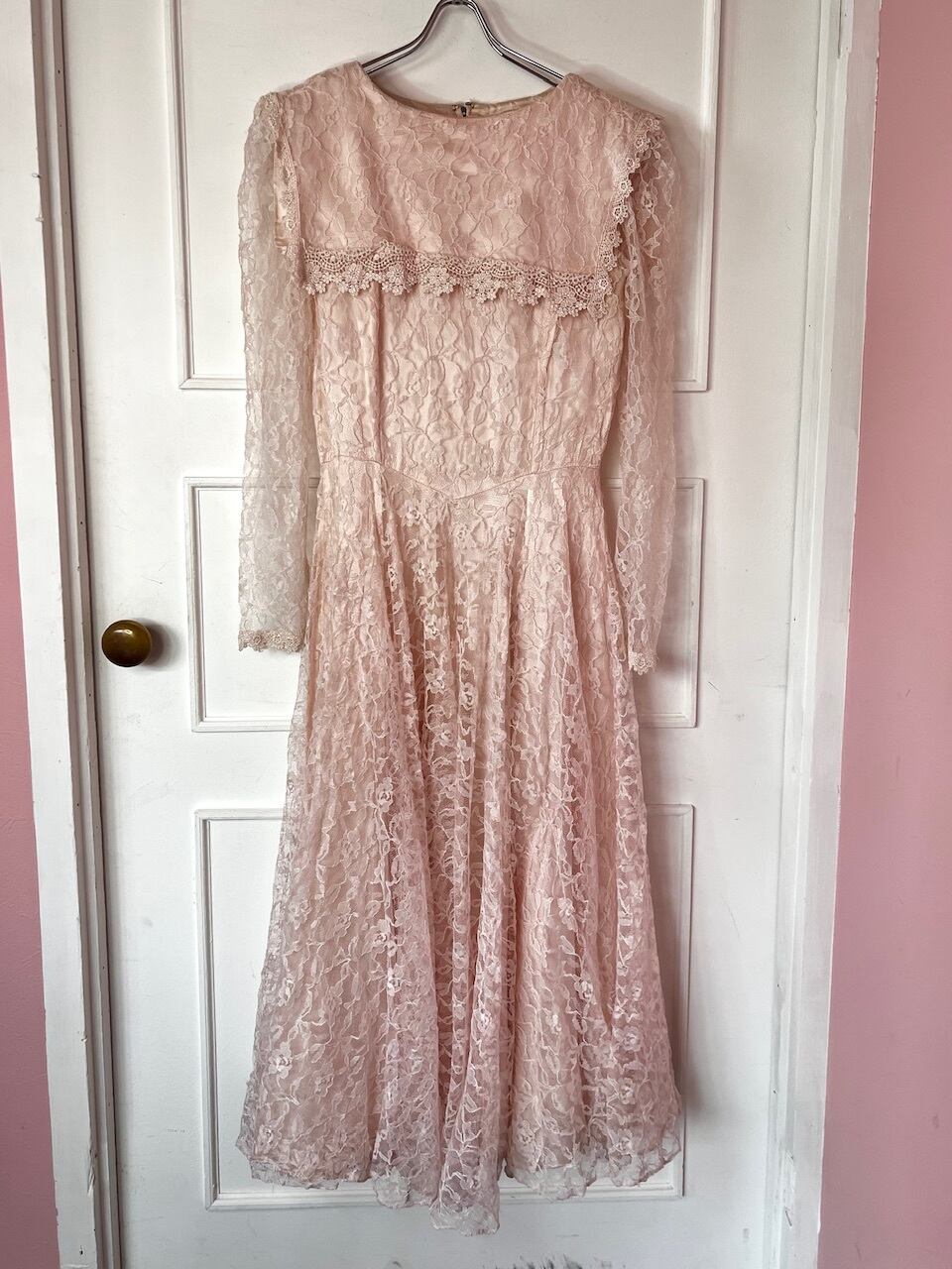 袖が透けるレースになっていて、ドリーミーなペールピンクの総レースドレス。