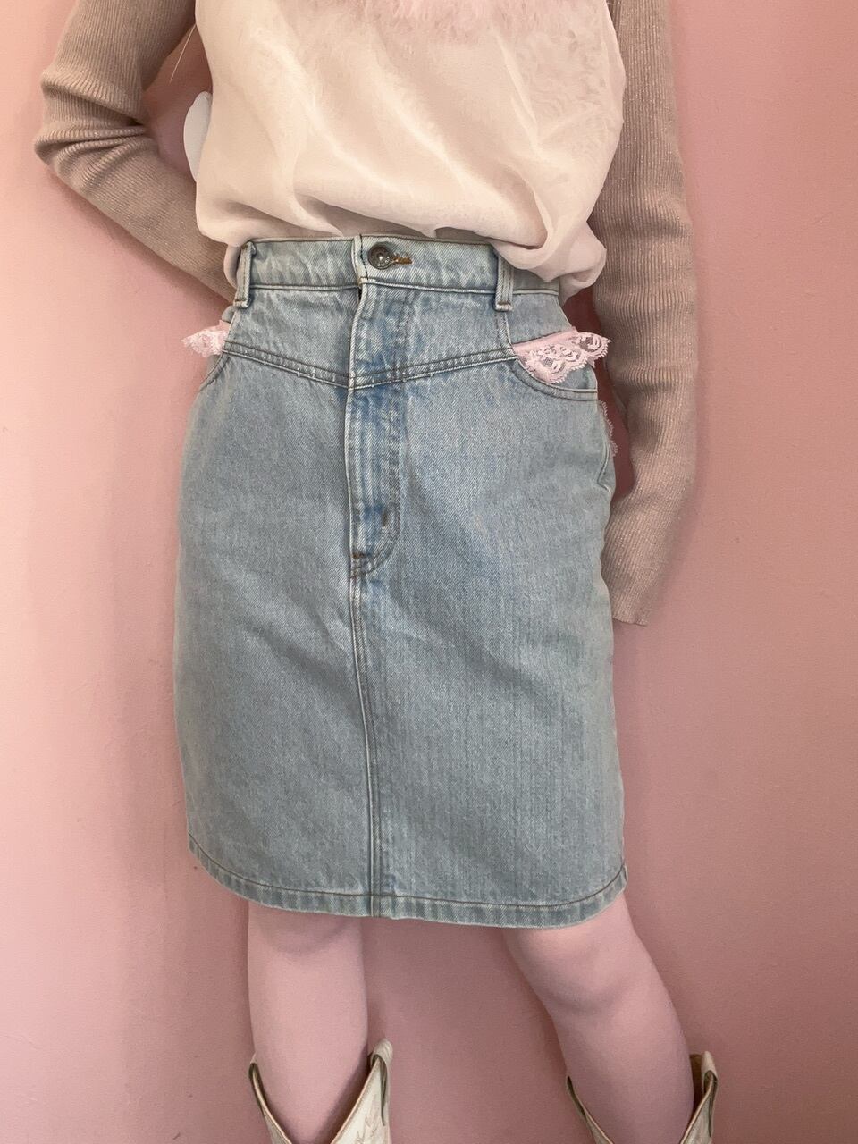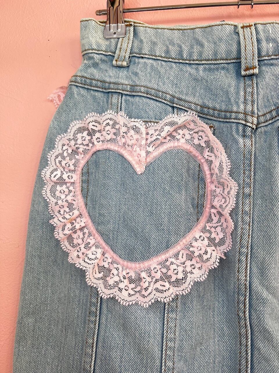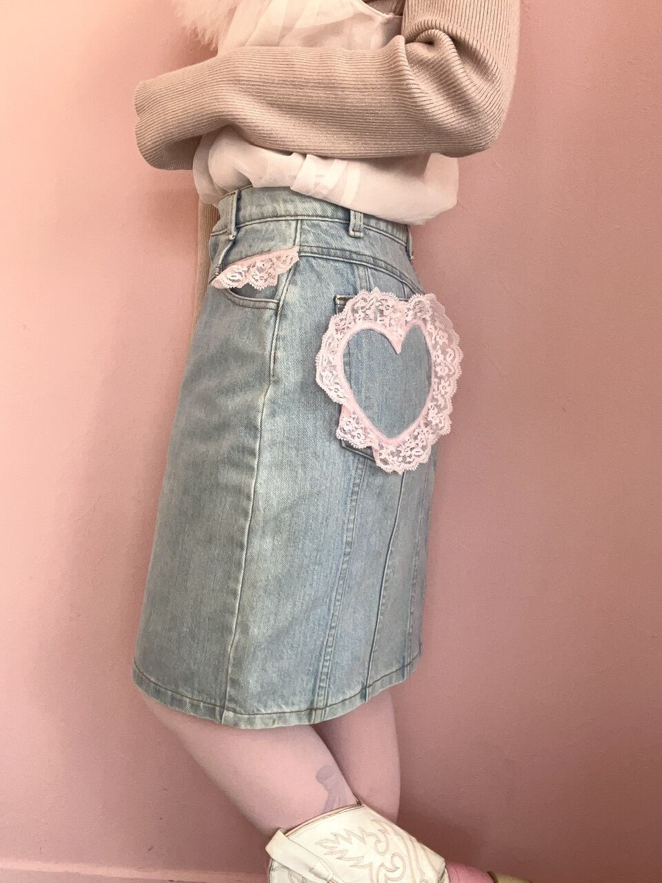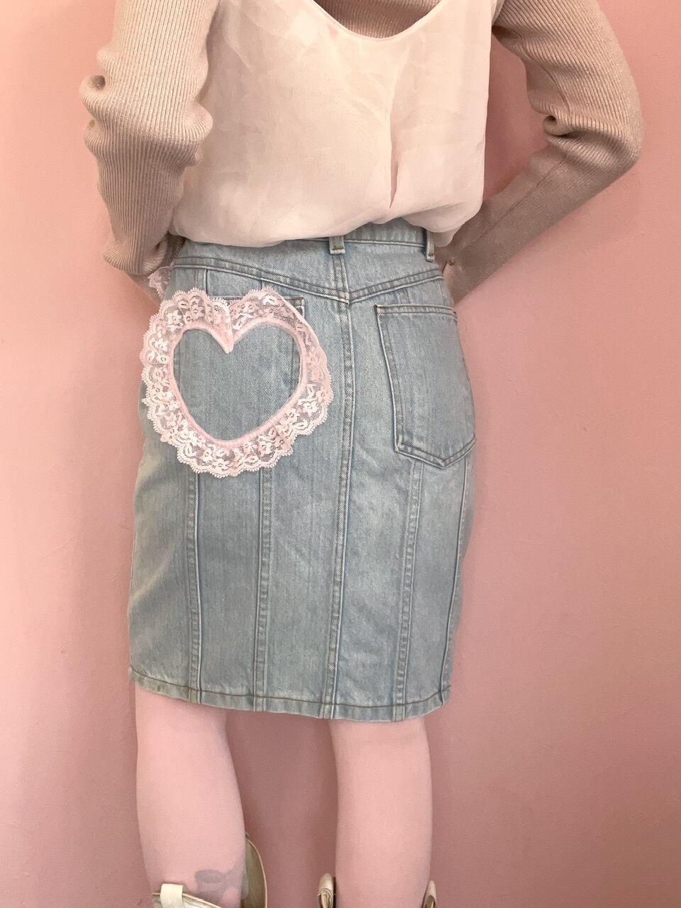 デニムタイトスカートのポケットに、ヴィンテージレースでハートが描かれているデザインのスカートです♡