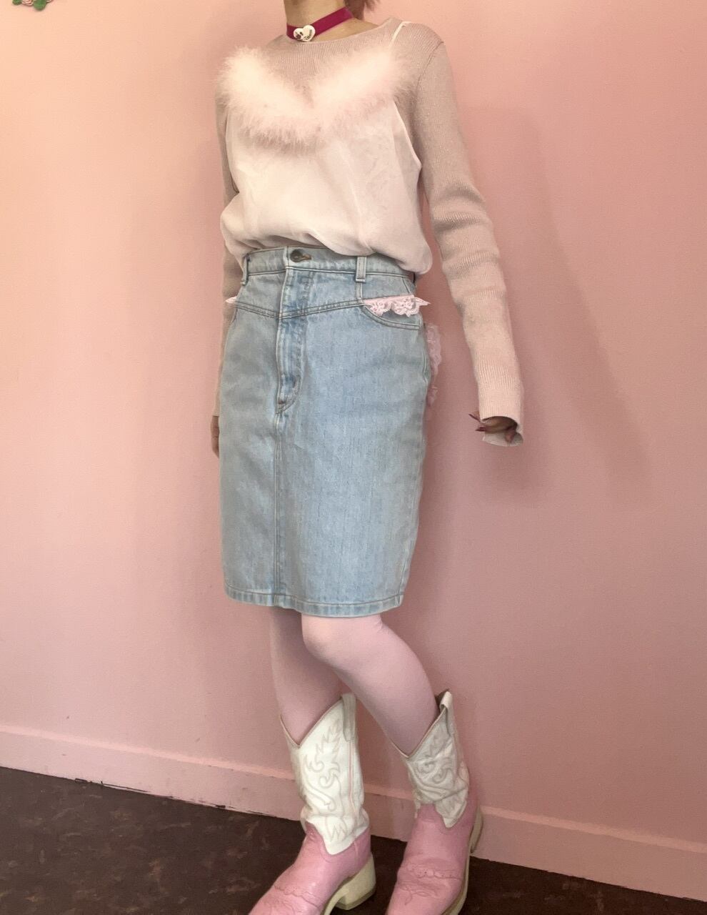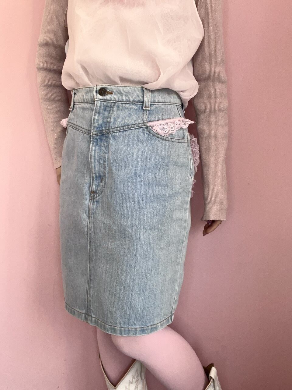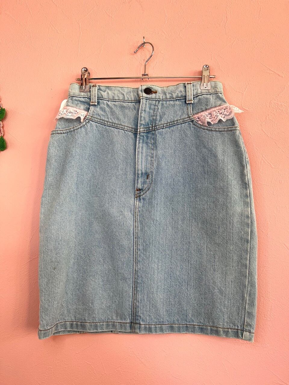 デニムタイトスカートのポケットに、ヴィンテージレースでハートが描かれているデザインのスカートです♡