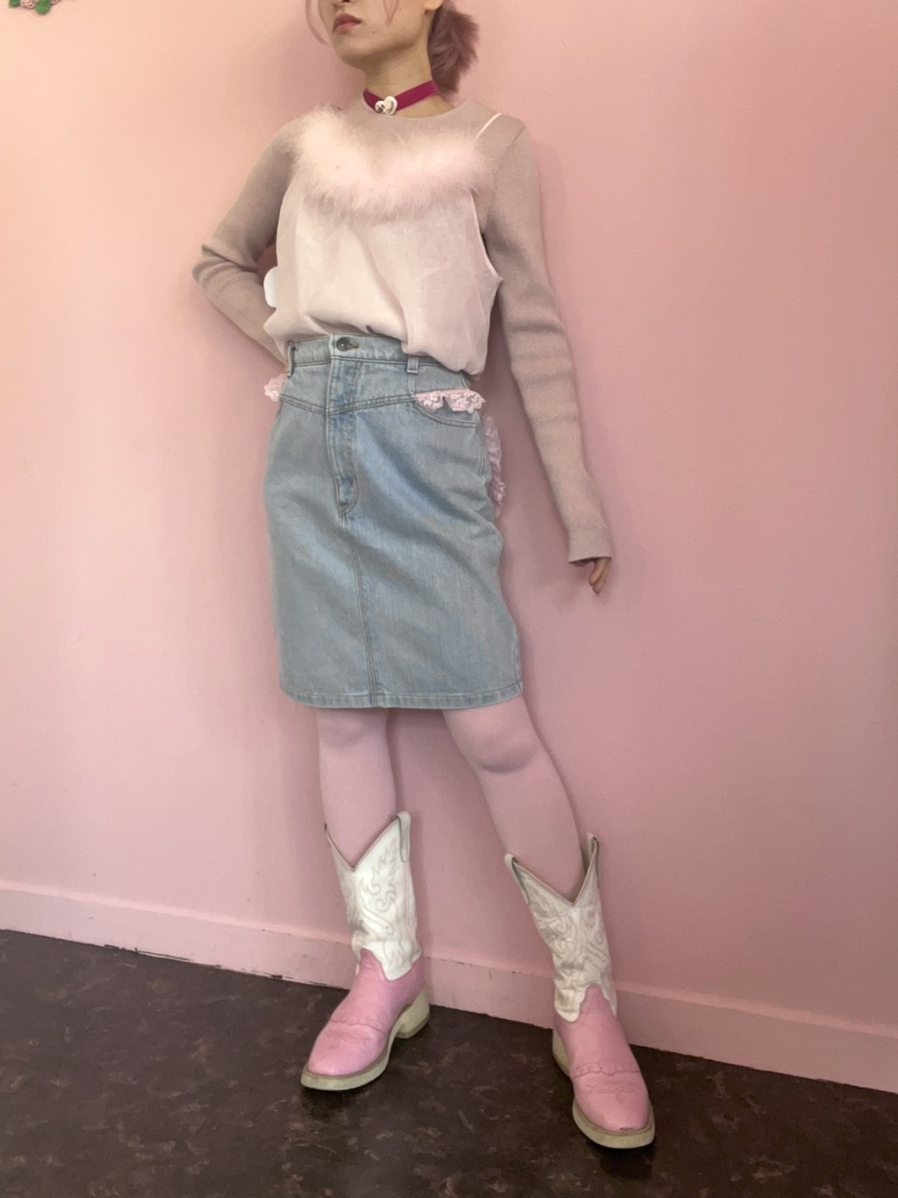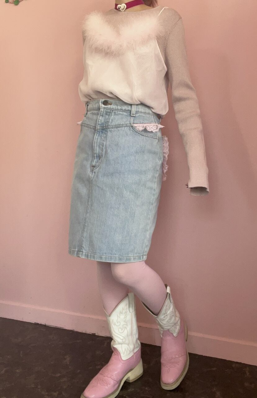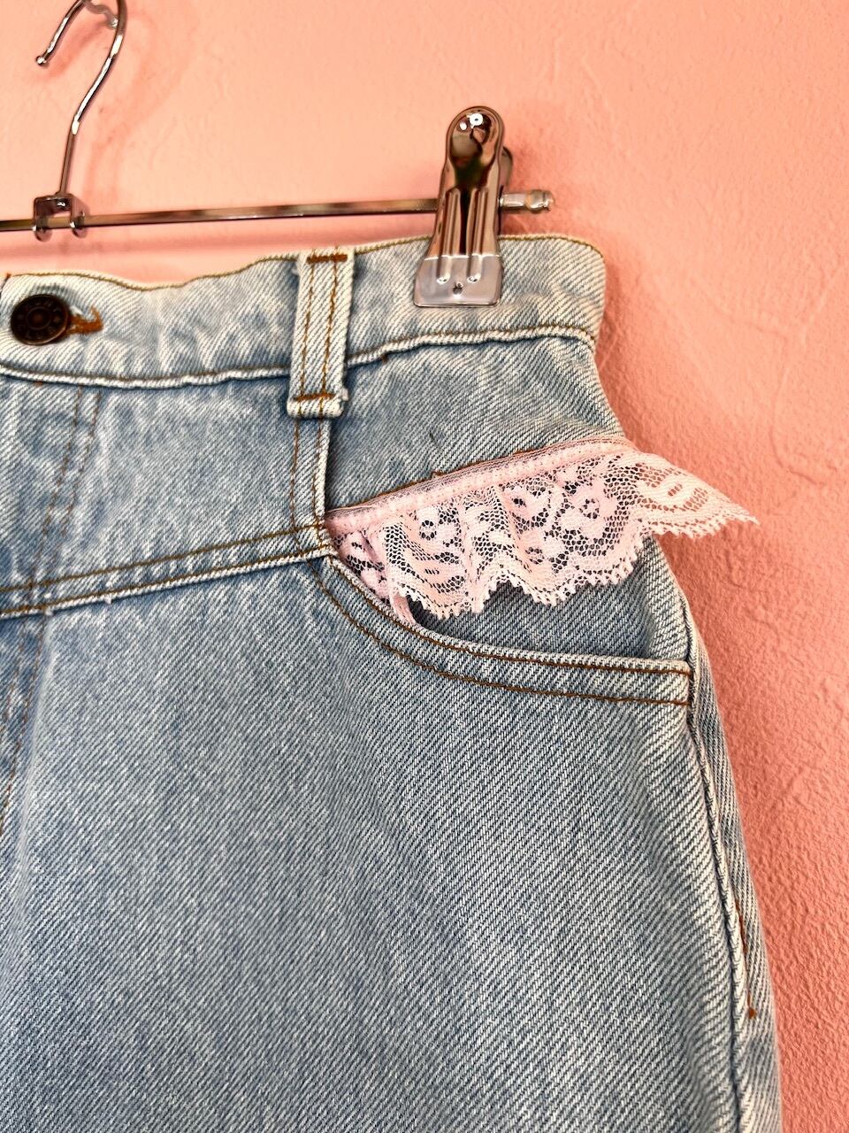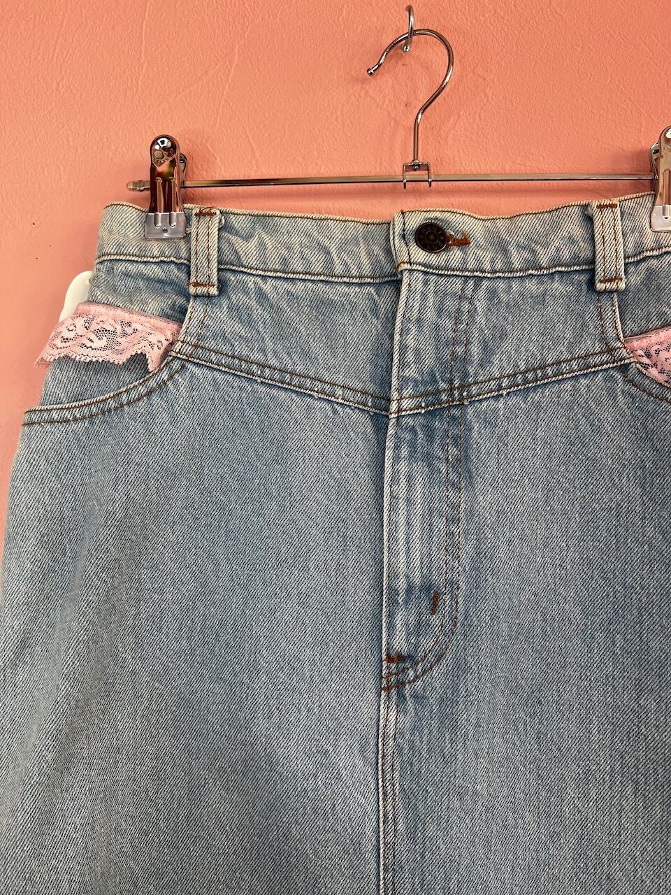 デニムタイトスカートのポケットに、ヴィンテージレースでハートが描かれているデザインのスカートです♡